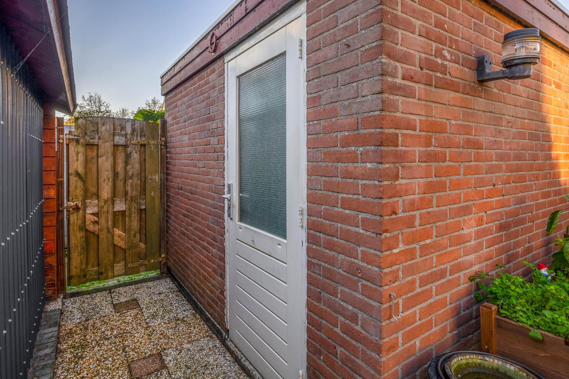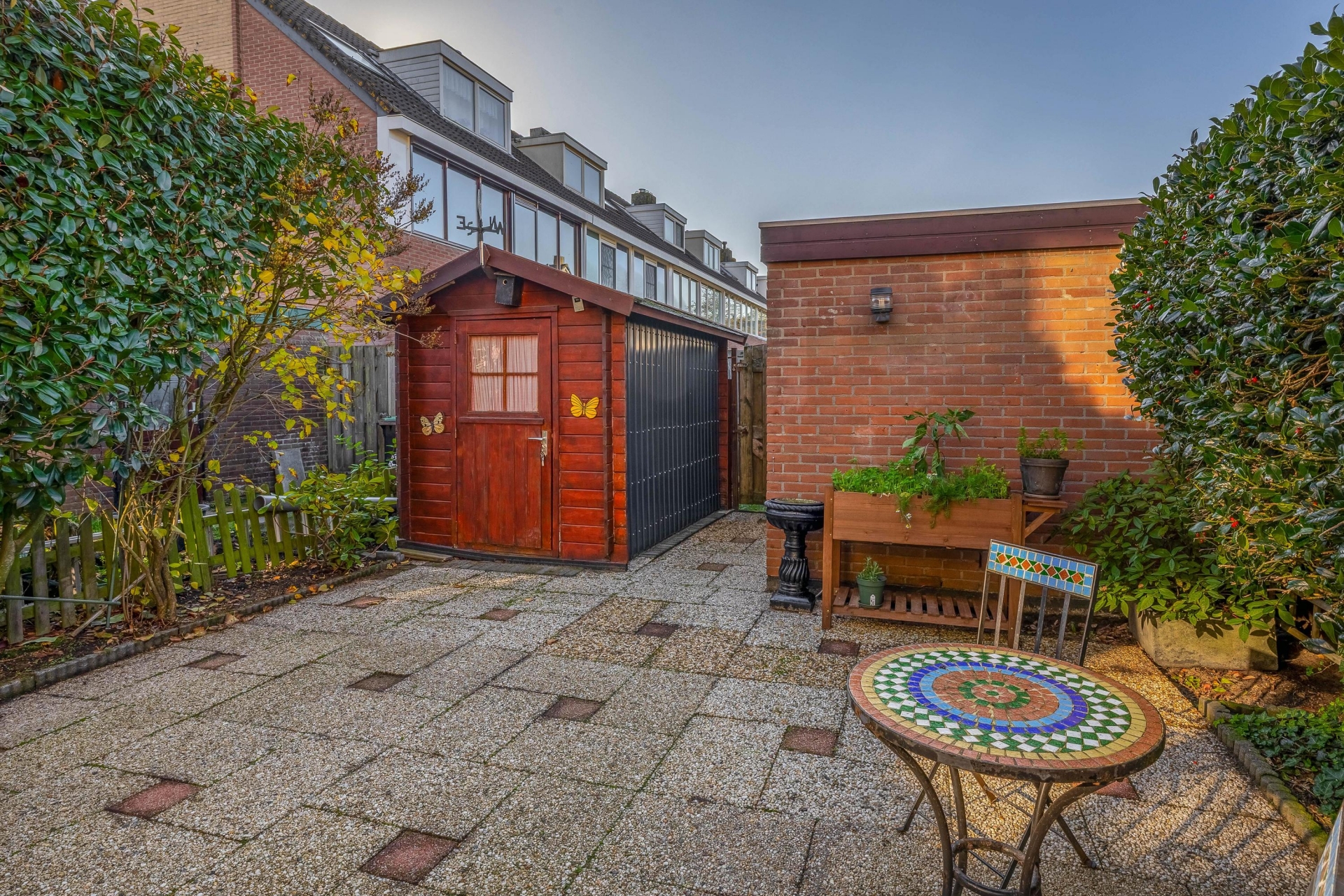 - Zonnige achtertuin met achterom, stenen én houten berging;