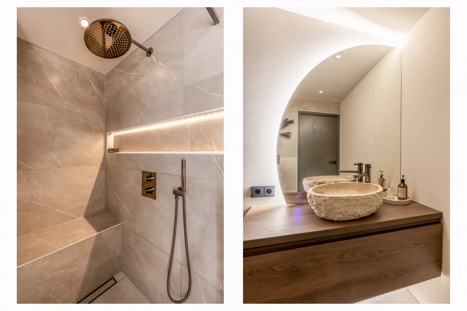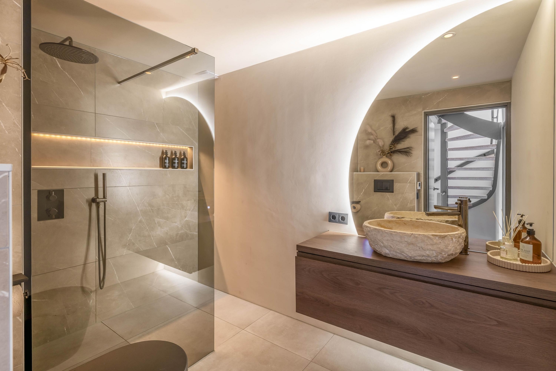 De badkamer is eind 2024 volledig nieuw gerealiseerd en afgewerkt met hoogwaardige materialen. De inloopdouche met bankje, het op maat gemaakte wastafelmeubel, sfeervolle indirecte verlichting en vloerverwarming geven het geheel een luxe hotelgevoel. Alles is tot in detail verzorgd, van tegelwerk tot kranen, waardoor dit een plek is waar je echt tot rust komt.
