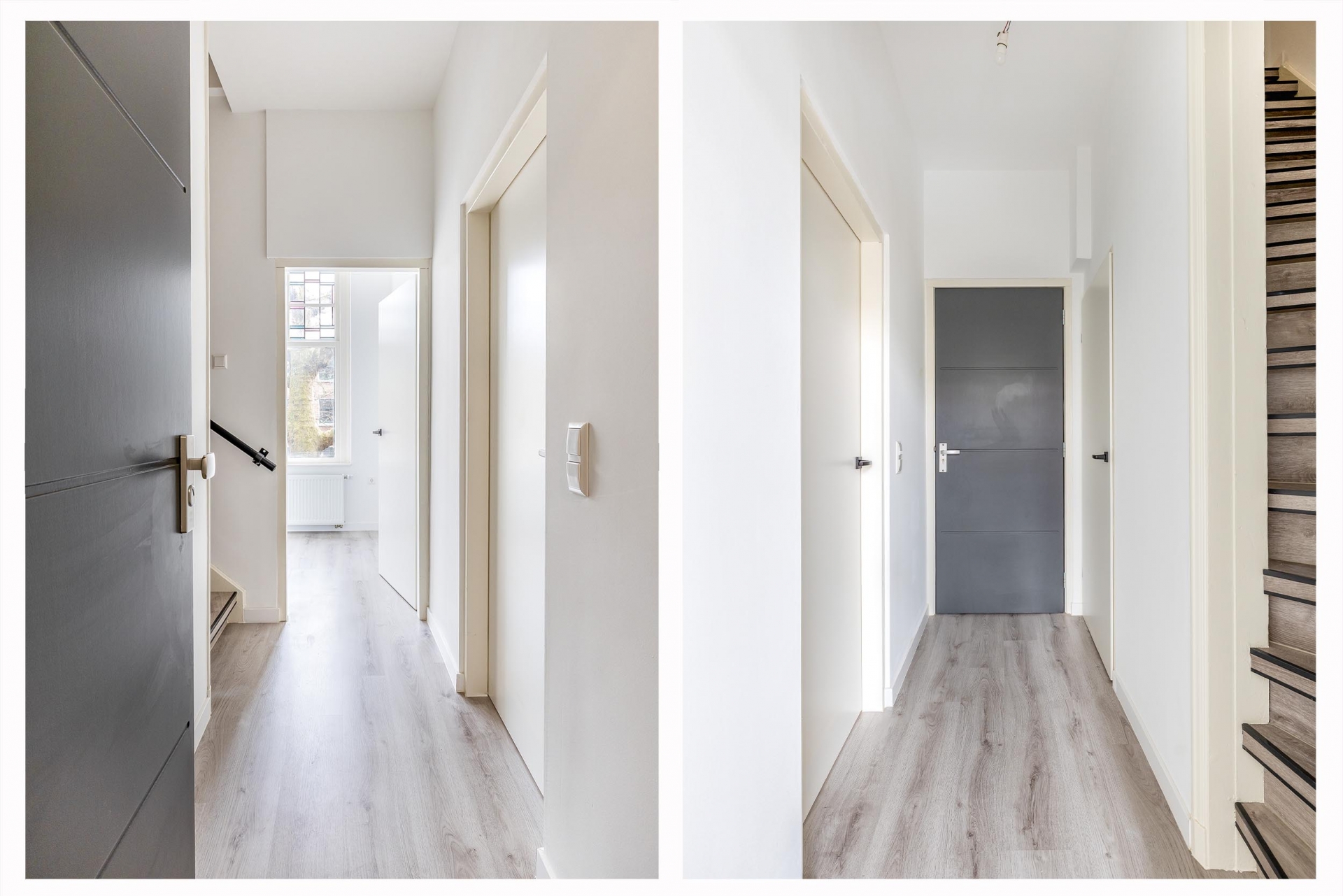 Je komt binnen op de tweede verdieping via een gezamenlijke entree met originele terrazzo vloer. De centrale hal geeft toegang tot de woonkamer, keuken, toilet, slaapkamer én de trap naar boven.