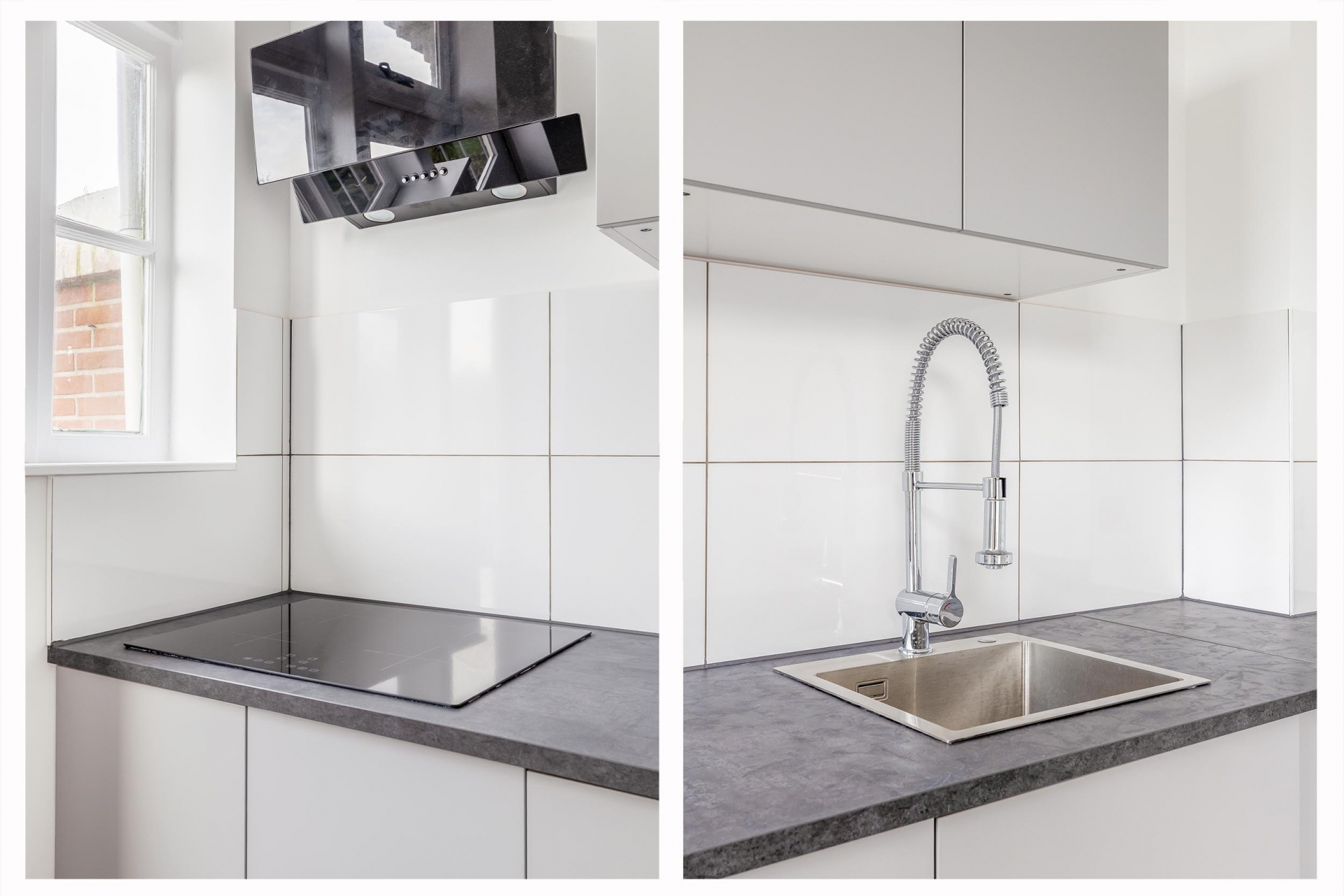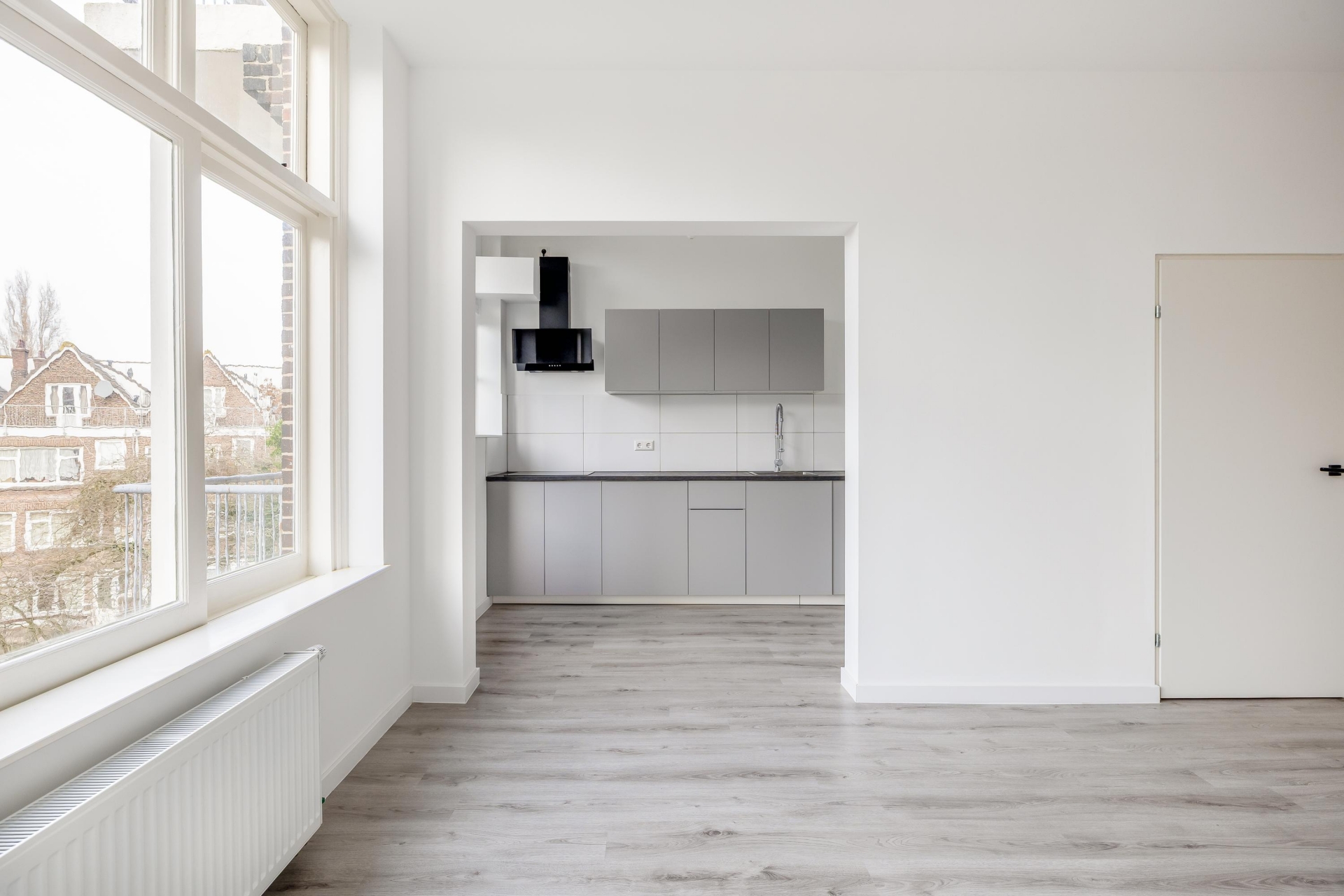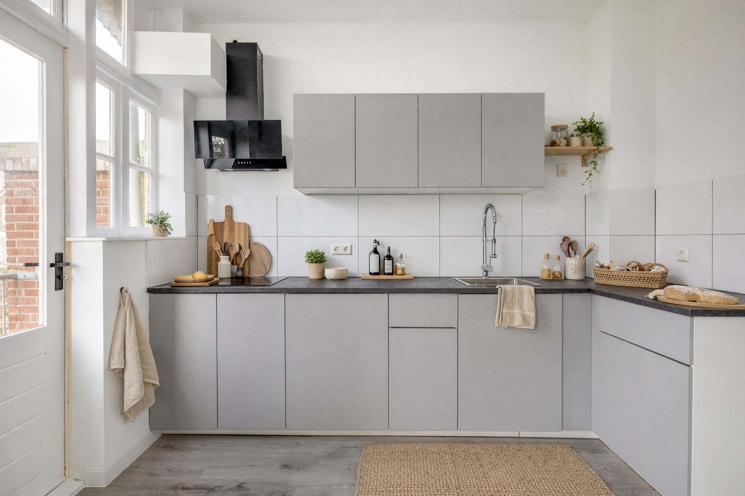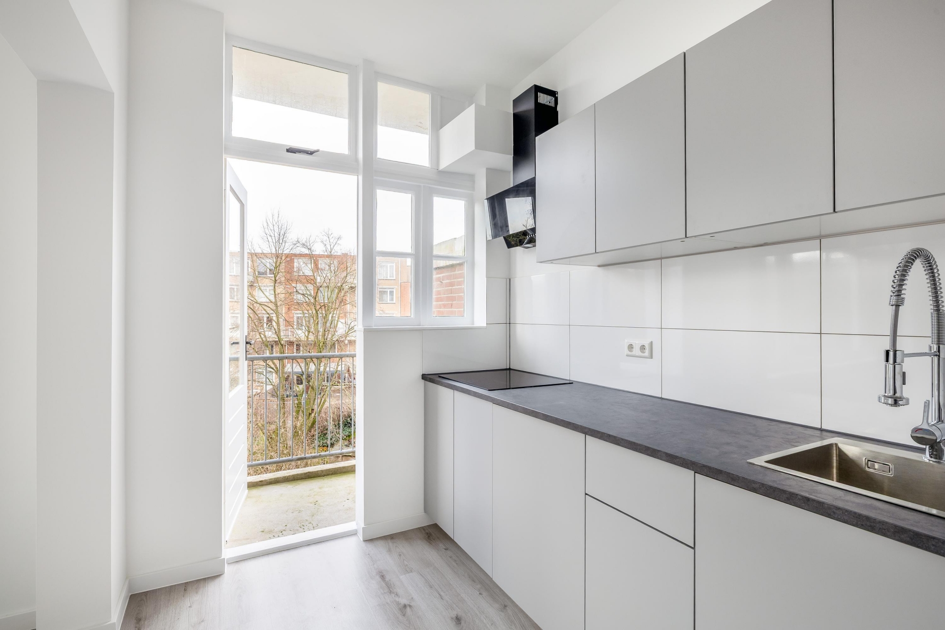 Aan de achterzijde van de woning ligt de open keuken. Een verzorgde en moderne keuken in hoekopstelling met inductiekookplaat, afzuigkap, ruimte voor koel-vriescombinatie en voldoende kastjes. Vanuit de keuken stap je zo het balkon op, waar je vanaf halverwege de middag tot in de avond van de zon geniet.