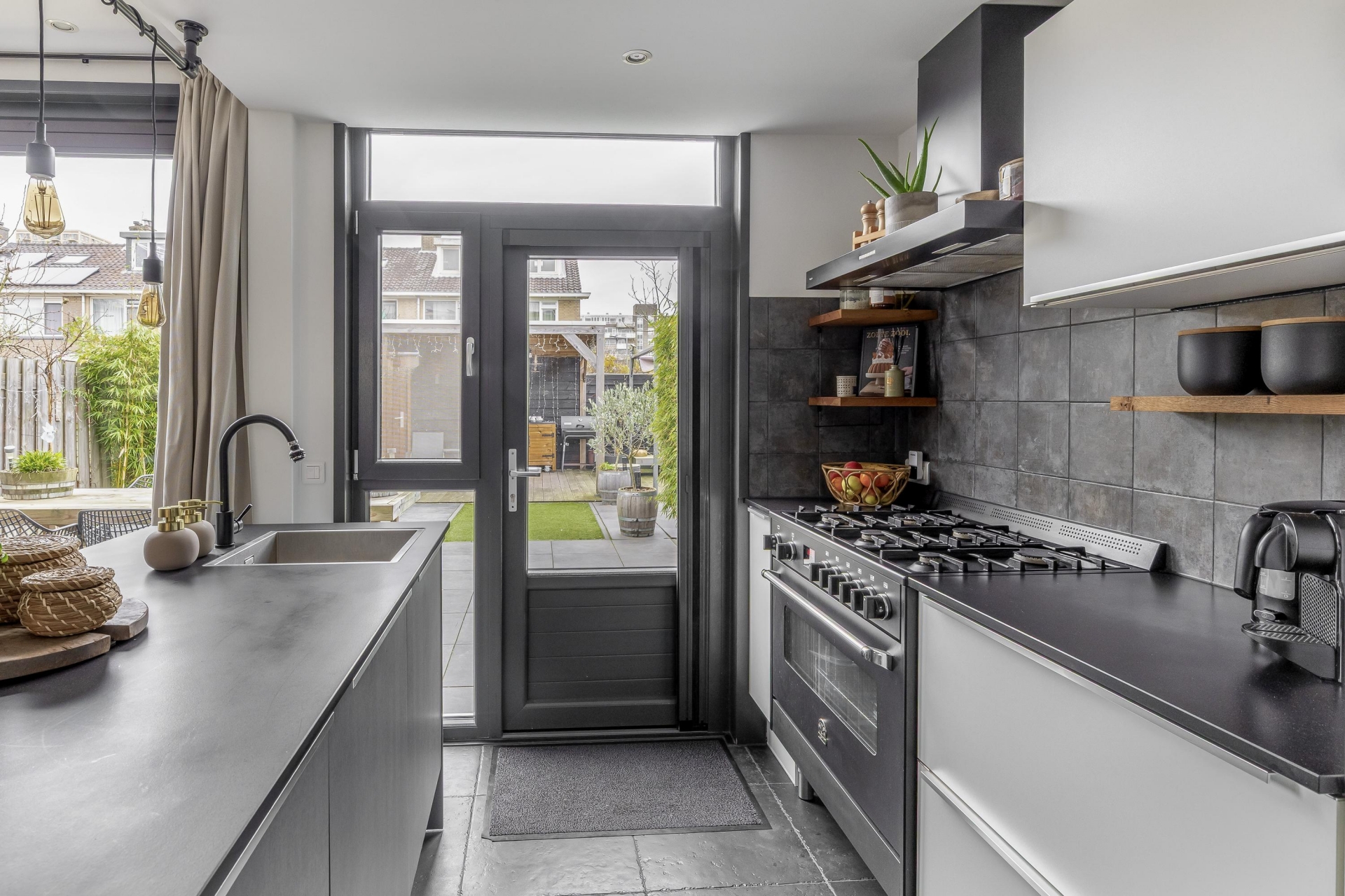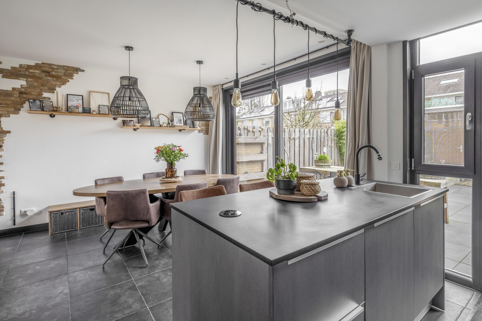 De begane grond is volledig ingericht op comfort en samenzijn. In de moderne open keuken, voorzien van strak keukenblok, spoeleiland met bar en veel werkruimte, bereid je moeiteloos een diner terwijl je gezellig contact houdt met het gezin of gasten. De keuken is volledig uitgerust met inbouwapparatuur en een schuifpui én tuindeur geven direct toegang tot de tuin.
