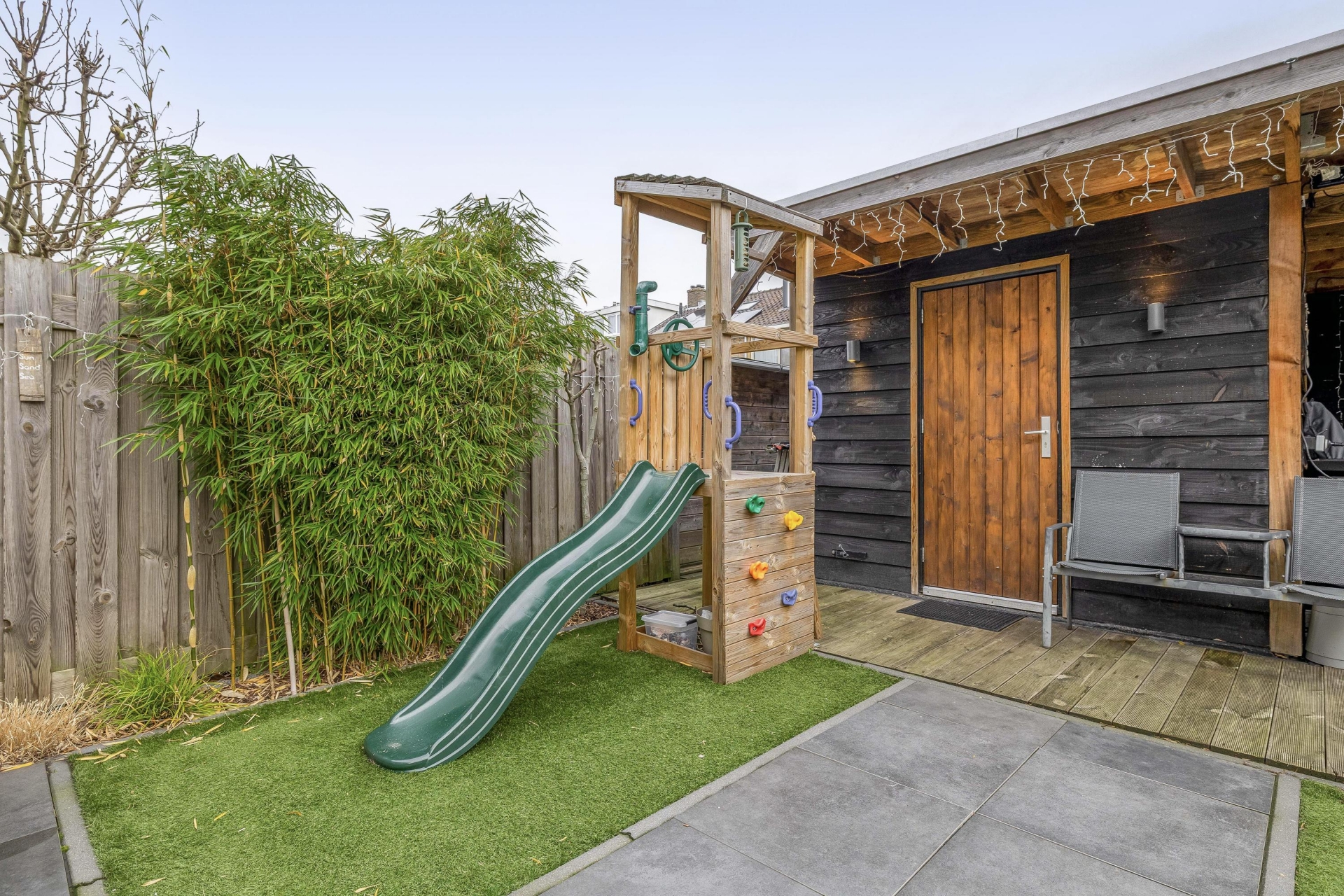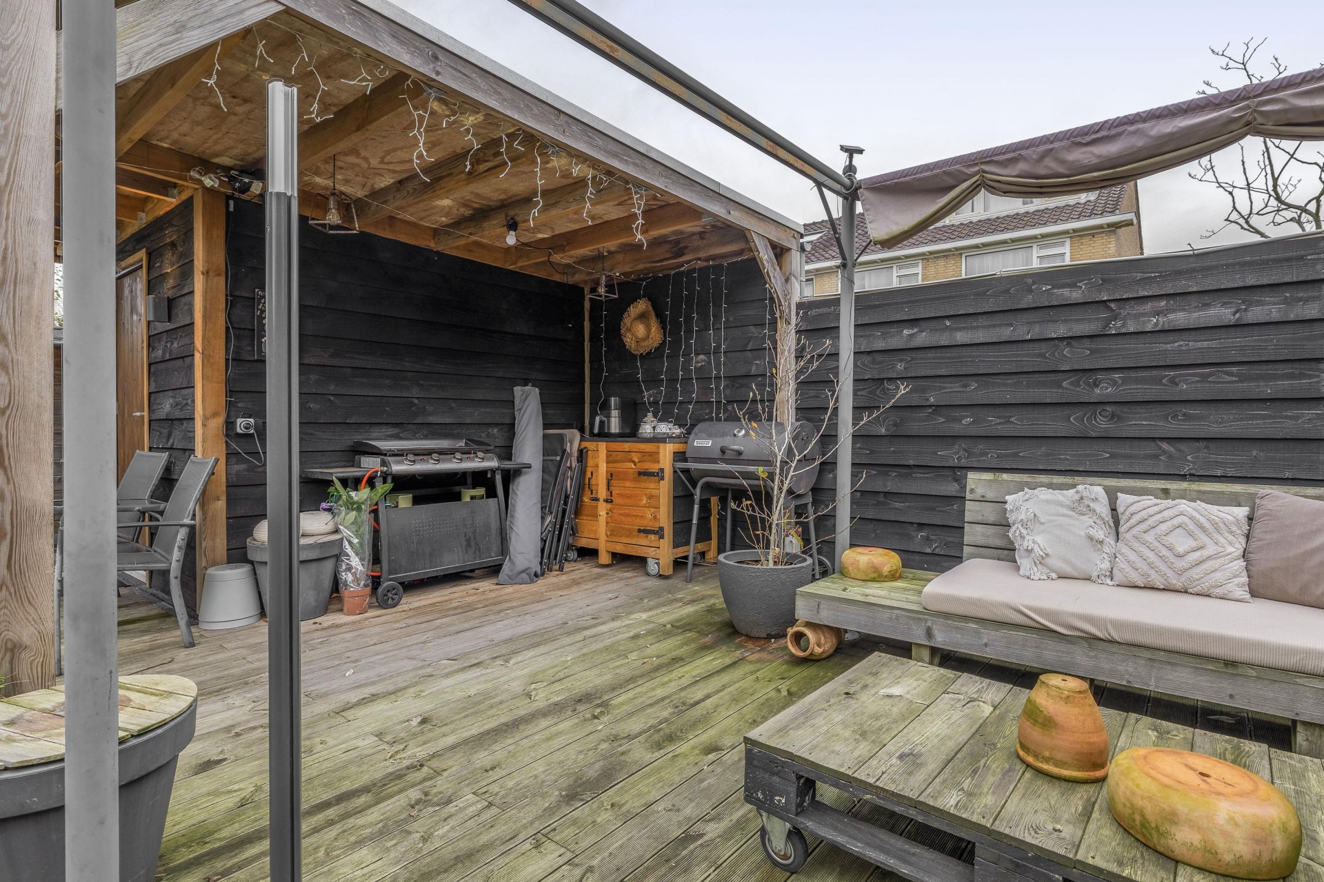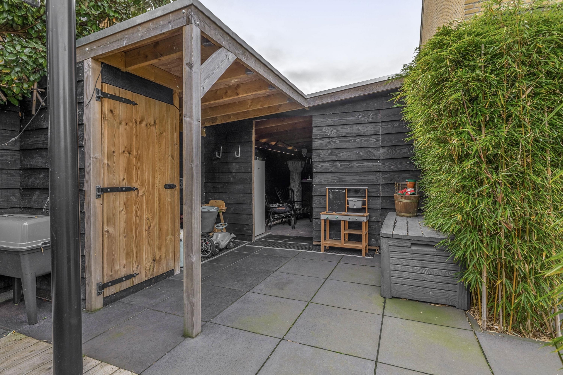 De achtertuin ligt op het oosten, maar door de hoekligging kun je vanaf de ochtend tot later in de avond genieten van de zon. De tuin is verzorgd aangelegd met terras, groen en een houten geïsoleerde berging met overkapping achterin: een heerlijke plek om buiten te eten, te borrelen of de kinderen te laten spelen. Naast het huis, in het verlengde van de oprit, bevindt zich een carport met 2 openslaande deuren welke verschillende mogelijkheden biedt.