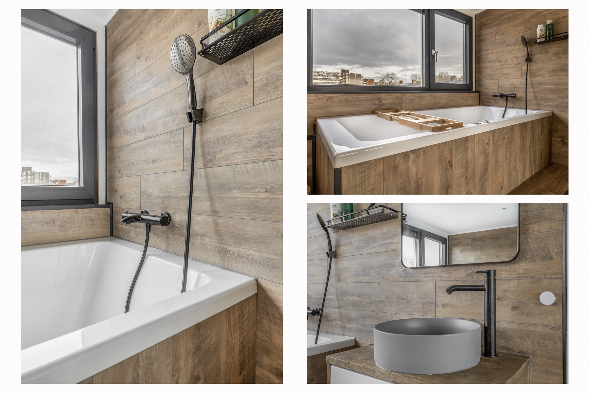 Extra fijn is dat er twee moderne badkamers zijn – nooit meer ochtendstress! Eén badkamer is uitgerust met een dubbele waskom, massief eikenhout badmeubel en een inloopdouche, strak afgewerkt in warme, natuurlijke tinten. De tweede badkamer biedt extra flexibiliteit voor bijvoorbeeld logees of tieners en heeft een heerlijk ligbad met whirlpool en wastafelmeubel.