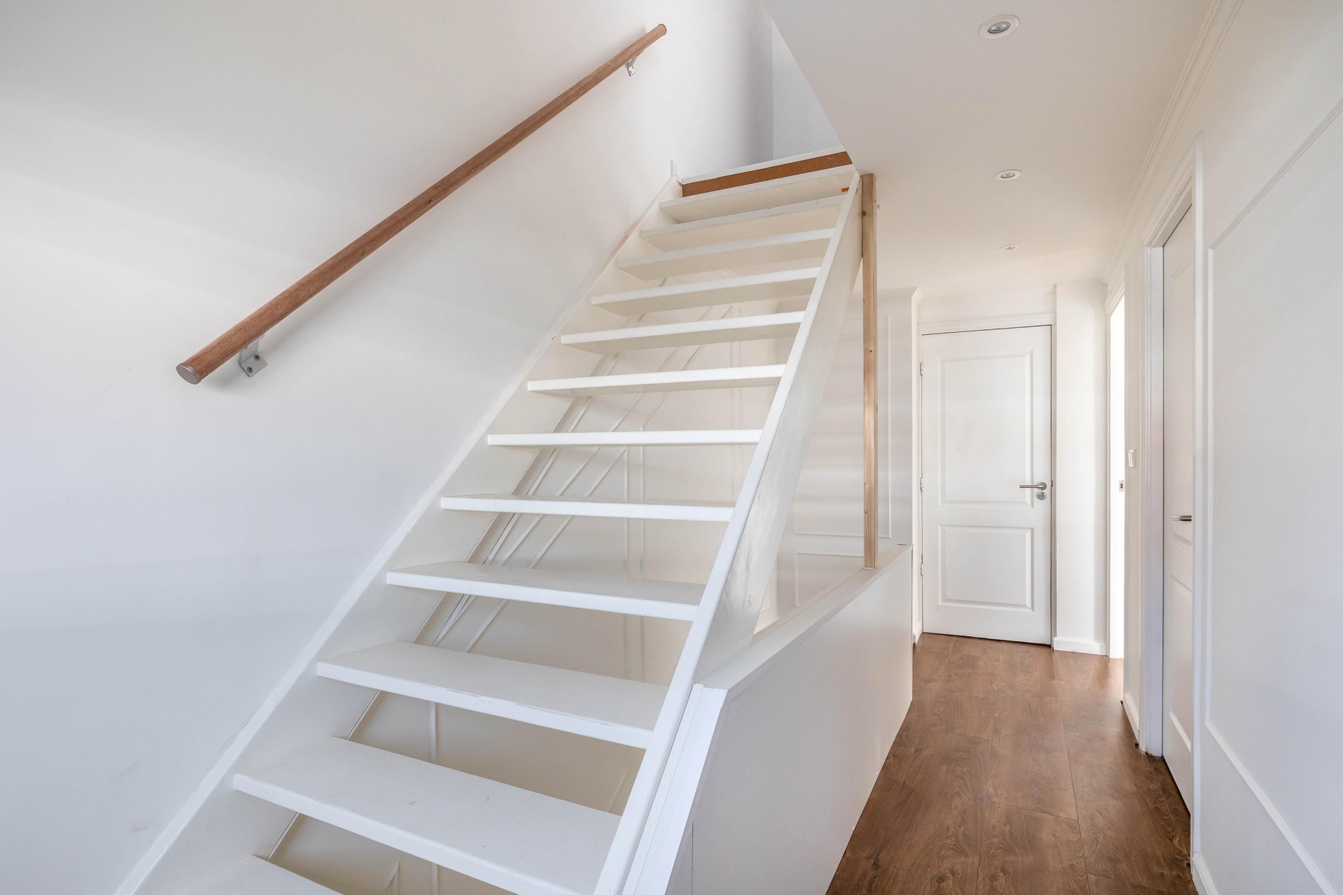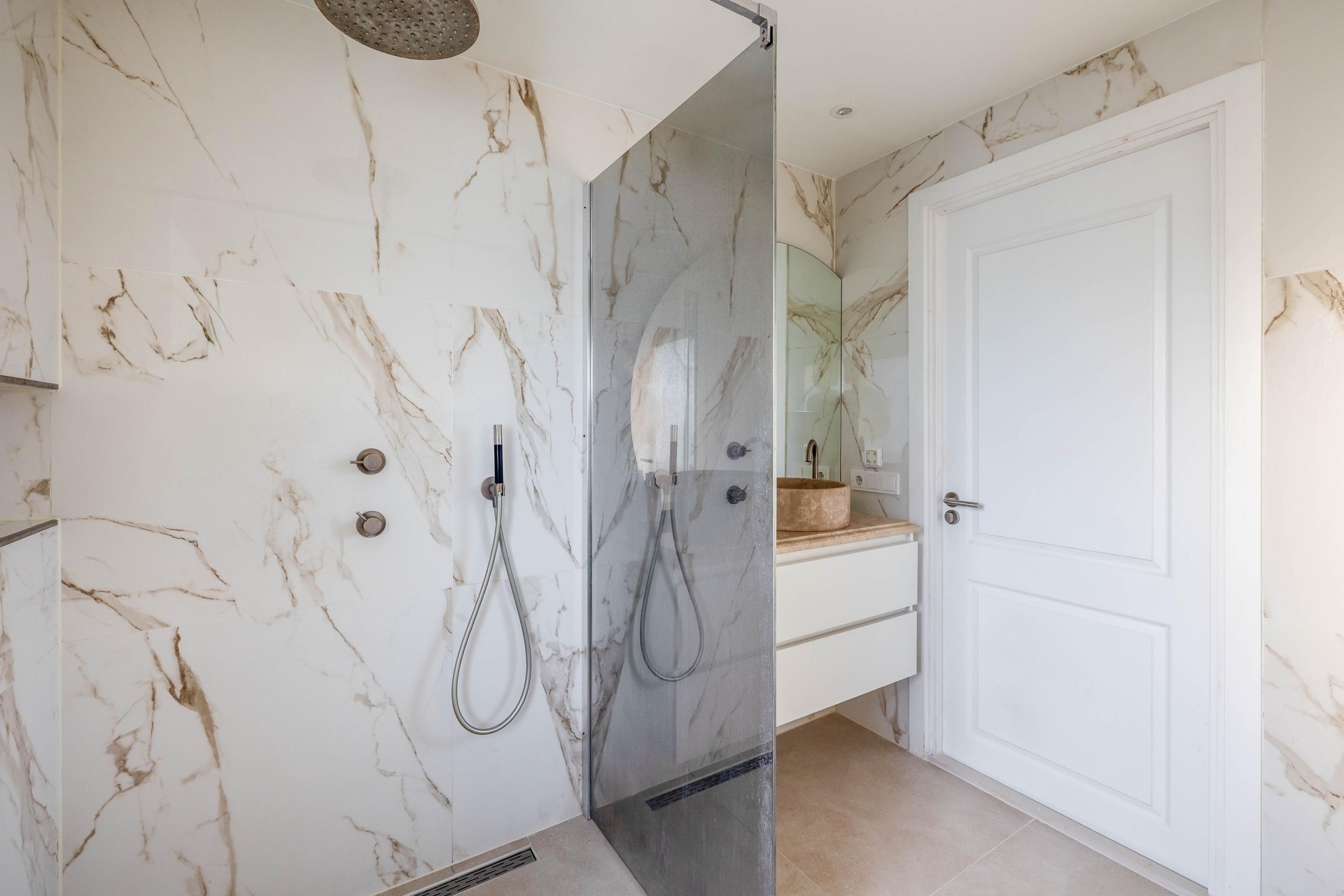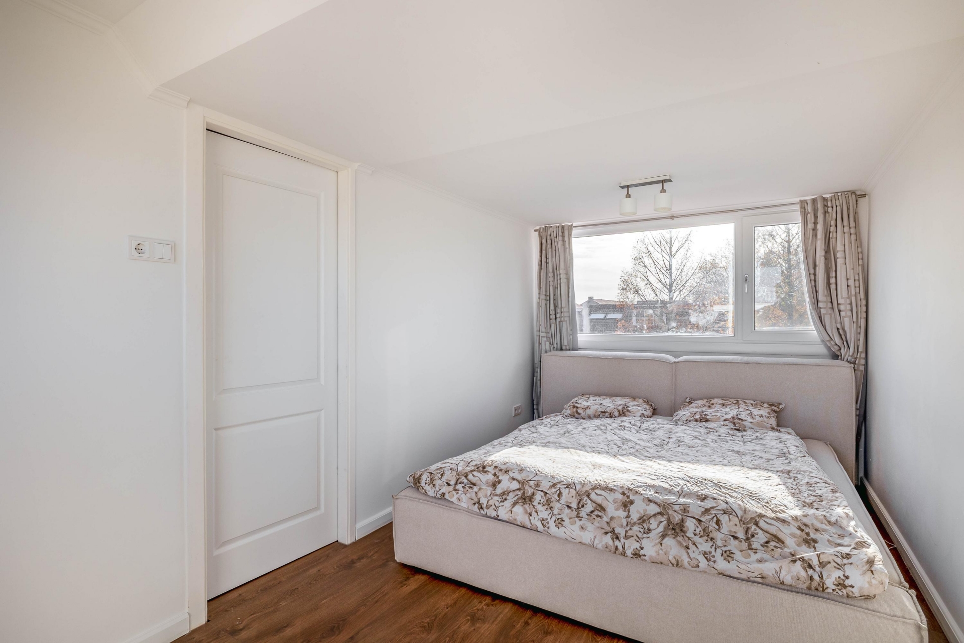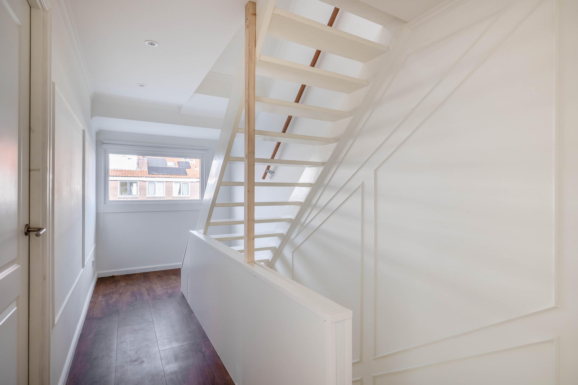 Op de eerste verdieping bevinden zich twee royale slaapkamers, beide met een rustige, moderne afwerking. De badkamer is een sieraad op zichzelf met de marmerlook tegels, een luxe natuursteen wastafelmeubel, een glazen inloopdouche met regendouche en verfijnde details in warm brons. Alles straalt kwaliteit en comfort uit, alsof u elke dag in een boutique hotel verblijft. Op de tweede verdieping is de ruime derde slaapkamer, ideaal als masterbedroom, werkplek of hobbyruimte. De twee dakkapallen zorgen voor veel licht en ruimte. Er is een wasruimte op de overloop.