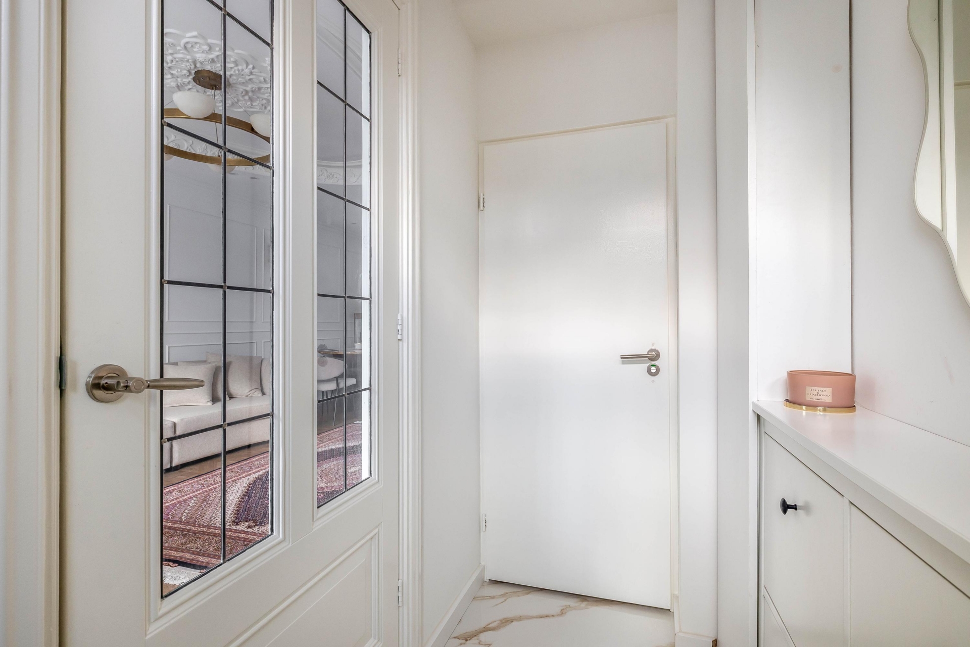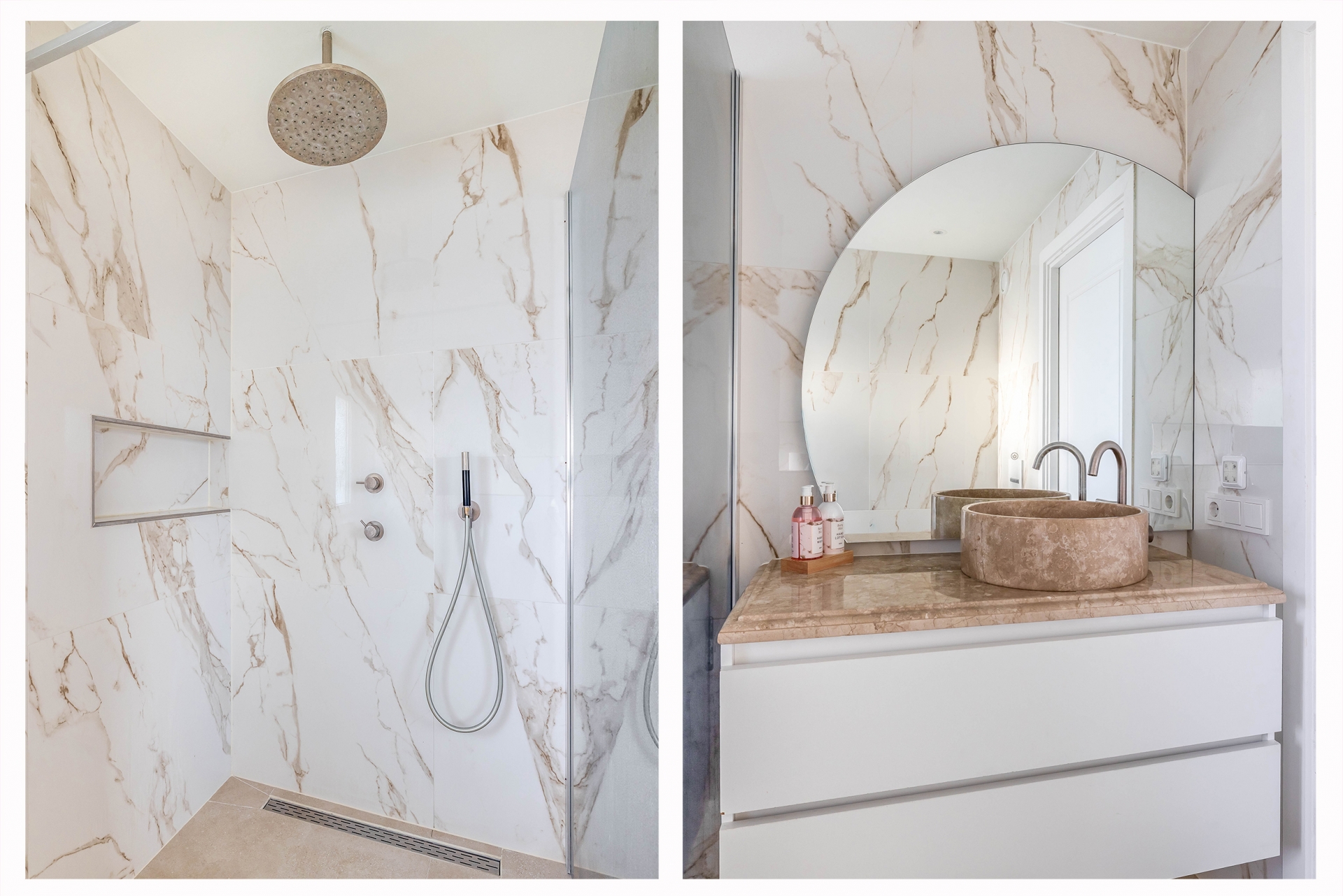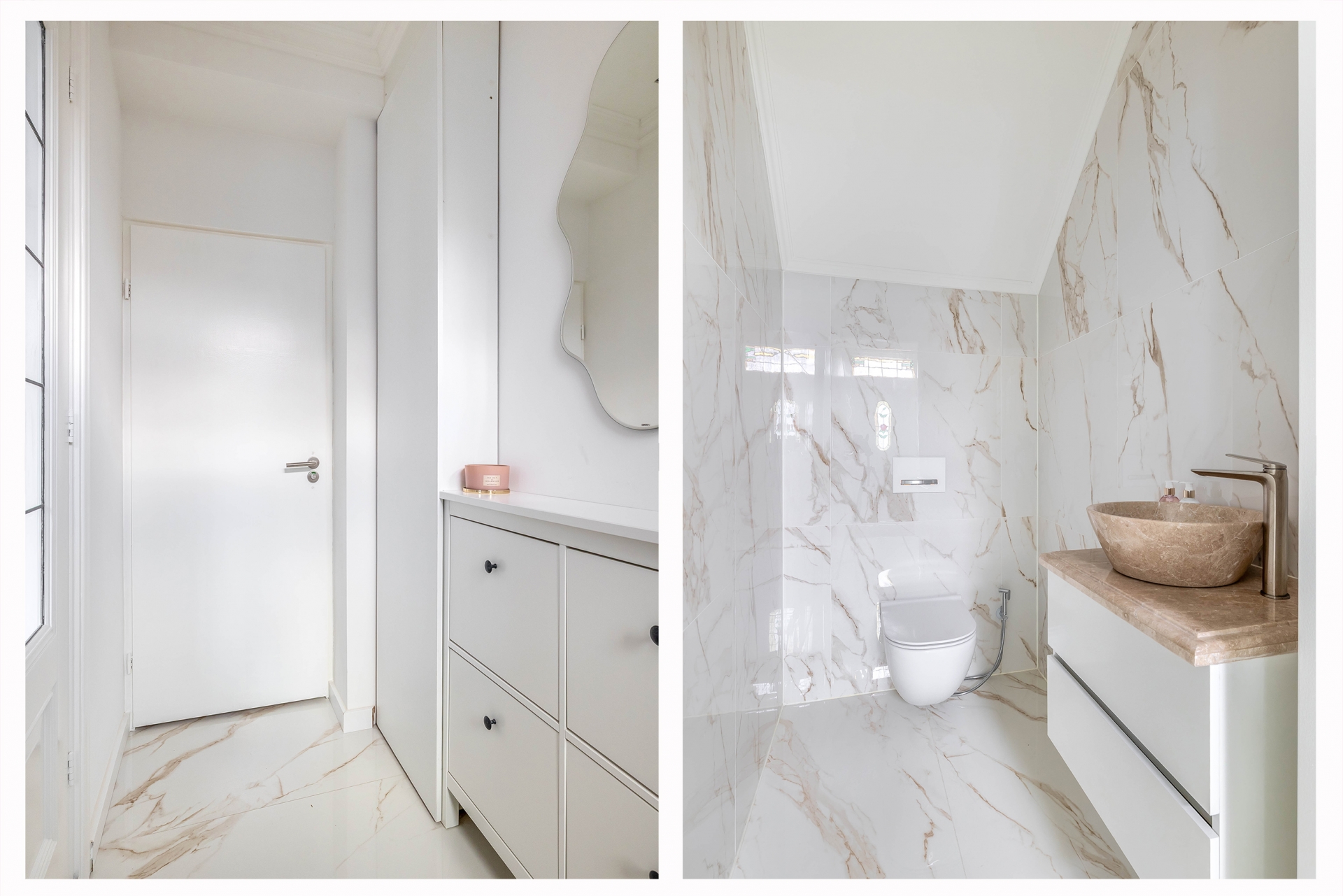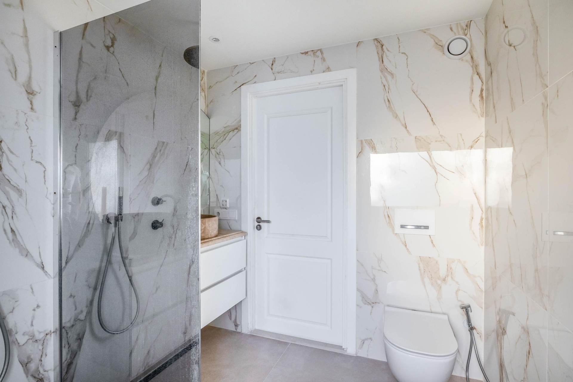 Op de eerste verdieping bevinden zich twee royale slaapkamers, beide met een rustige, moderne afwerking. De badkamer is een sieraad op zichzelf met de marmerlook tegels, een luxe natuursteen wastafelmeubel, een glazen inloopdouche met regendouche en verfijnde details in warm brons. Alles straalt kwaliteit en comfort uit, alsof u elke dag in een boutique hotel verblijft. Op de tweede verdieping is de ruime derde slaapkamer, ideaal als masterbedroom, werkplek of hobbyruimte. De twee dakkapallen zorgen voor veel licht en ruimte. Er is een wasruimte op de overloop.