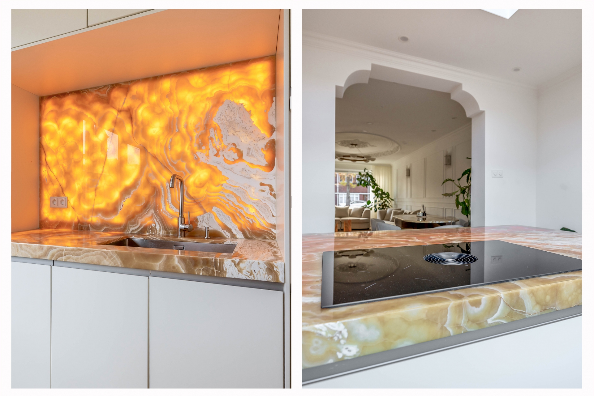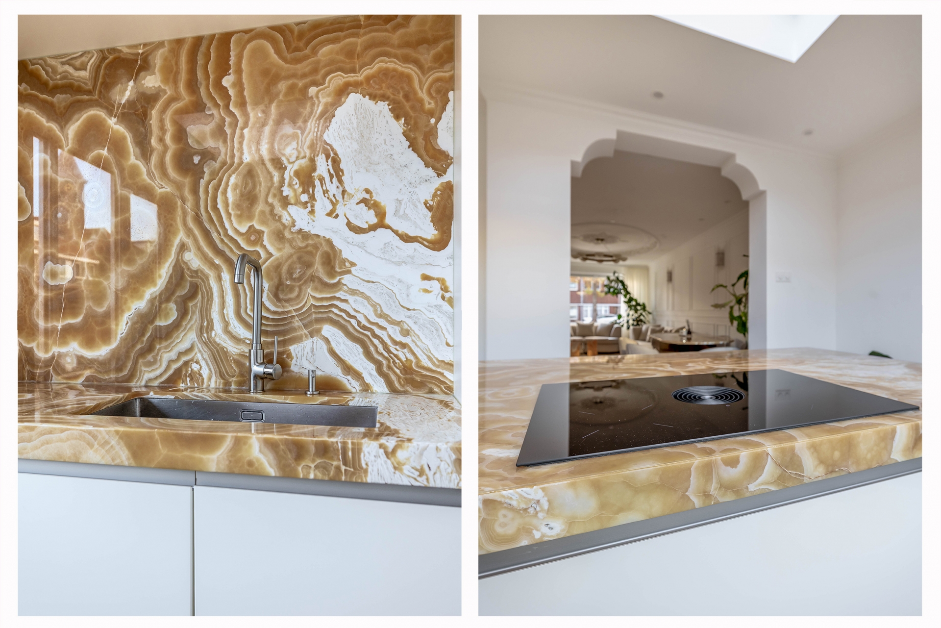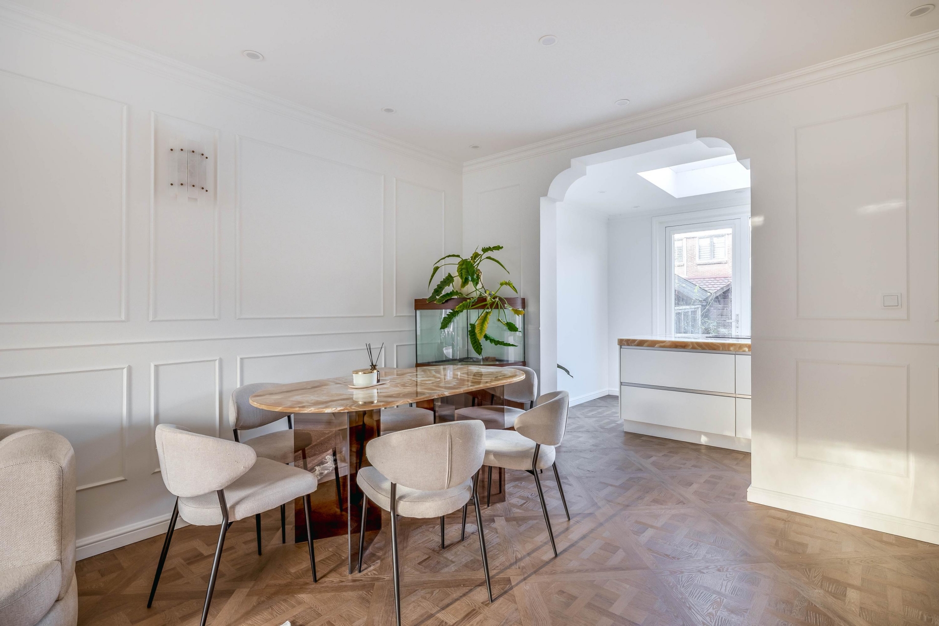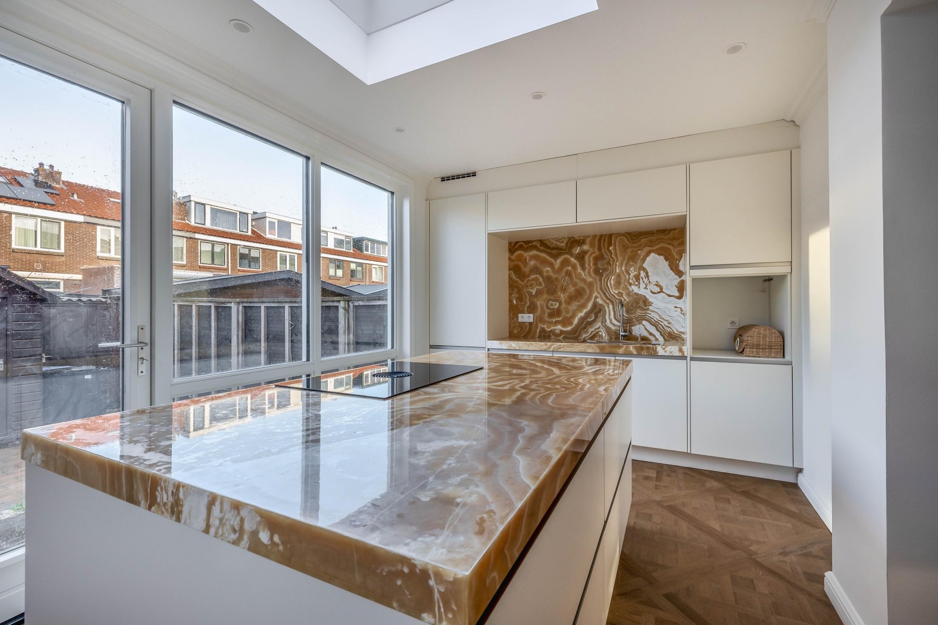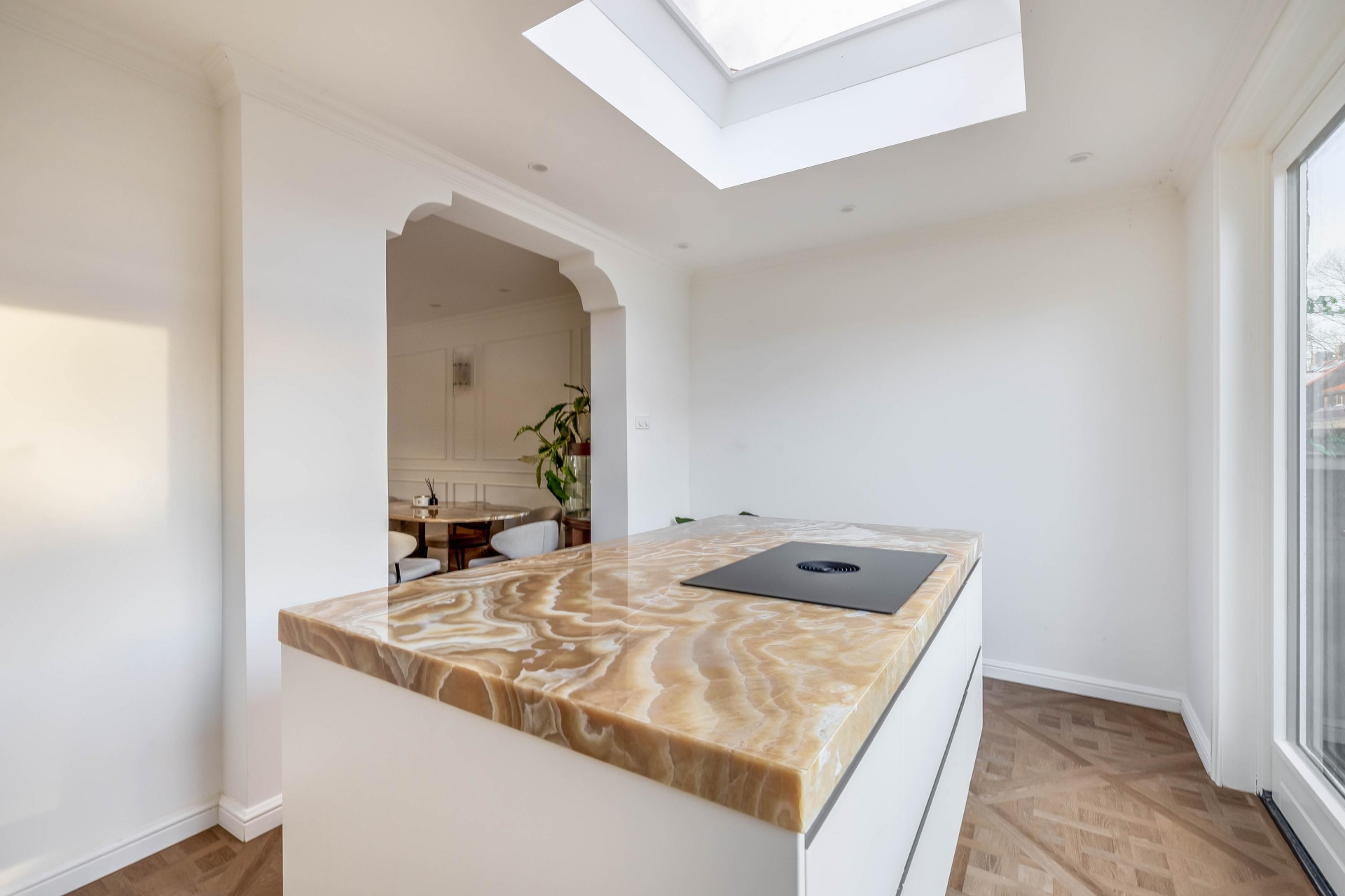 Een woonkamer die je zal verbazen vanwege de unieke stijl en prachtige details. Een prachtig sierplafond met ornamenten, verfijnde wandlijsten, een luxe PVC vloer en veel licht maakt de ruimte uniek. De brede open trap zorgt voor een hotel gevoel. En dan de keuken in de uitbouw... het pronkstuk van de woning! Het spectaculaire natuurstenen blad en de bijpassende achterwand met verlichting geven de ruimte een exclusieve uitstraling. Het kookeiland met geïntegreerde afzuiging, de hoogwaardige apparatuur en de strakke lijnen maken het geheel zowel prachtig als functioneel. De grote ramen en lichtkoepel maken het een hele fijne plek om te koken terwijl je contact maakt met je gezin of gasten in de woonkamer.