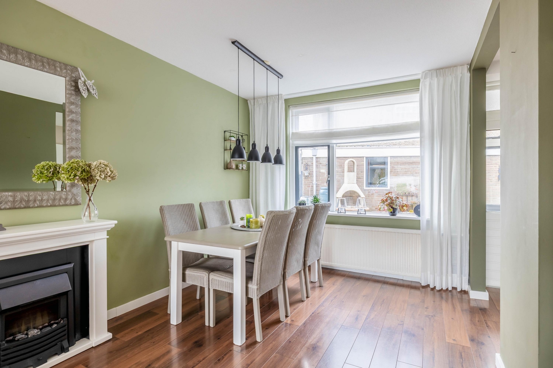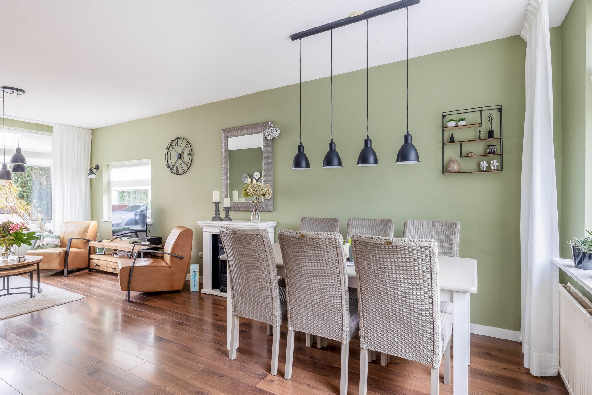 Binnenstappen in dit huis voelt meteen goed. De woonkamer is heerlijk licht door het grote raam aan de voorzijde en de hoekligging zorgt voor extra daglicht en een vrij zicht op de straat. De combinatie van warme kleuren, houten vloer en strak afgewerkte wanden geeft een uitnodigende en moderne sfeer. De zithoek aan de voorzijde is perfect om tot rust te komen, terwijl er aan de achterzijde voldoende ruimte is voor een grote eettafel. Hier zit je met gemak met het hele gezin of met vrienden te eten of borrelen.