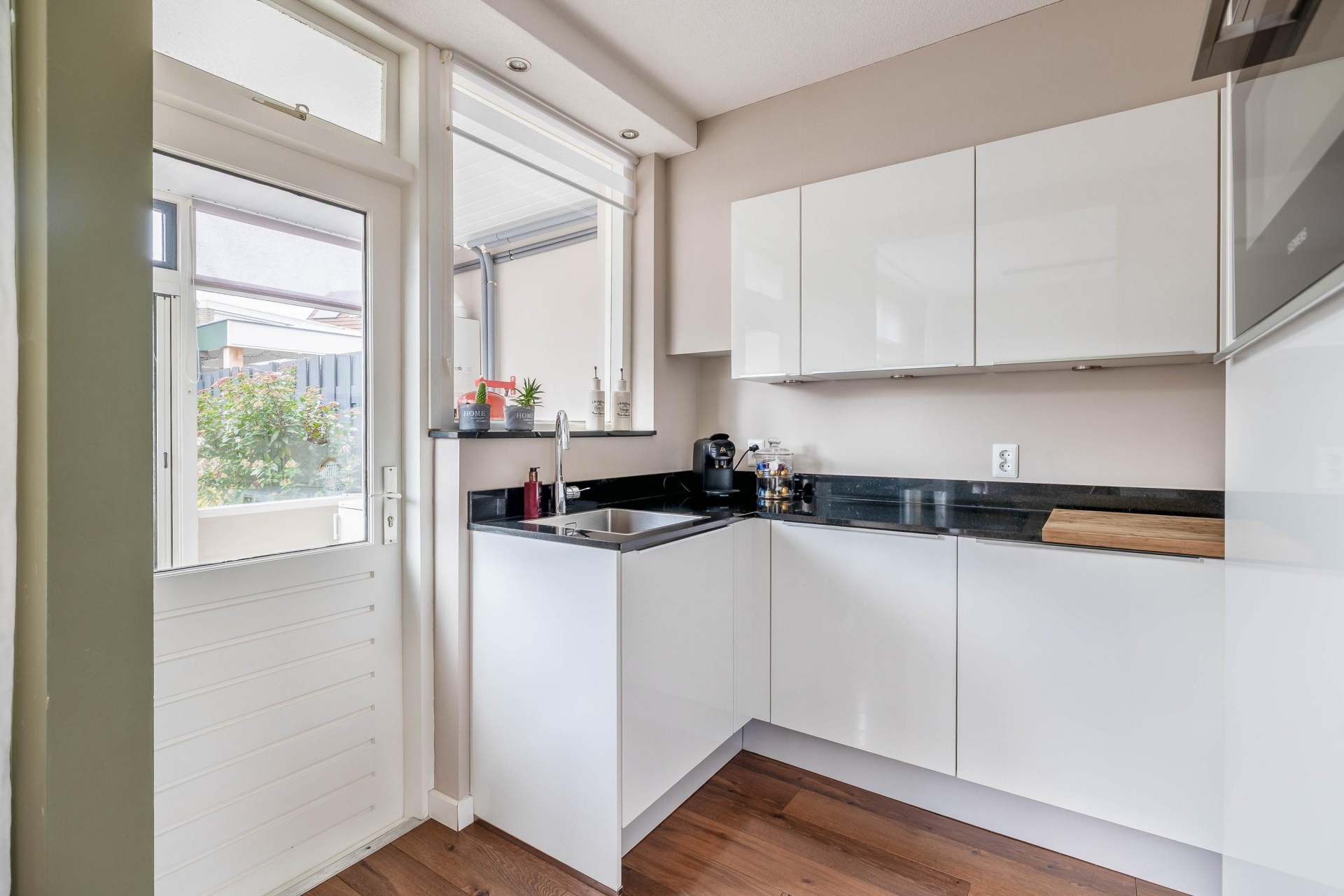 Aansluitend aan de eethoek vind je de nette keuken, voorzien van alle wenselijke inbouwapparatuur. Ook hier is de afwerking verzorgd: licht, fris en praktisch in gebruik.