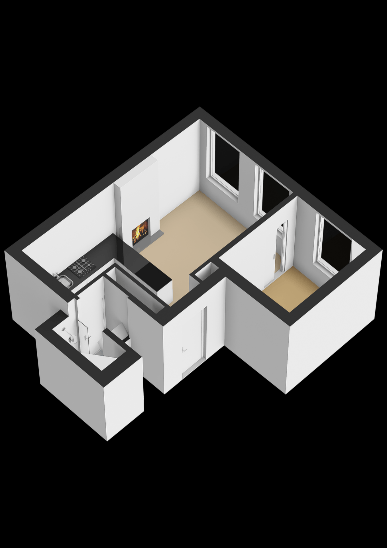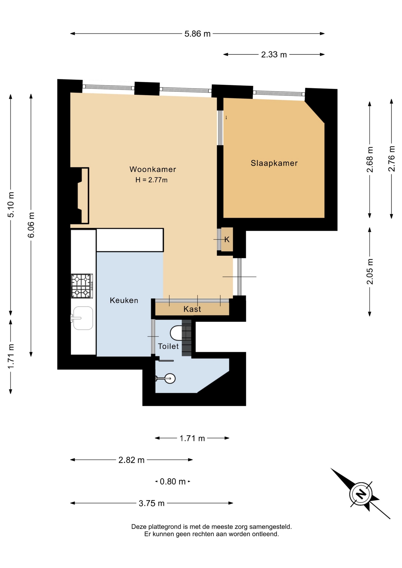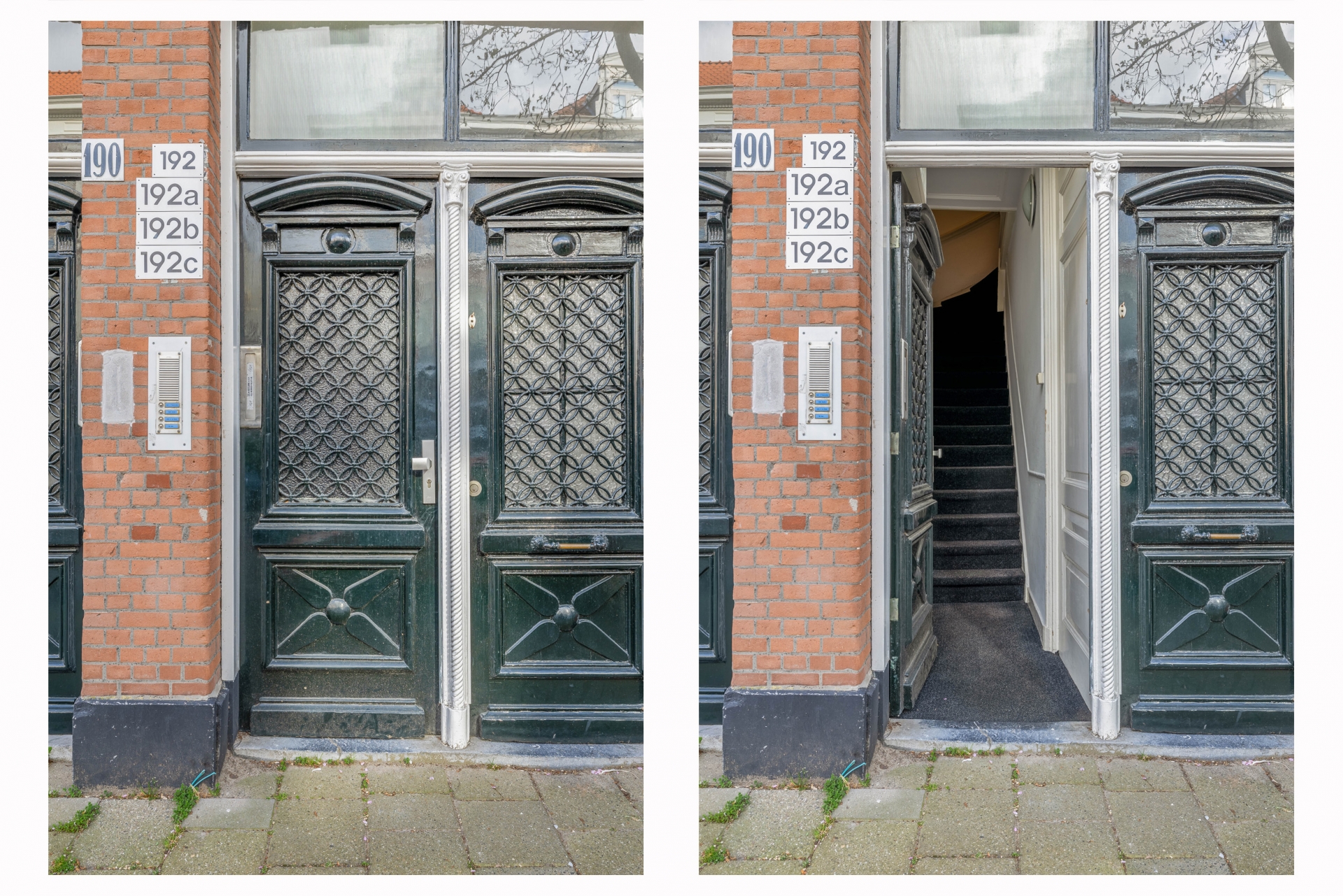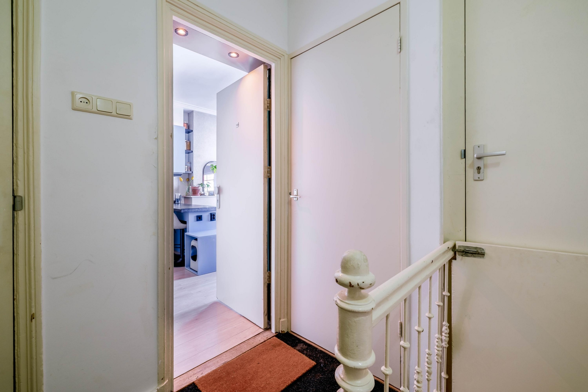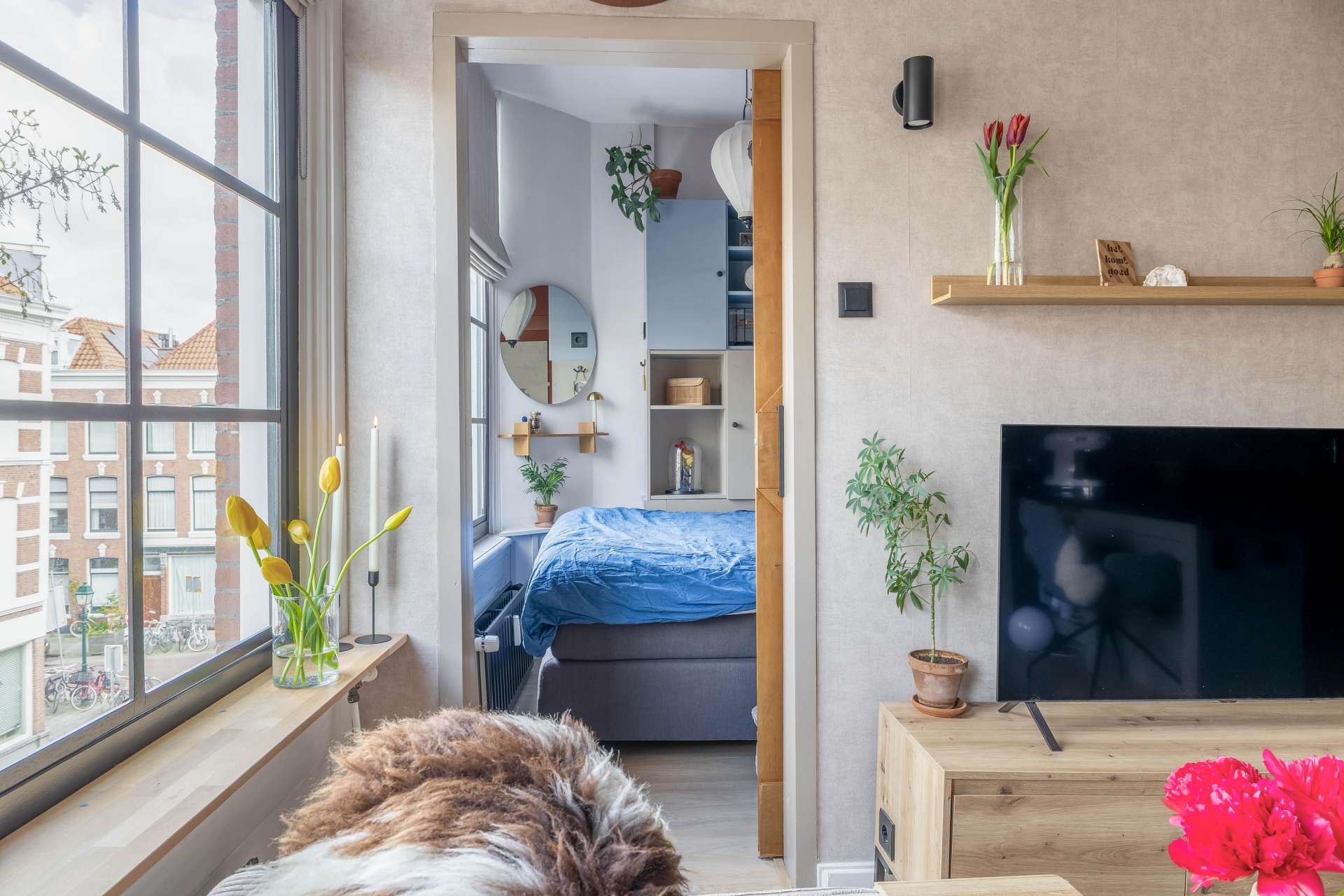 Entree op straatniveau; trap naar 2e verdieping met entree tot het appartement gelegen aan de voorzijde. Lichte woon-/eetkamer met ornamentenplafond en open keuken, voorzien van koelkast met vriesvakje, gaskookplaat, afzuigkap en veel kastruimte. Slaapkamer aan de voorzijde.