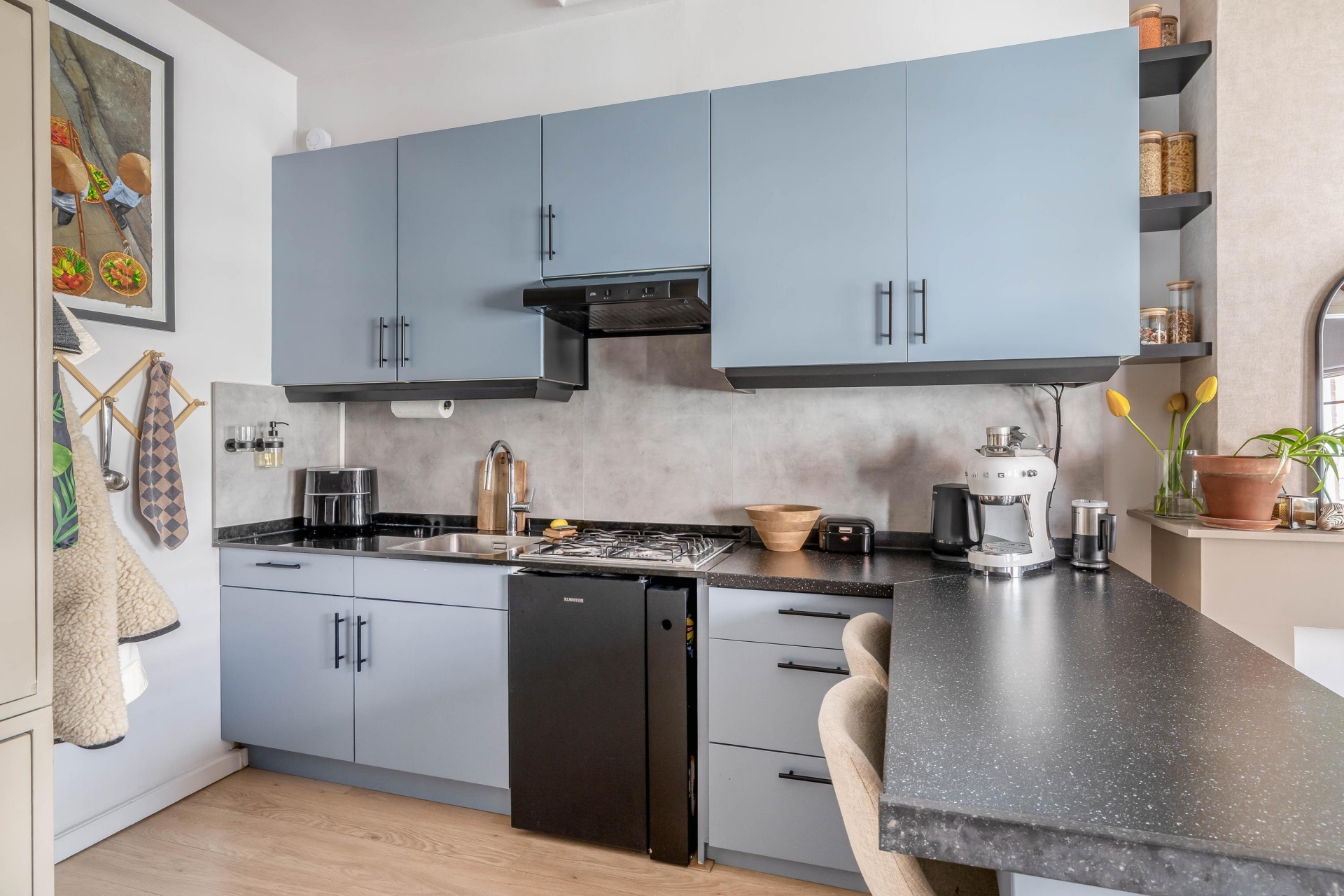 SCHITTEREND ONDERHPOUDEN 2-KAMER APPARTEMENT, GELEGEN OP DE 2E VERDIEPING VAN EEN KARAKTERISTIEK PAND, VOORZIEN VAN VELE ORIGINELE DETAILS. INDELING: Entree op straatniveau; trap naar 2e verdieping met entree tot het appartement gelegen aan de voorzijde. Lichte woon-/eetkamer met ornamentenplafond en open keuken, voorzien van koelkast met vriesvakje, gaskookplaat,…