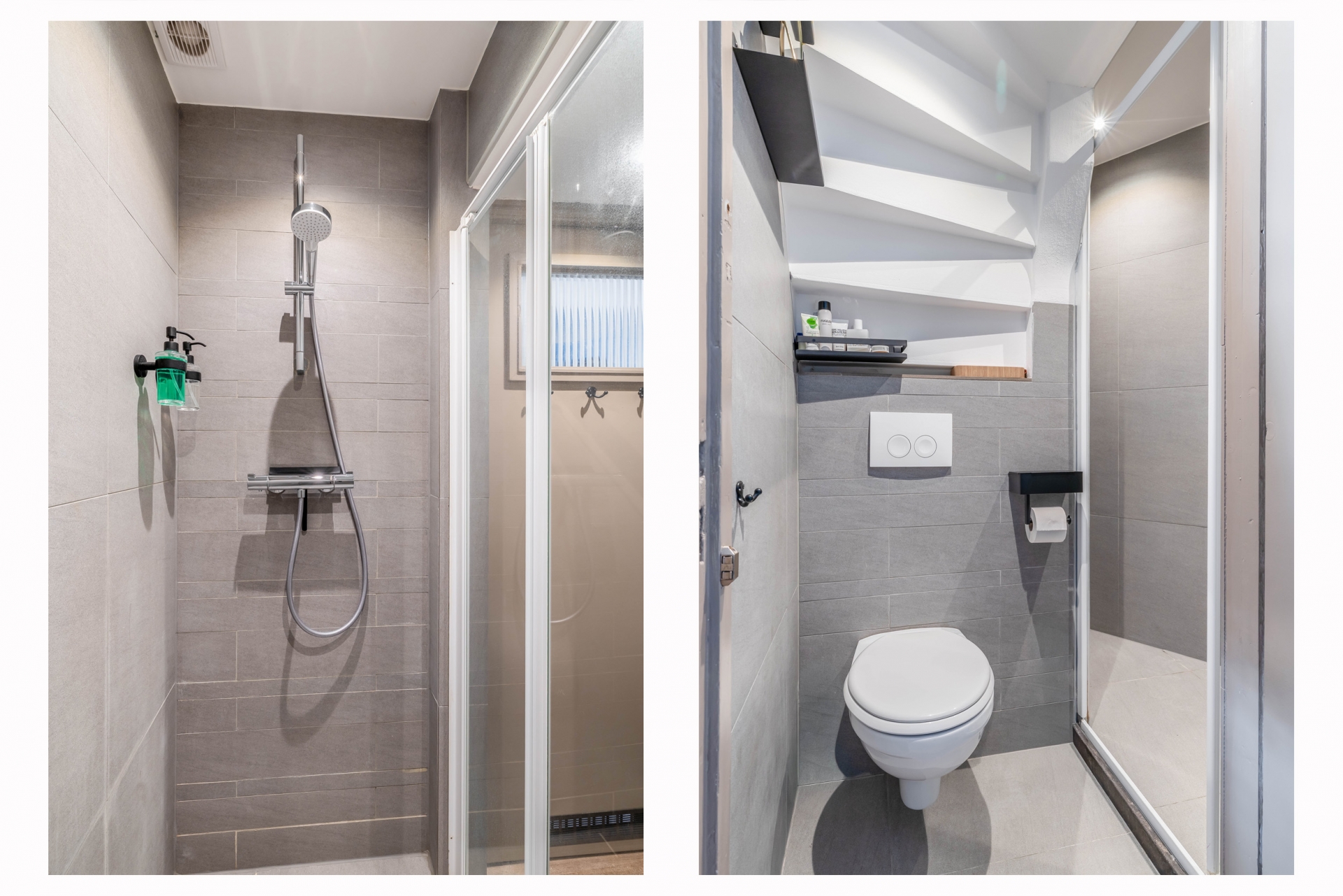 Moderne badkamer, voorzien van douche en toilet. Gezamenlijk gebruik van wasmachine en droger op de tweede etage.