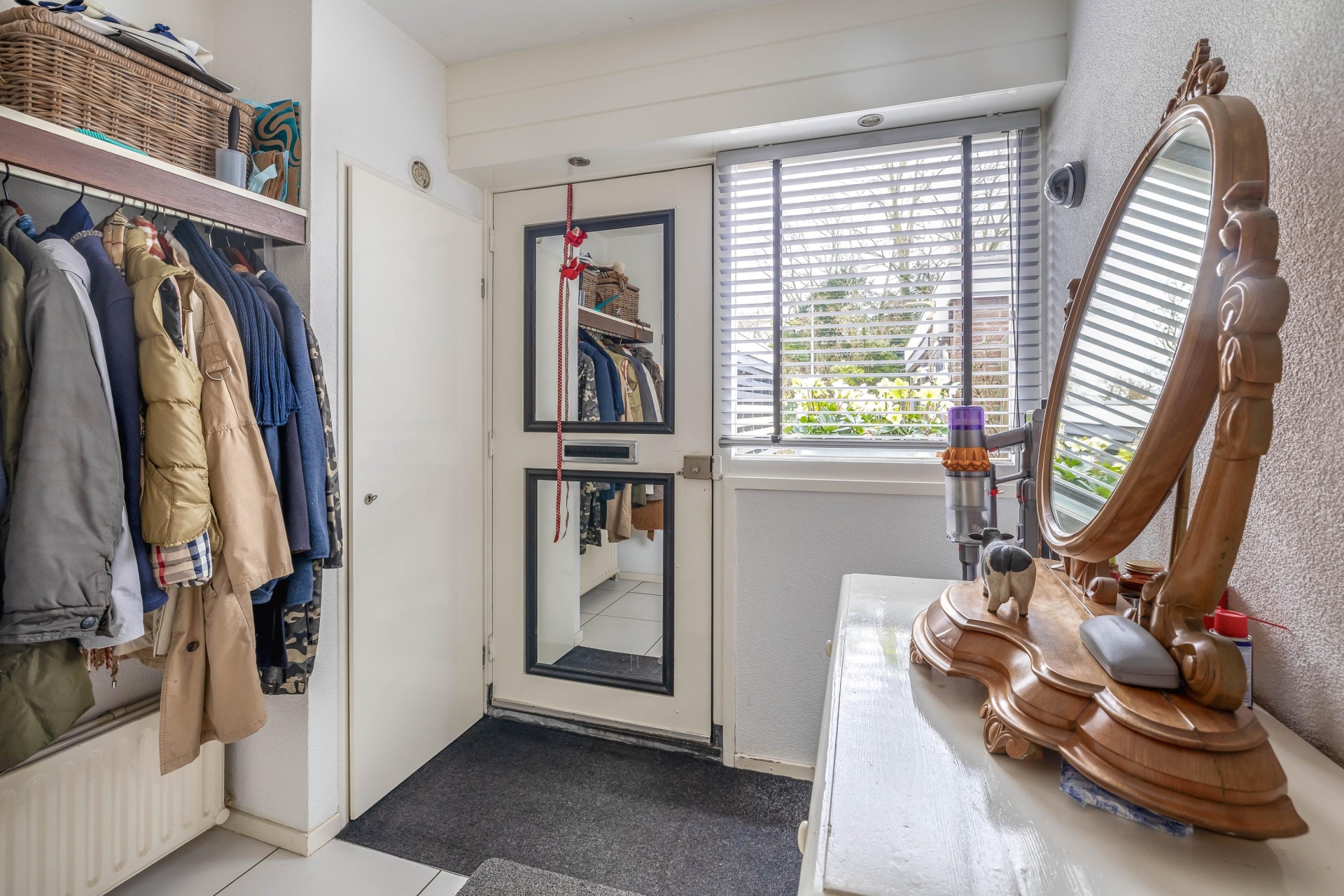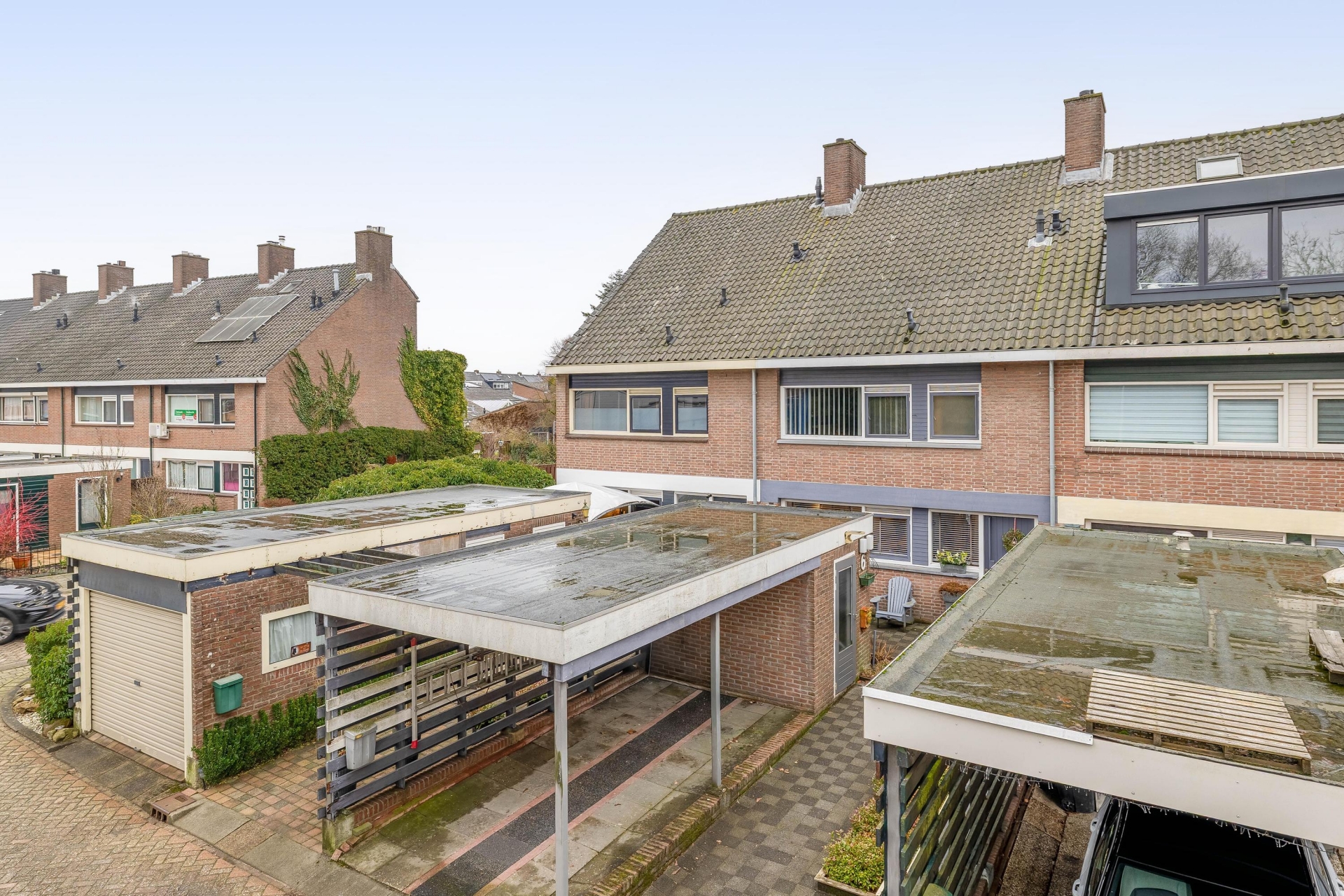 Aan de voorzijde van het huis ligt de voortuin met carport. Parkeren doe je dus gewoon op eigen terrein.