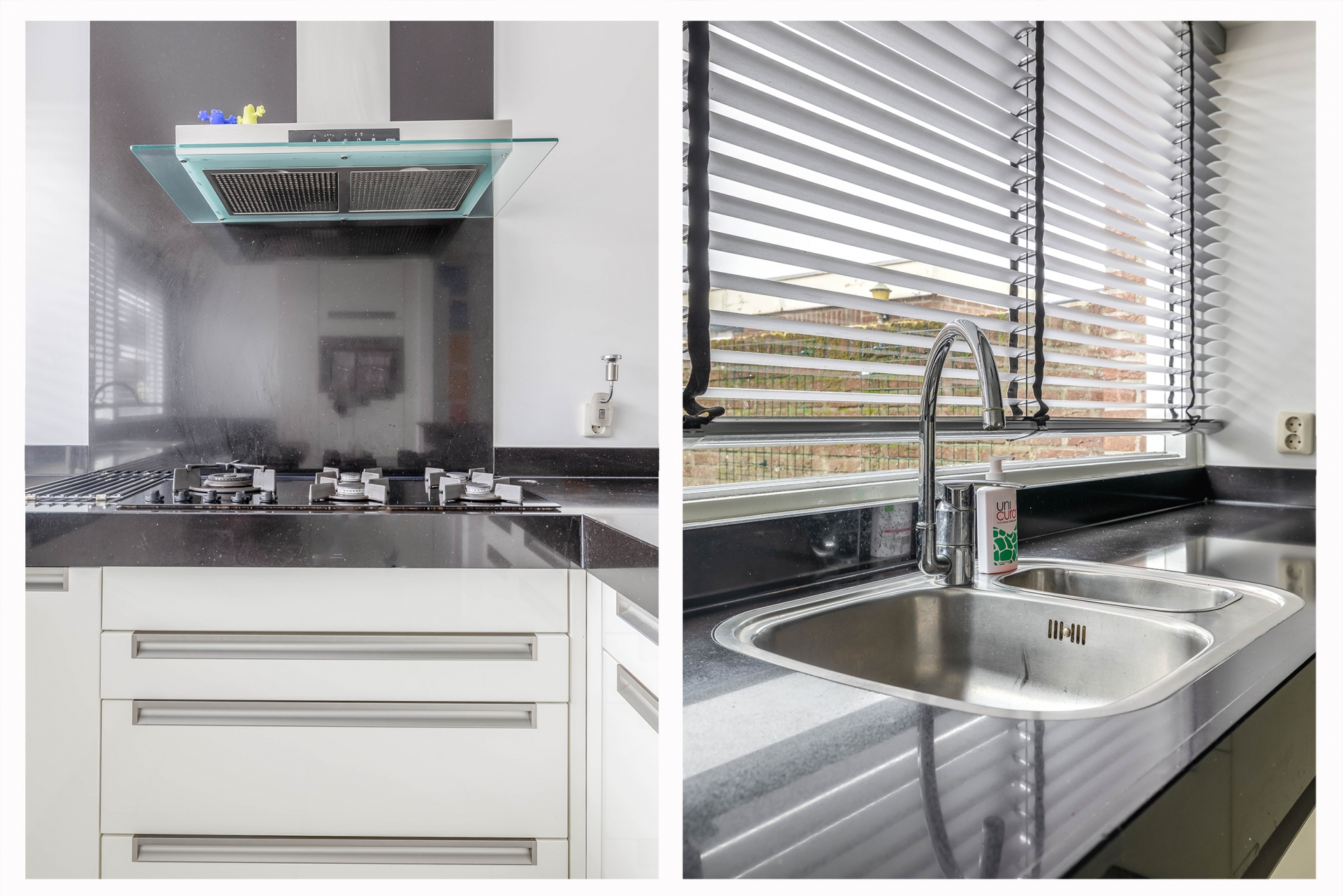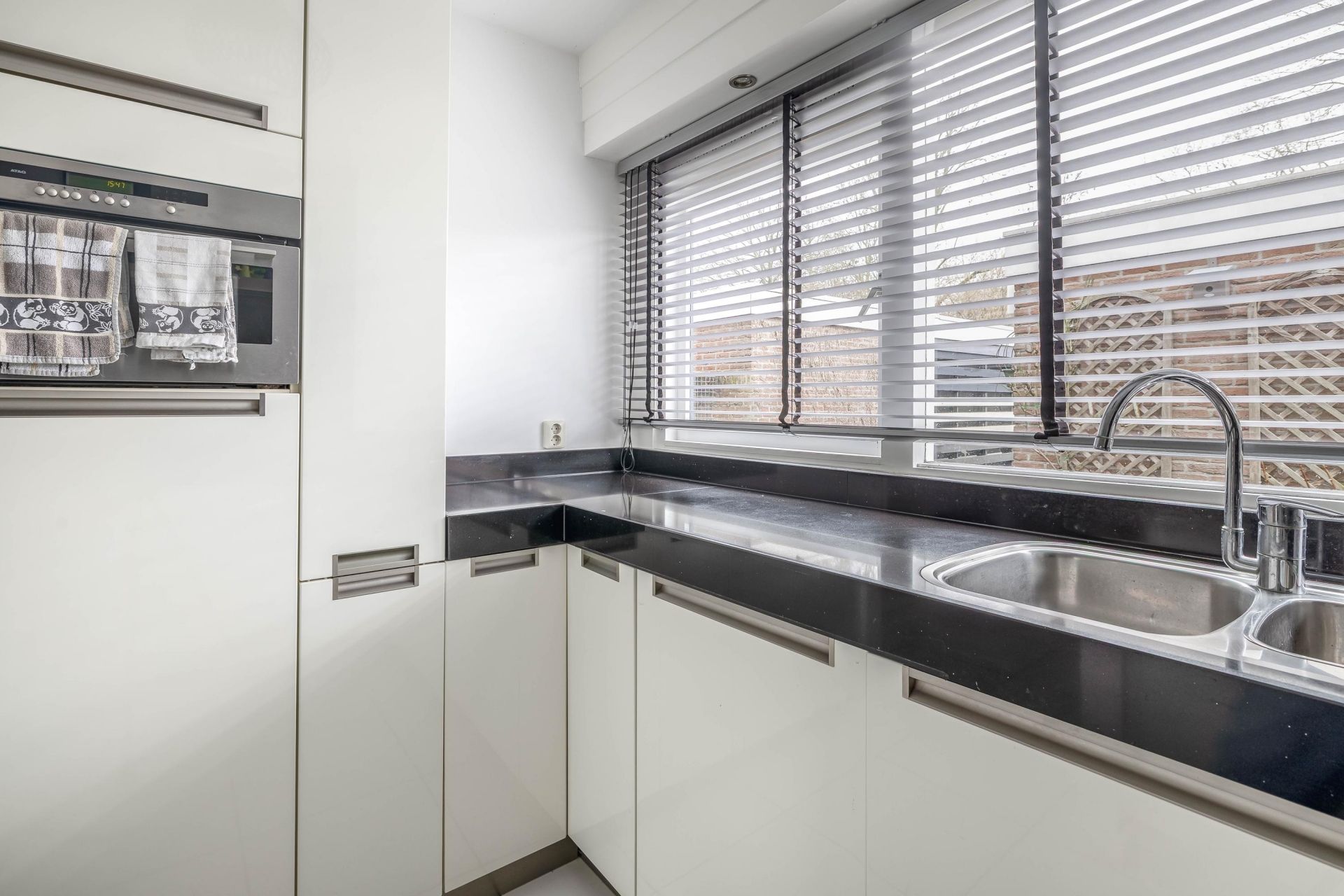 De zithoek is royaal en biedt voldoende ruimte voor een grote bankopstelling. De keuken ligt aan de voorzijde van het huis en is uitgevoerd in een moderne hoekopstelling met lichte fronten en een donker werkblad. Er is volop kastruimte en werkruimte, wat het een prettige plek maakt om te koken.