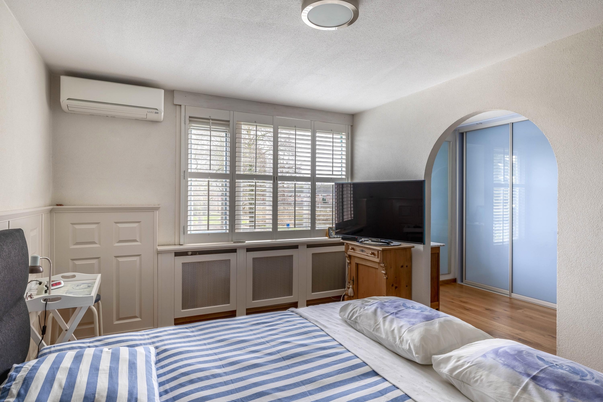 Op de eerste verdieping bevinden zich twee slaapkamers (voorheen 3). De grootste slaapkamer ligt aan de achterzijde en is voorzien van een inloopkast. Ook hier zorgen de ramen voor prettig daglicht. De tweede slaapkamer is ook voldoende ruim. Eventueel is de inloopkast weer om te bouwen tot slaapkamer, wat het voorheen ook was.
