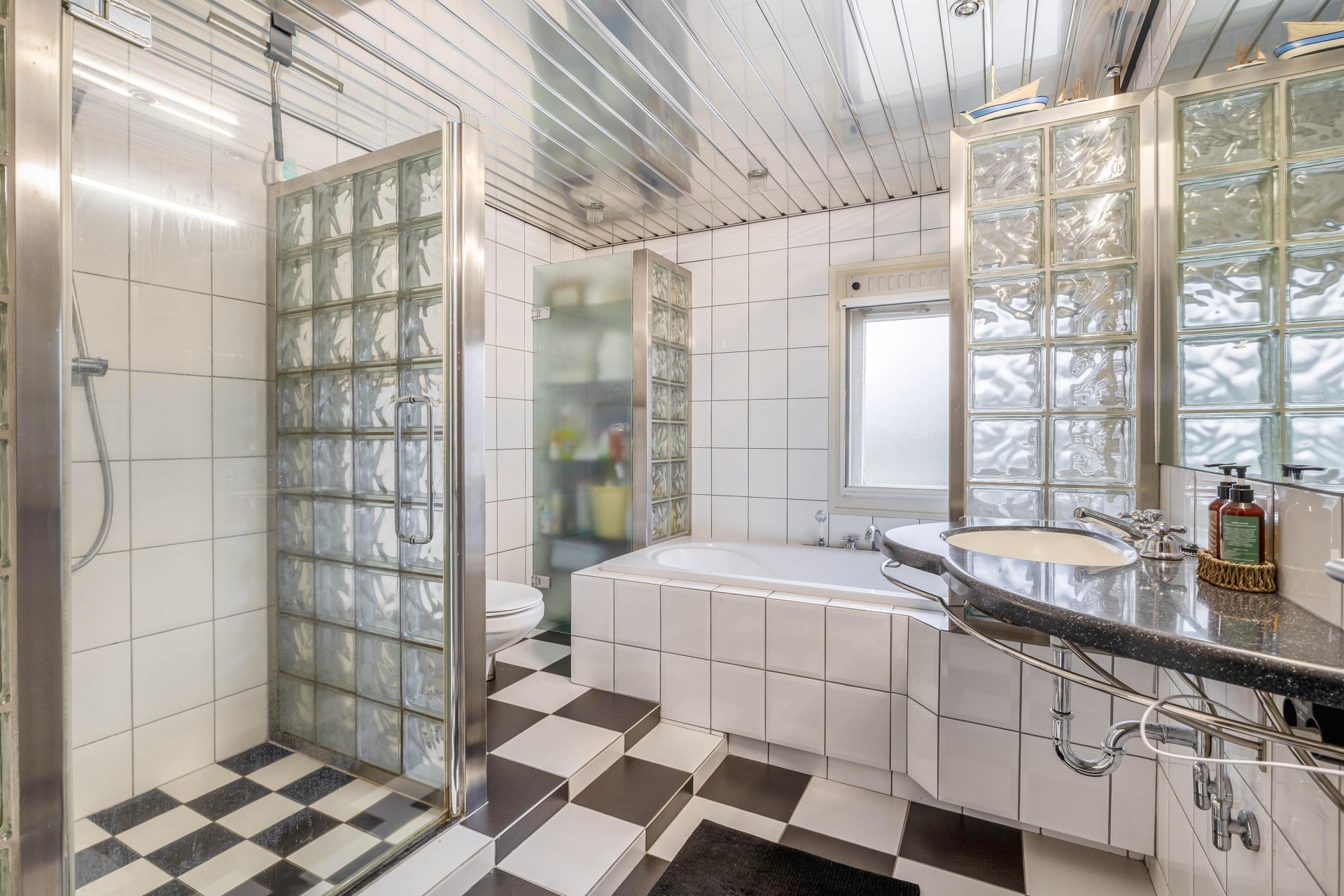 De badkamer is ruim, luxe- en praktisch ingericht.