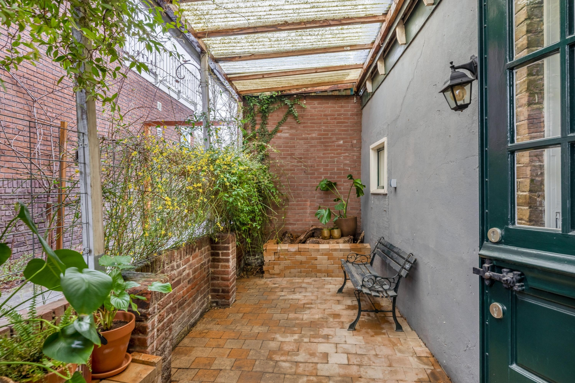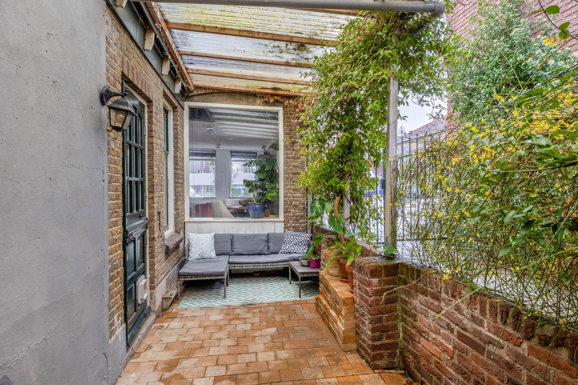 Buiten is het ook volop genieten: de beschutte patio/tuin is een heerlijke plek om te zitten. Dankzij de overkapping en het groen is dit een intieme en sfeervolle ruimte. Een fijne plek voor een kop koffie of een gezellige barbecue. Er is ook een balkon, ideaal om even buiten te kunnen zitten of de was te laten drogen.