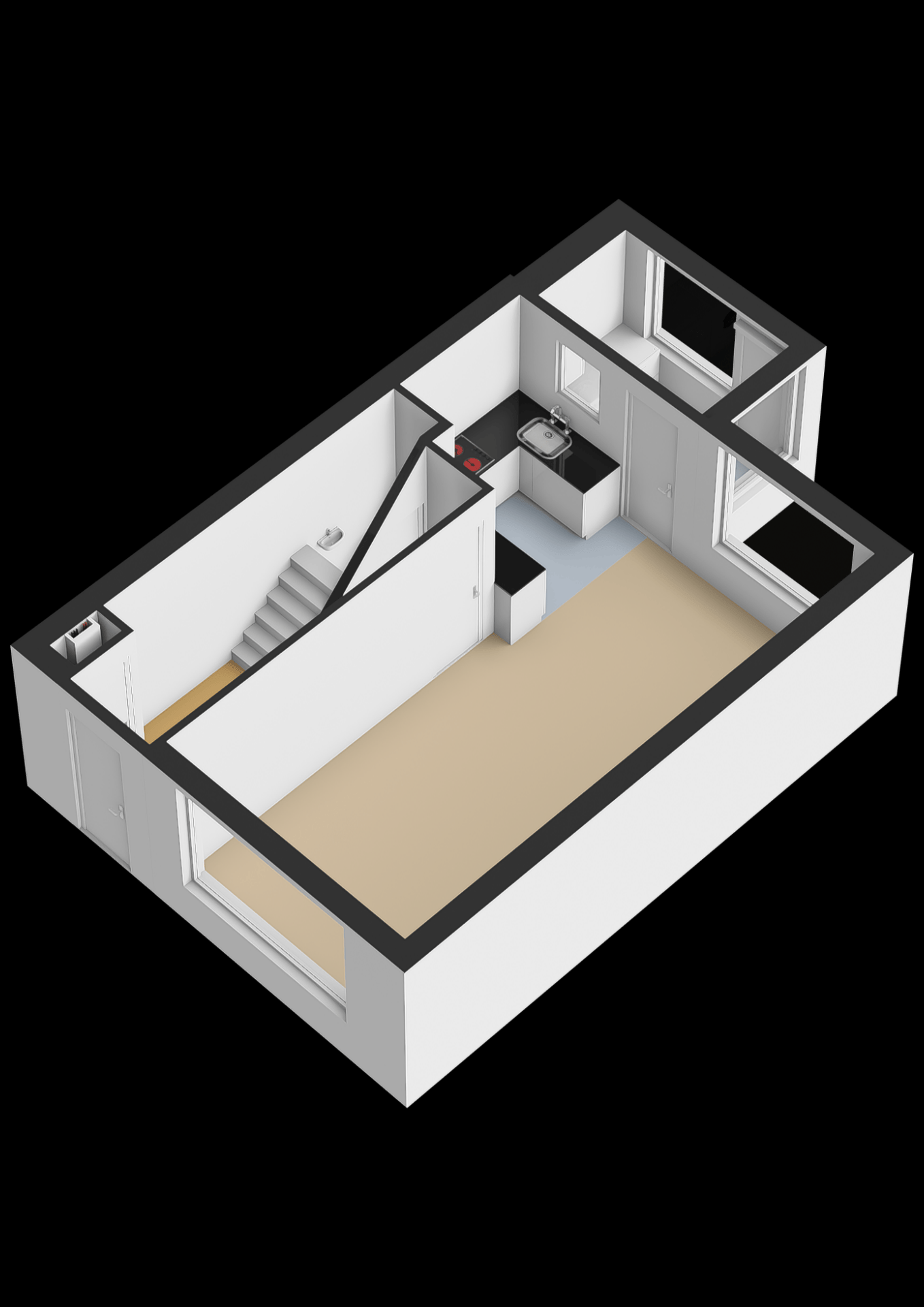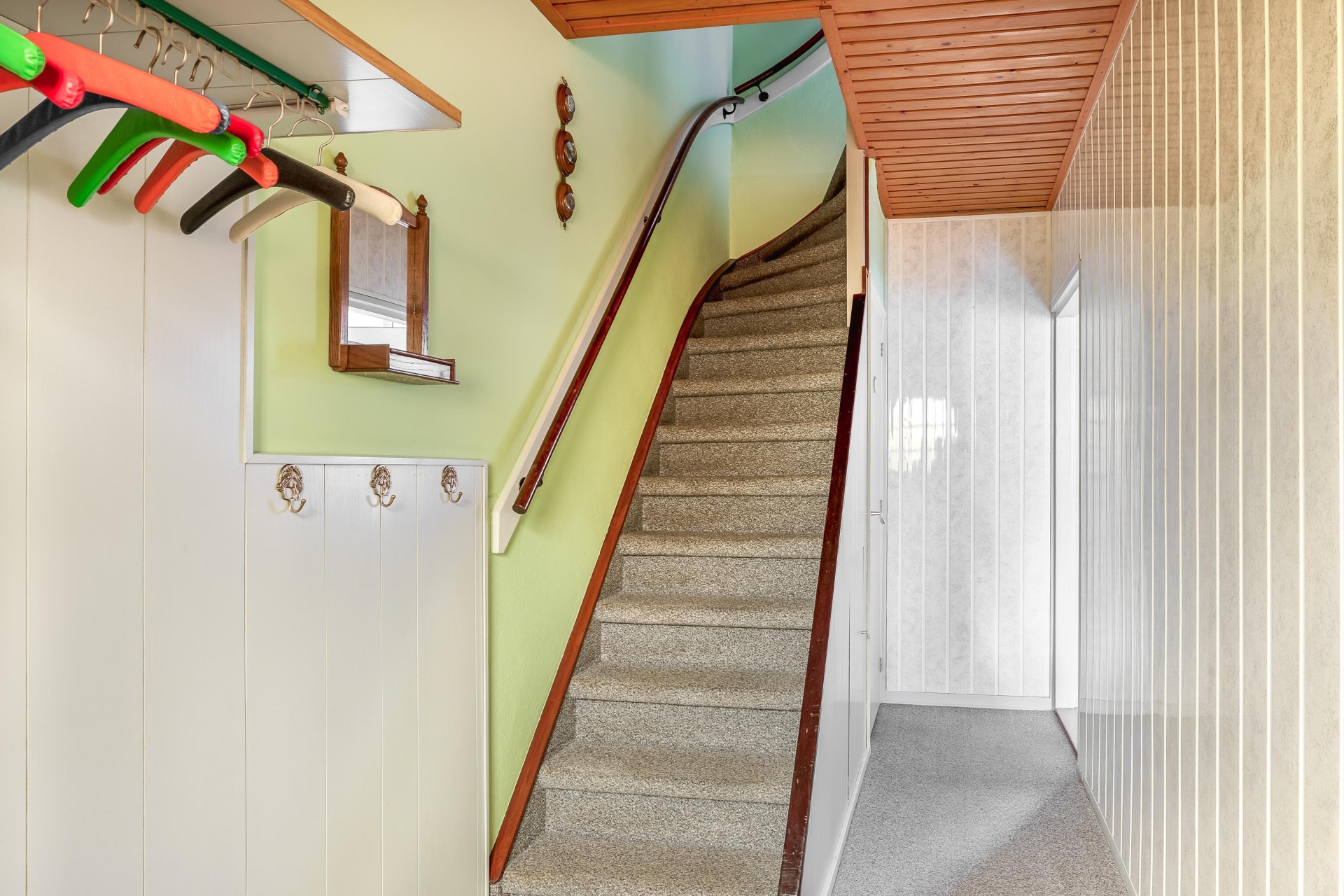 De keuken grenst aan de hal, waar zich ook het toilet en de trap naar de bovenverdieping bevinden.