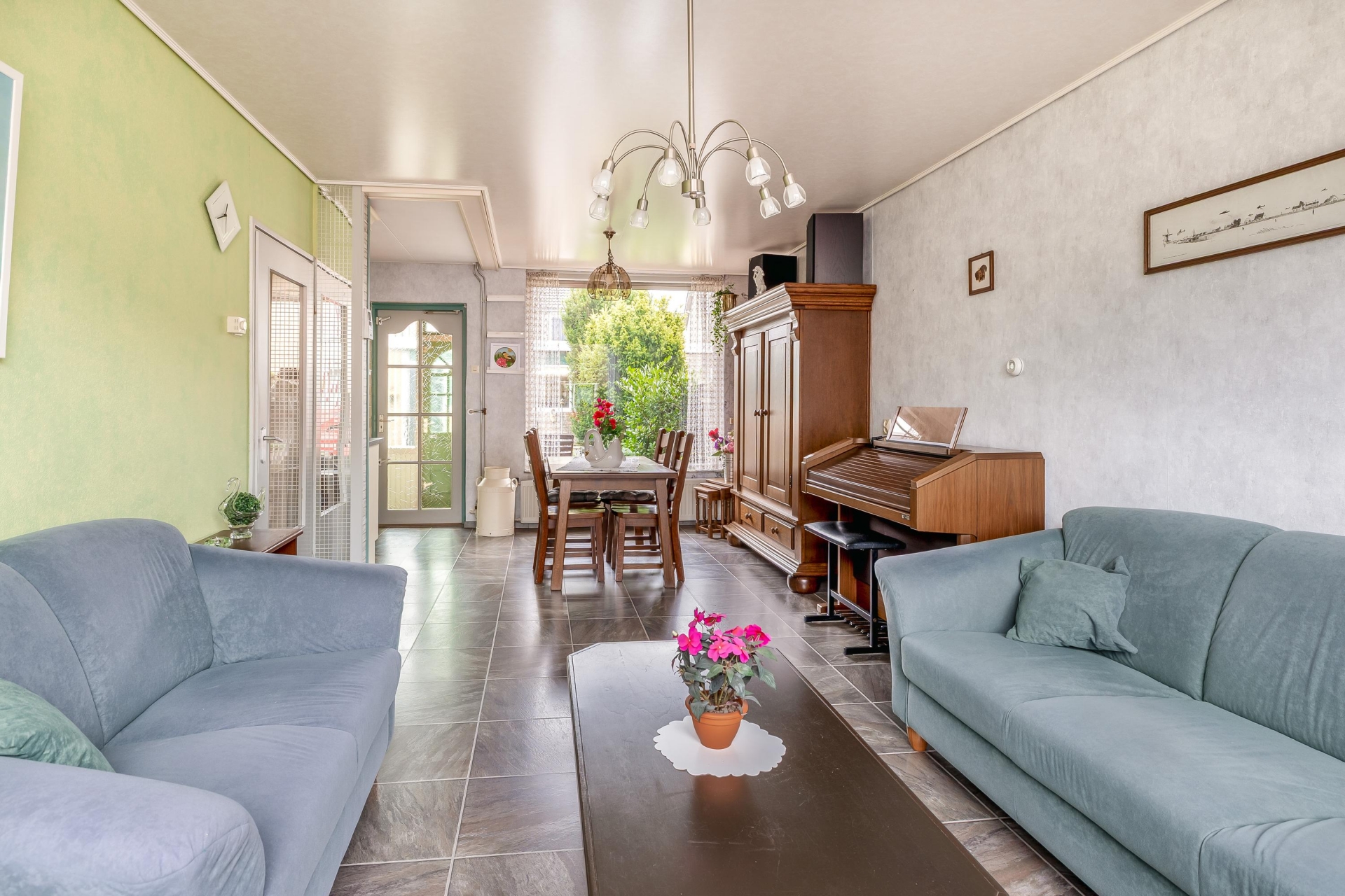 De woonkamer is een fijne plek om thuis te komen. Dankzij het grote raam aan de voorzijde komt er veel daglicht binnen. De ruimte is praktisch in te delen, met voldoende plek voor een comfortabele zithoek en een eettafel. De afwerking is netjes, met een verzorgde tegelvloer die doorloopt naar de hal en keuken, wat zorgt voor een rustige uitstraling.