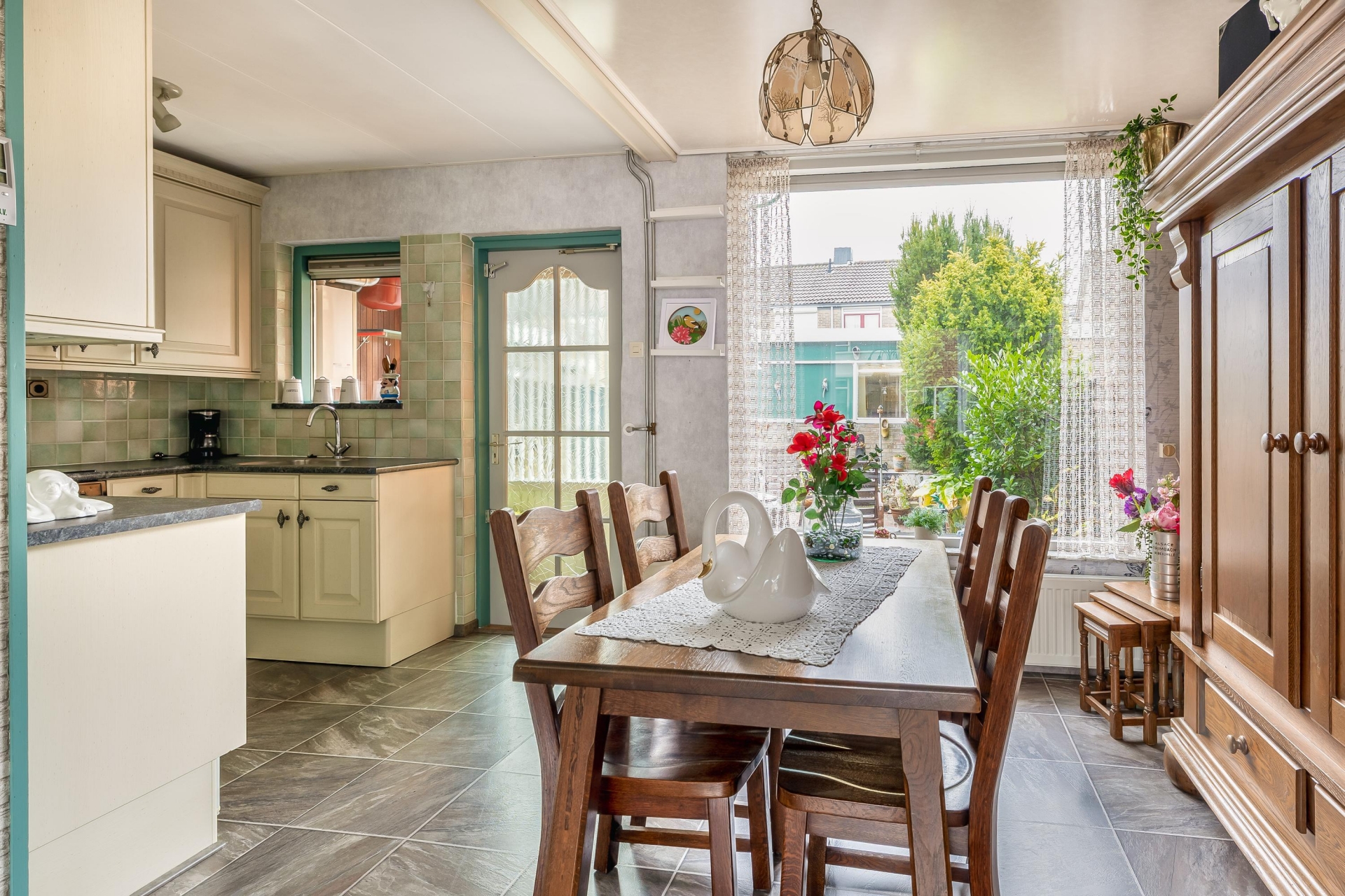 Via de woonkamer heb je direct zicht op de voortuin en het rustige straatbeeld — een fijne plek om te ontspannen na een werkdag of juist om lekker sociaal de dag te beginnen met een kop koffie in de ochtendzon.