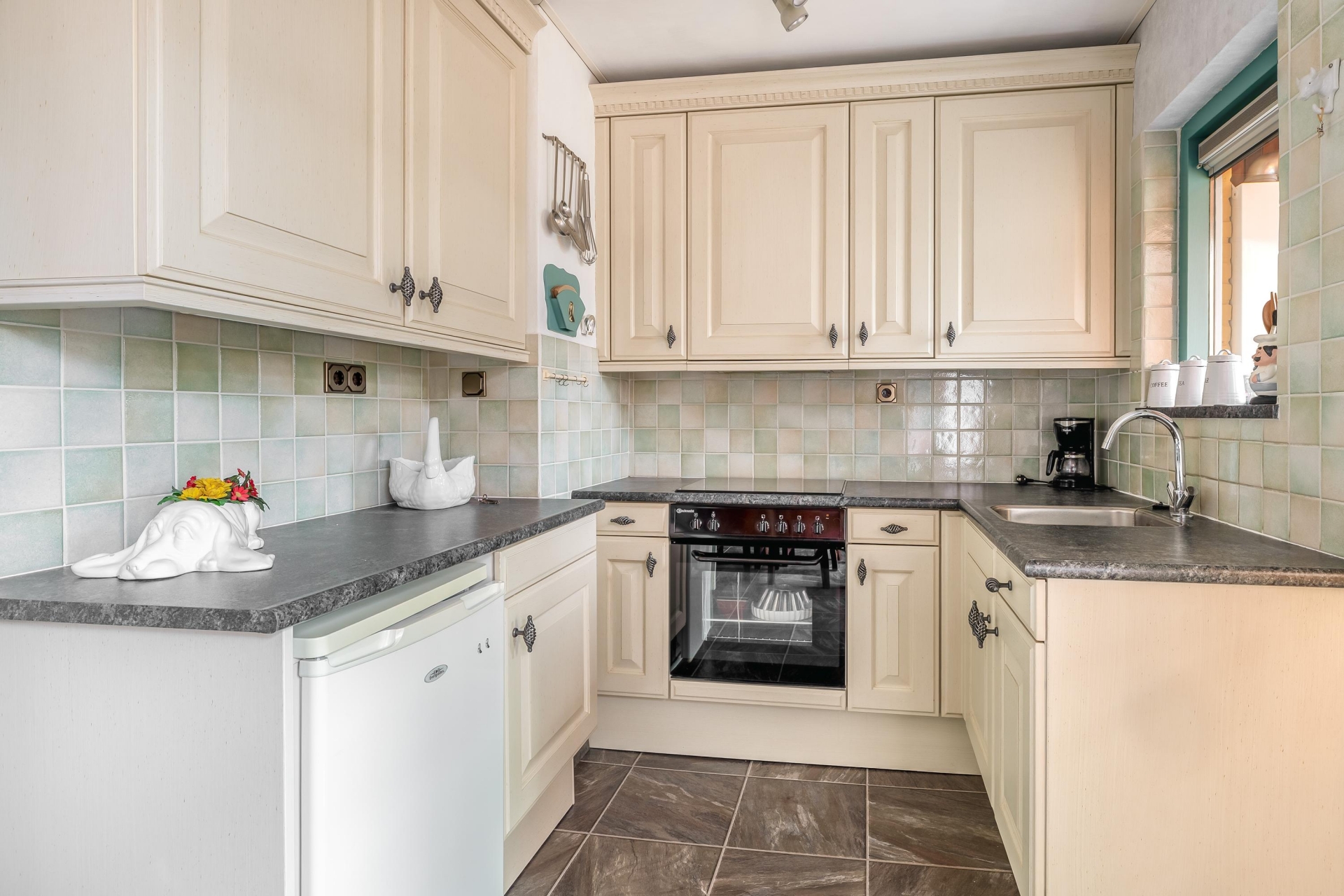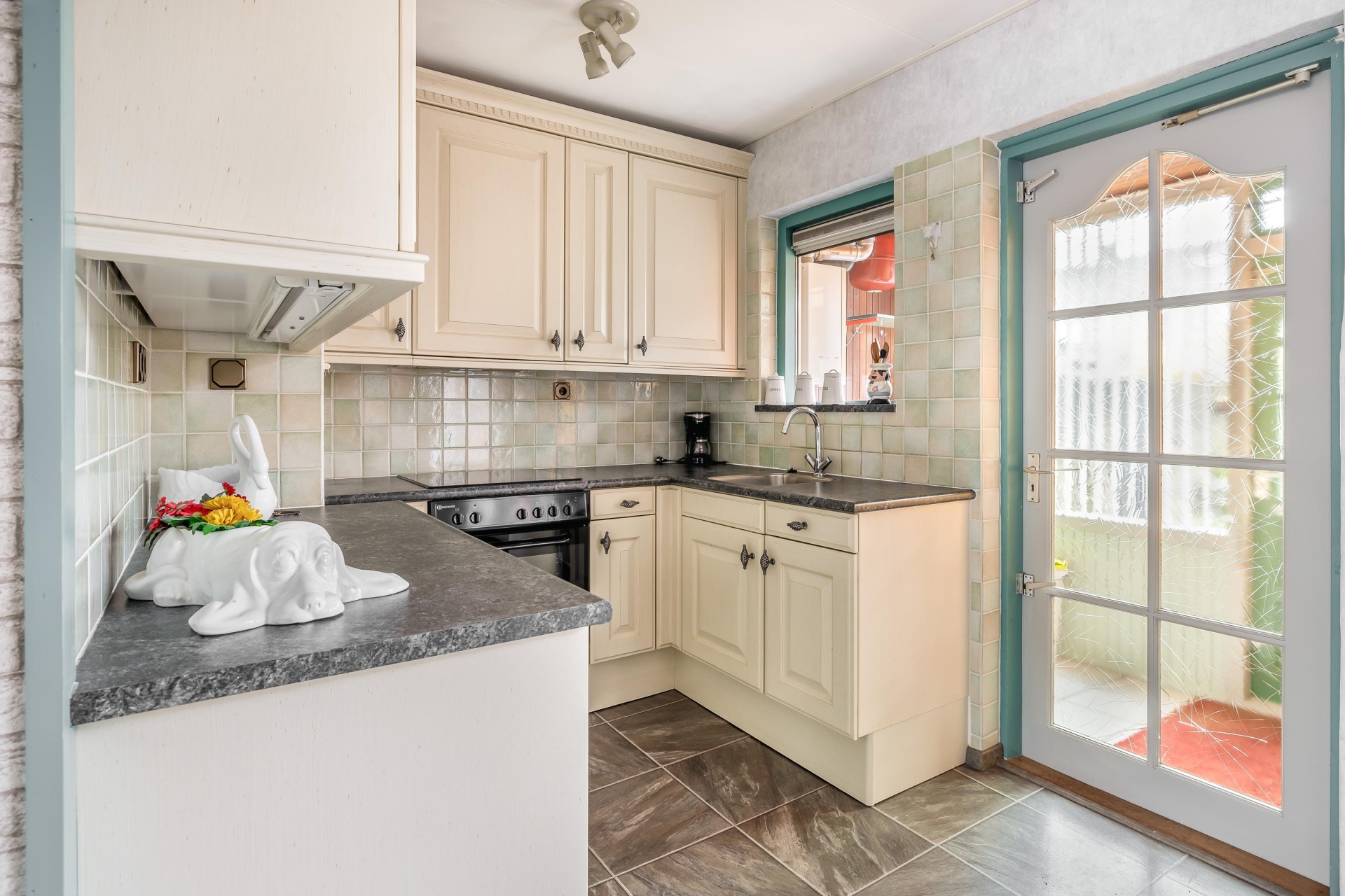Aan de achterzijde vind je een halfopen keuken met landelijke uitstraling. De opstelling in L-vorm zorgt voor veel werkruimte én opbergruimte, en de neutrale kleuren sluiten goed aan bij verschillende interieurstijlen. Er is een oven, kookplaat, afzuigkap en koelkast aanwezig. Vanuit de keuken stap je zo de bijkeuken in. Ook hier valt het daglicht prettig naar binnen dankzij het raam boven het aanrecht.