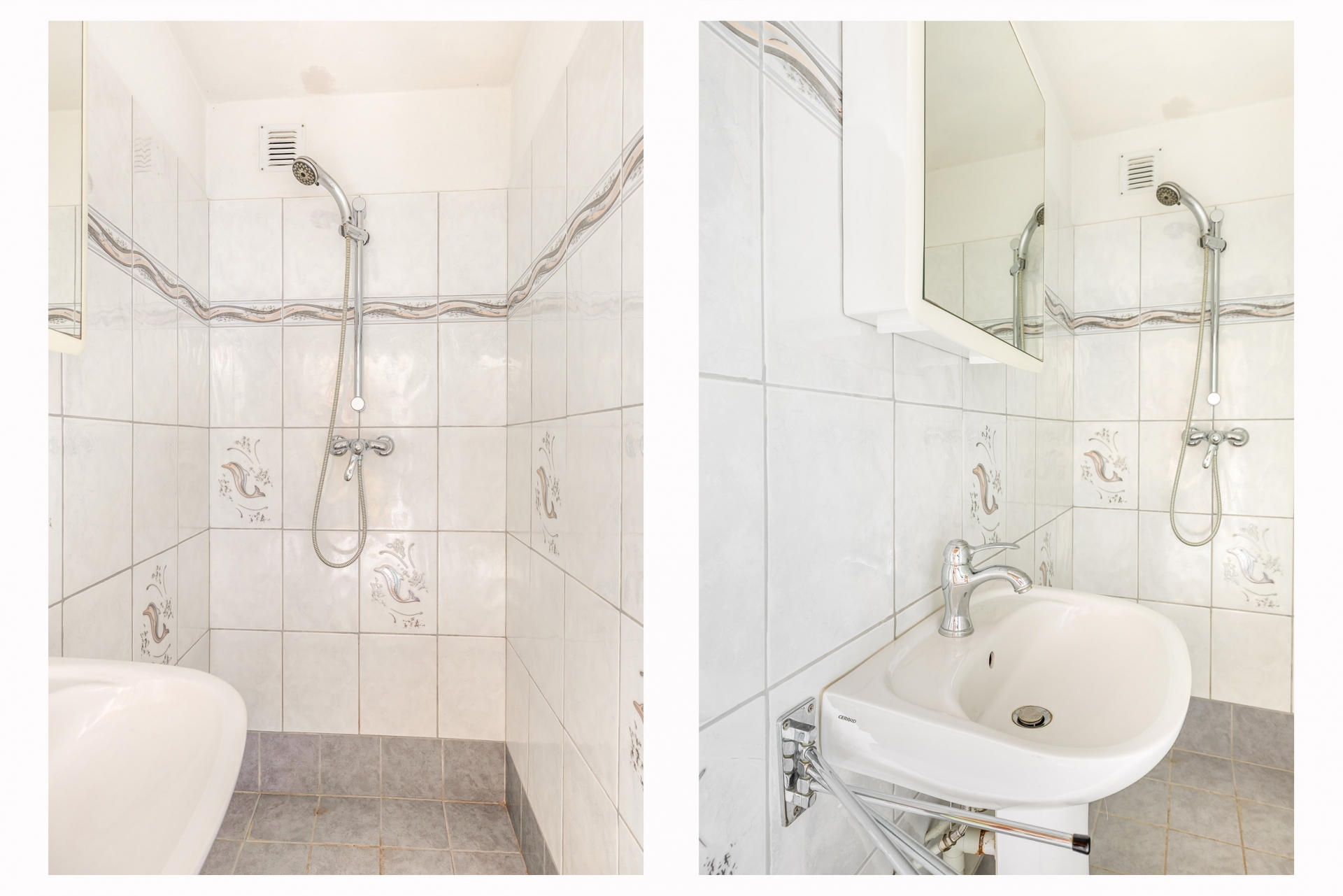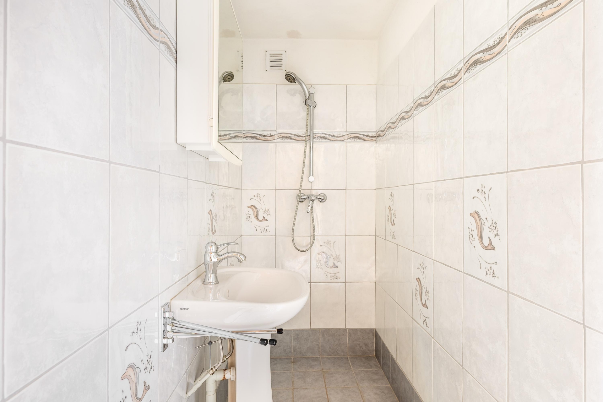 De badkamer is eenvoudig maar verzorgd en voorzien van douche en wastafel.