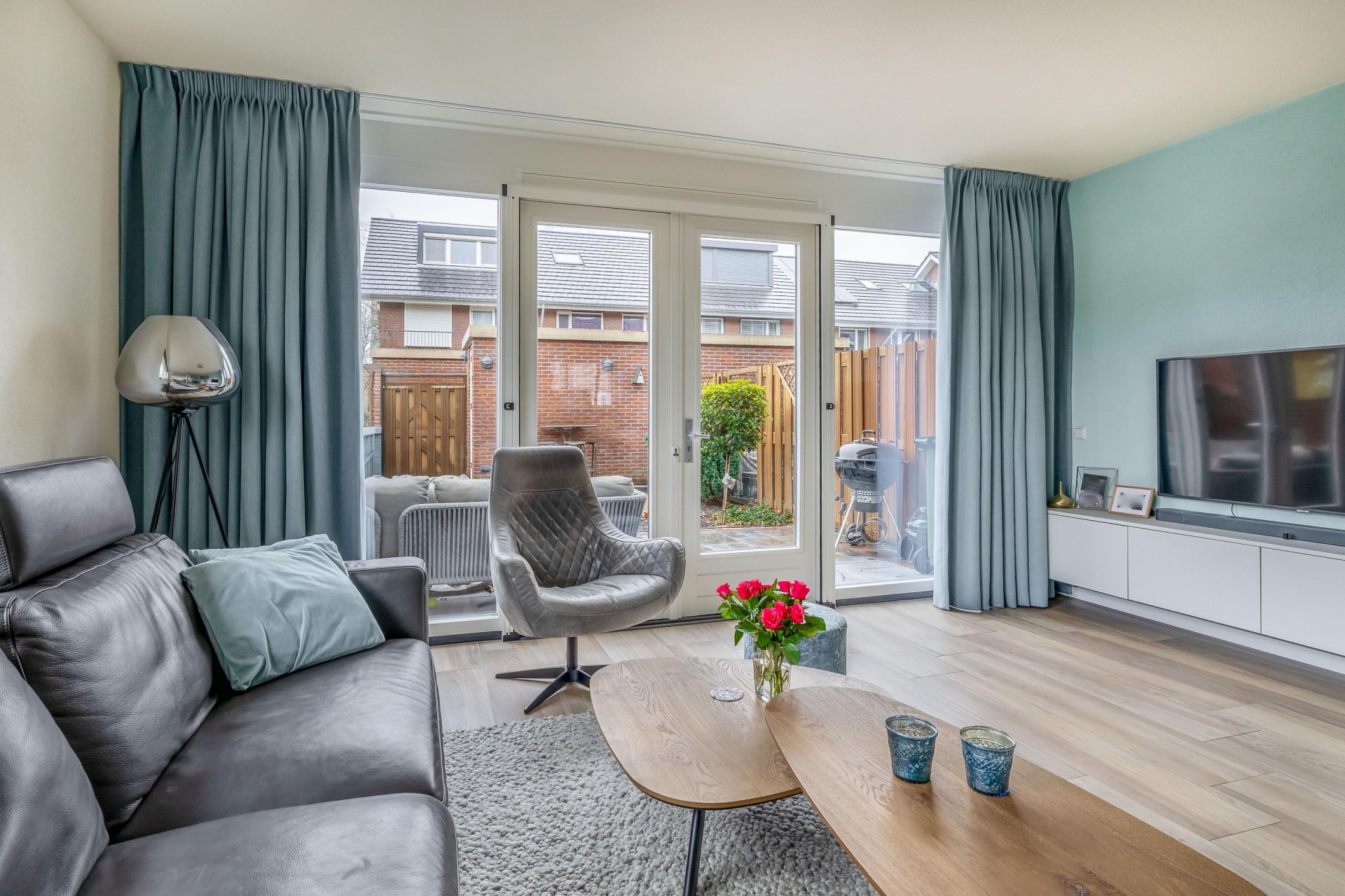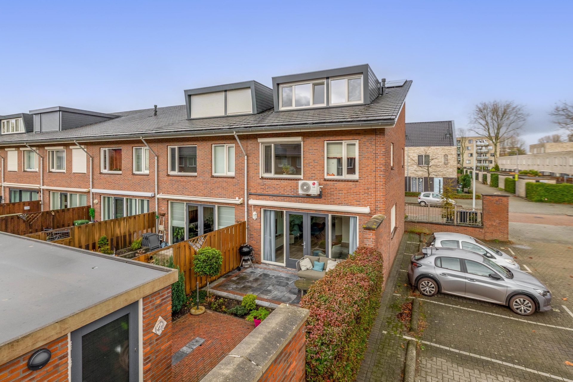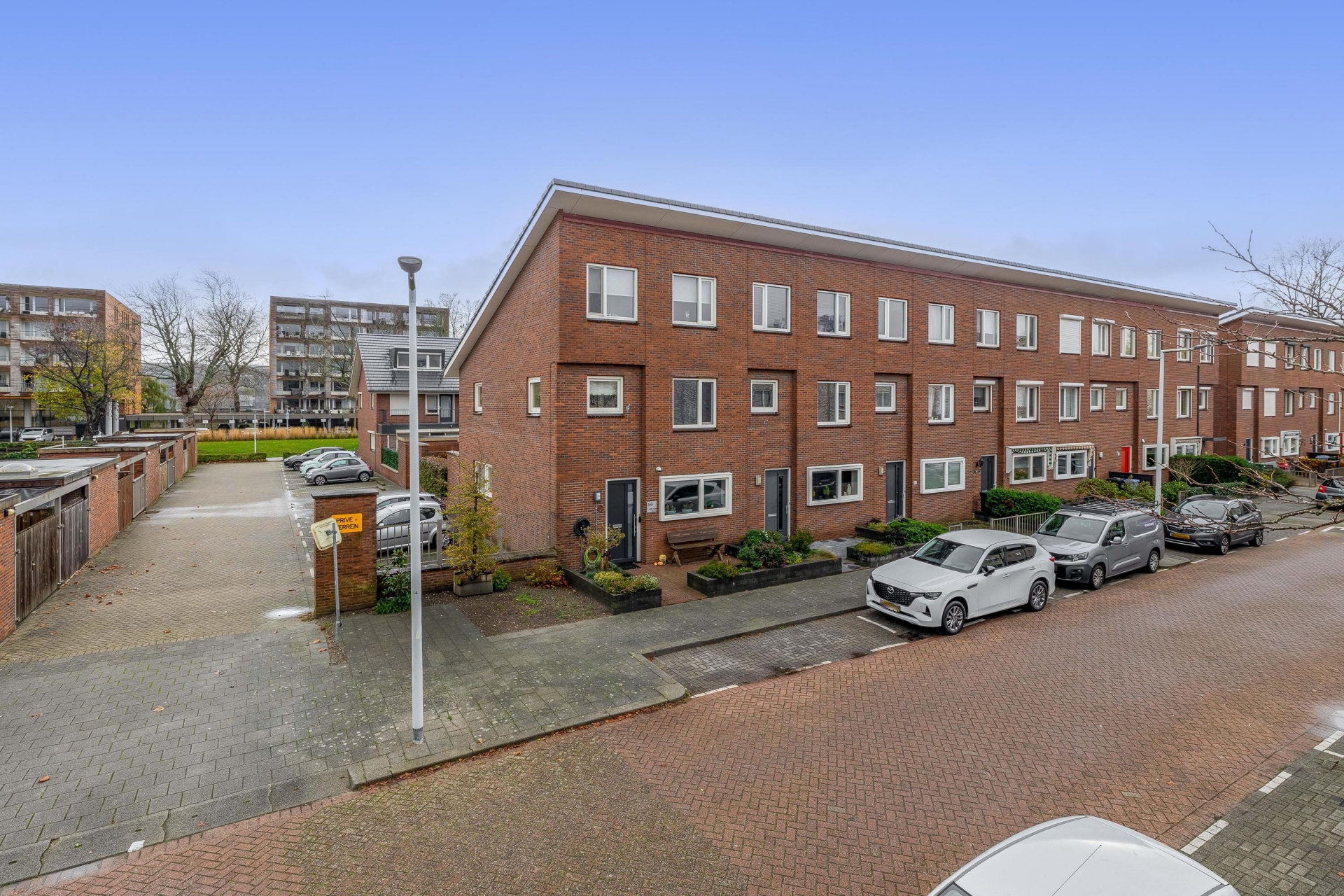 De achtertuin is keurig verzorgd en ligt op het zuidoosten, ideaal voor wie graag buiten zit in de zon. De tuin biedt ruimte voor een loungeset of buitentafel en is voorzien van een stenen berging met elektra. Via de achterom bereik je de eigen parkeerplaats op afgesloten terrein. Extra fijn: doordat het een hoekwoning is, heb je nét wat meer privacy en lichtinval.