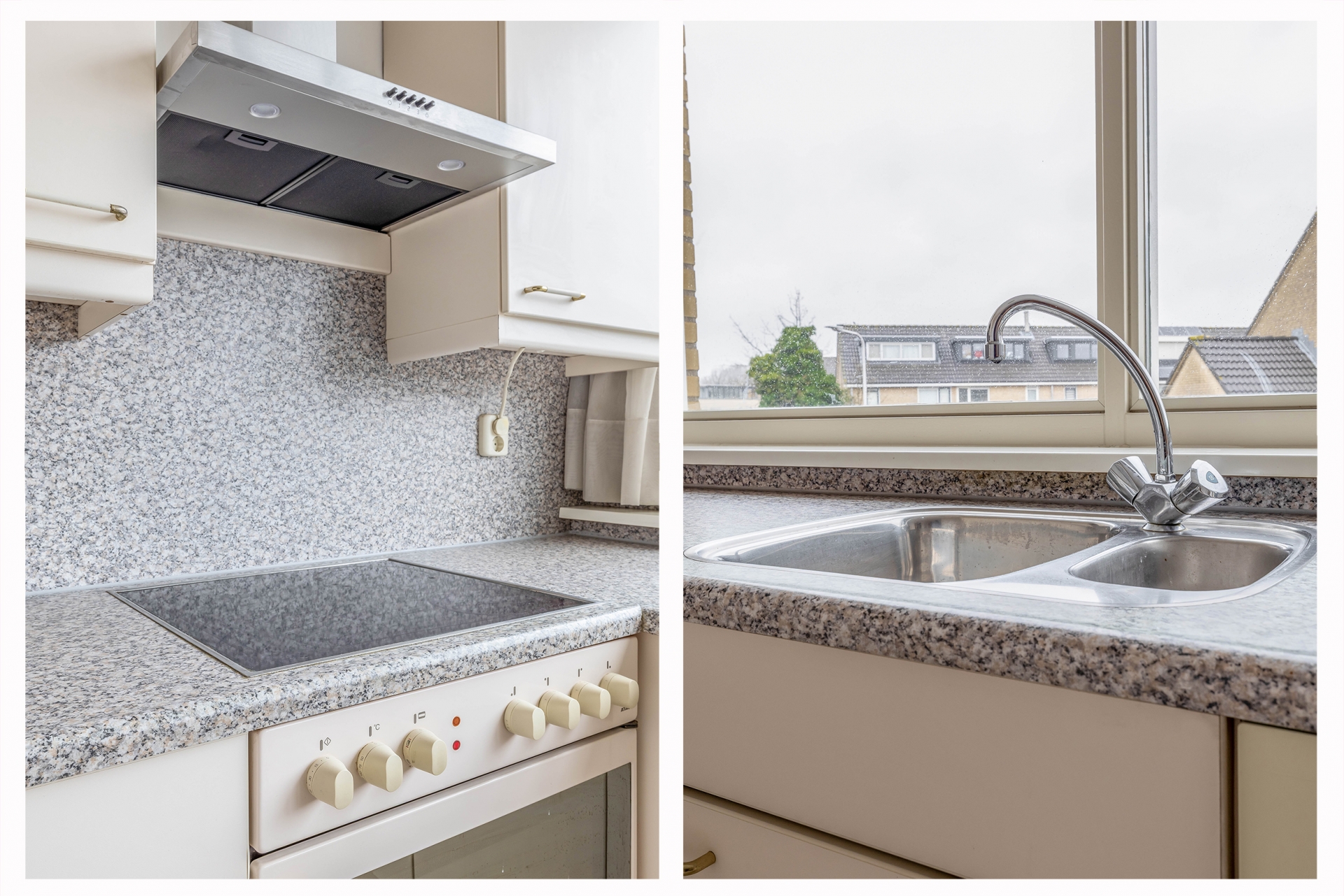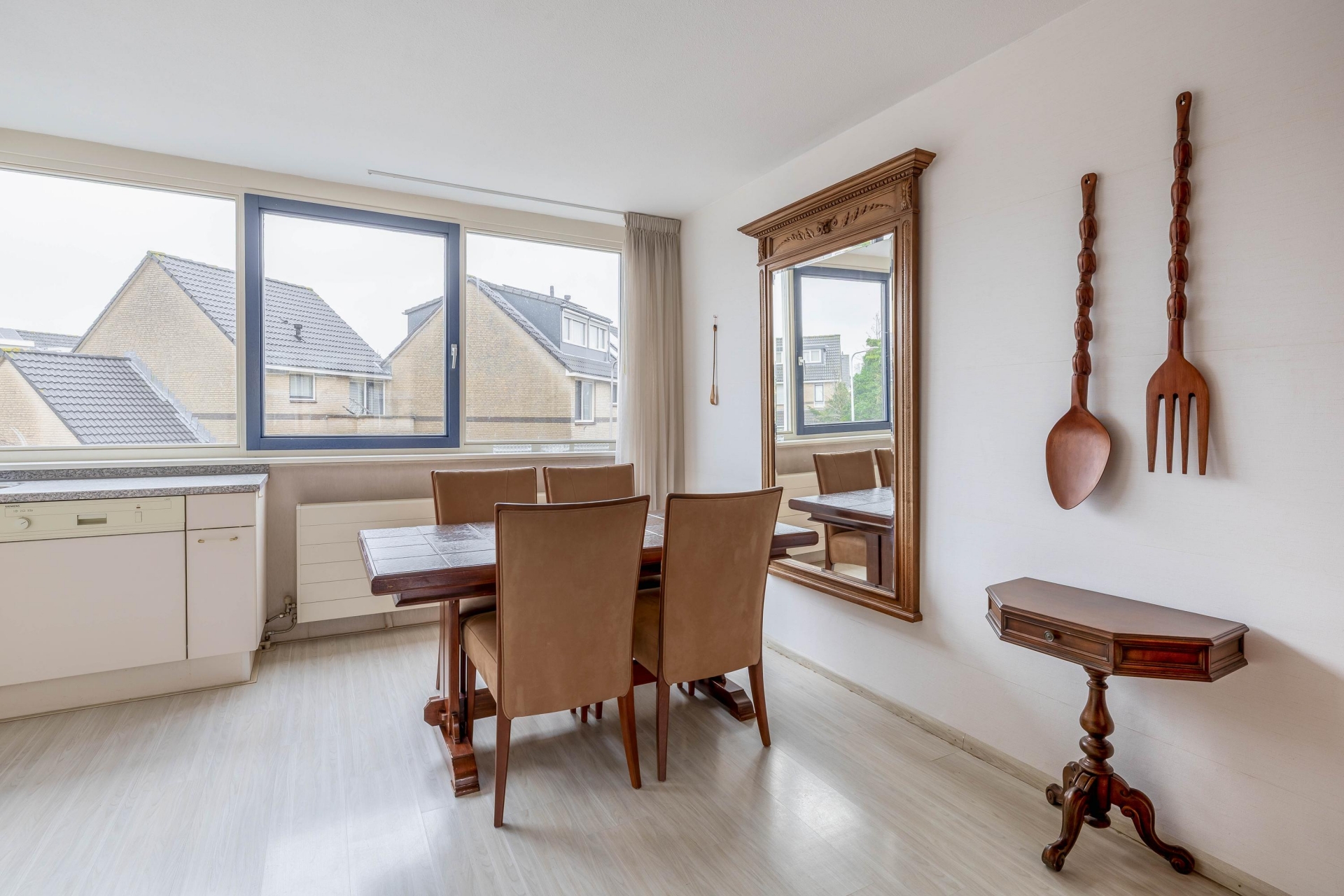 De keuken in L-opstelling is voorzien van diverse inbouw apparatuur (afzuigkap, keramische kookplaat, koel-vriescombinatie, spoelbak en vaatwasser).