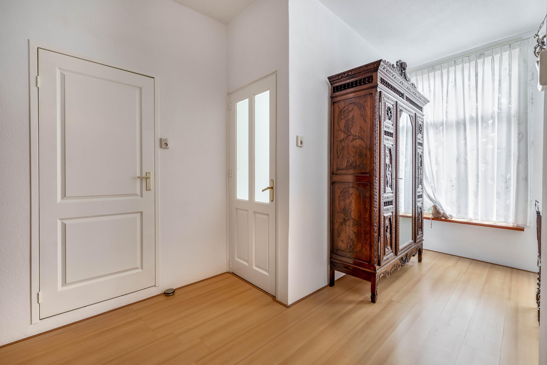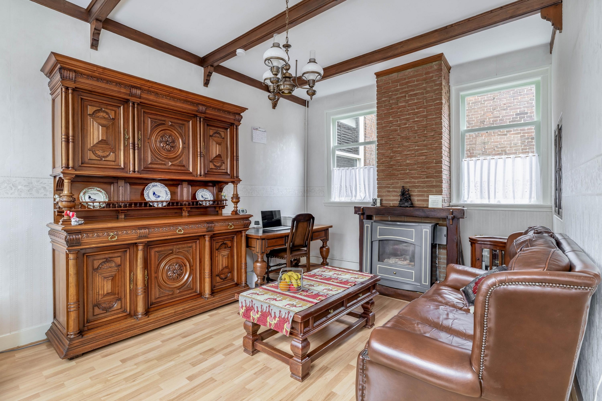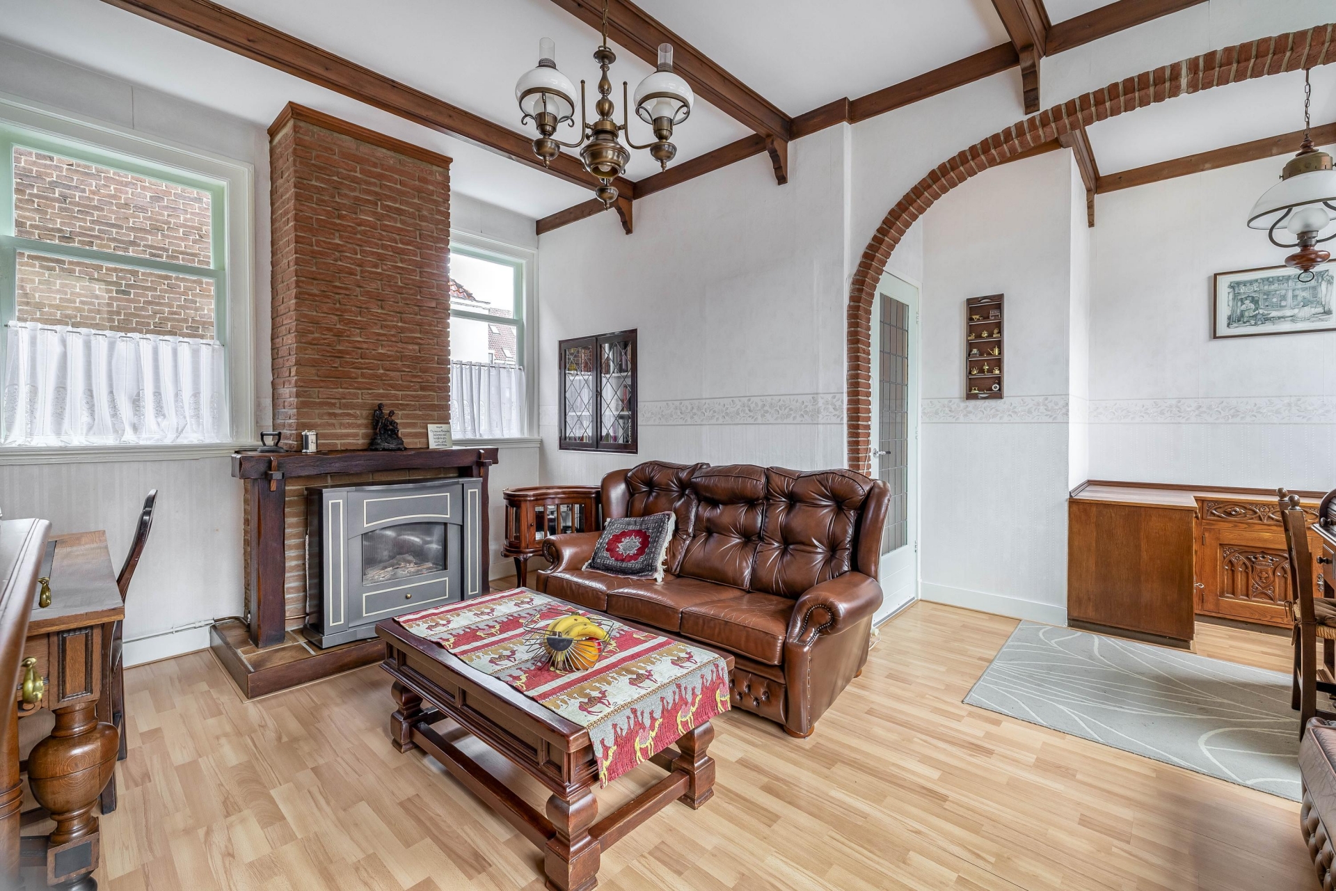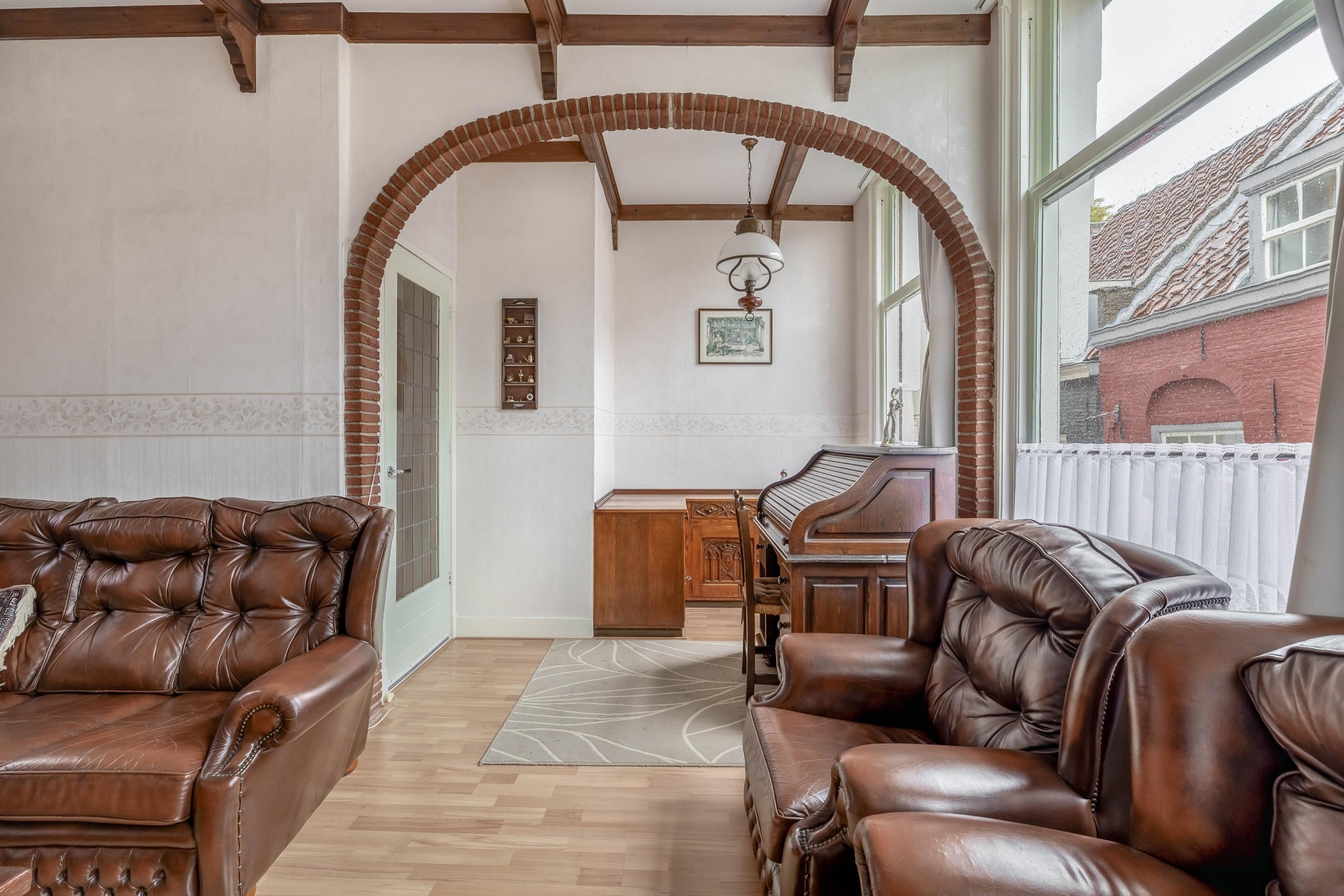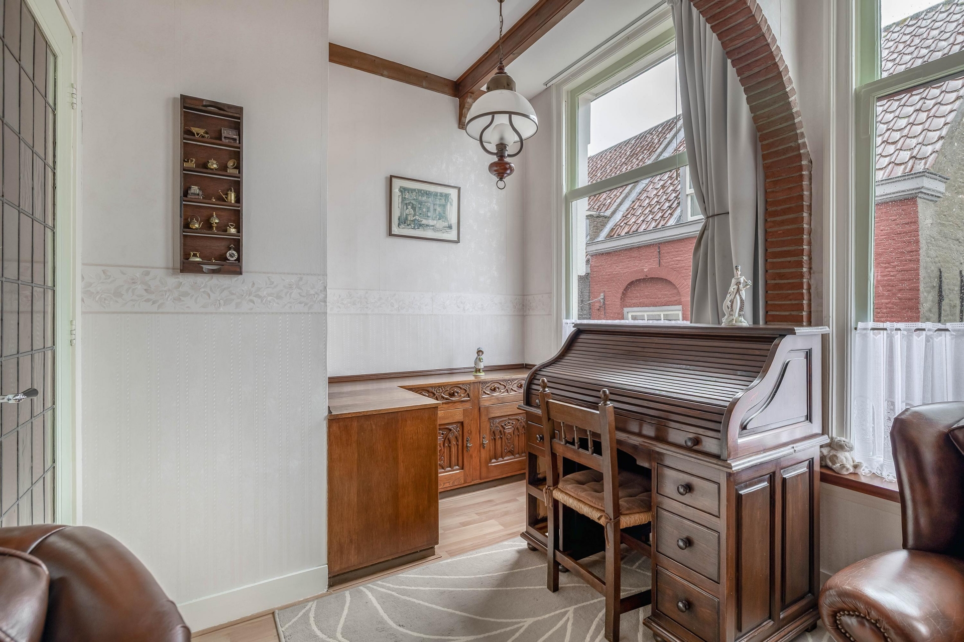 De woning straalt historie uit, met prachtige hoge plafonds, houten balken en klassieke raampartijen die het daglicht royaal binnenlaten. De woonkamer aan de voorzijde is sfeervol ingericht met originele details zoals de fraaie toog, houten kozijnen en brede raampartijen. Hier is de tijd op een mooie manier stil blijven staan, maar met voldoende ruimte om het geheel naar eigen smaak en comfort te moderniseren.
