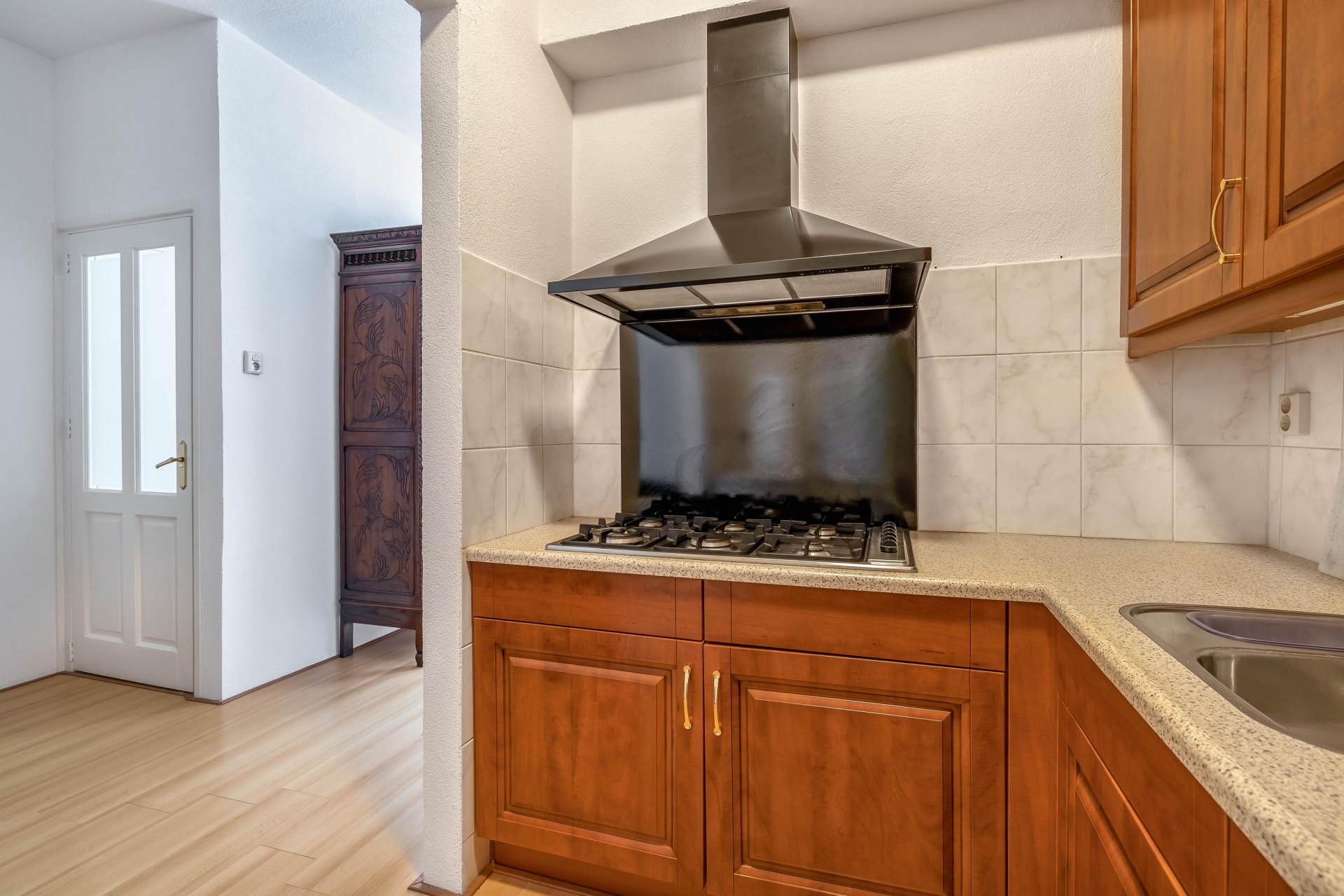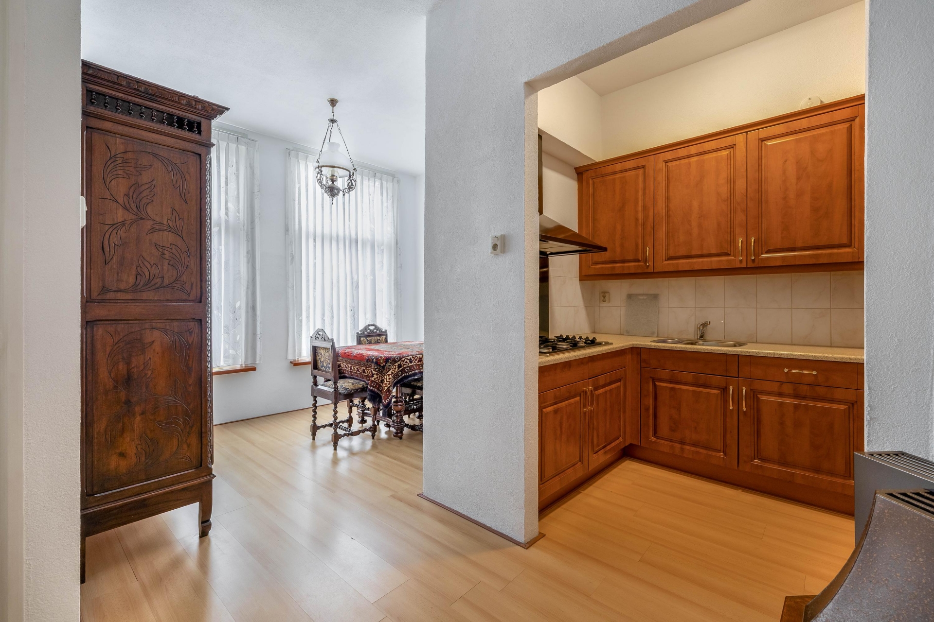 Achter de woonkamer bevindt zich de aparte keuken, voorzien van een klassieke houten keukenopstelling met veel kastruimte en diverse inbouwapparatuur. De keuken is functioneel en verzorgd, en sluit goed aan op de authentieke uitstraling van het huis. Vanuit de eetkamer heb je ook toegang tot de badkamer, die eenvoudig is uitgevoerd en voorzien van een douche, wastafel en toilet.