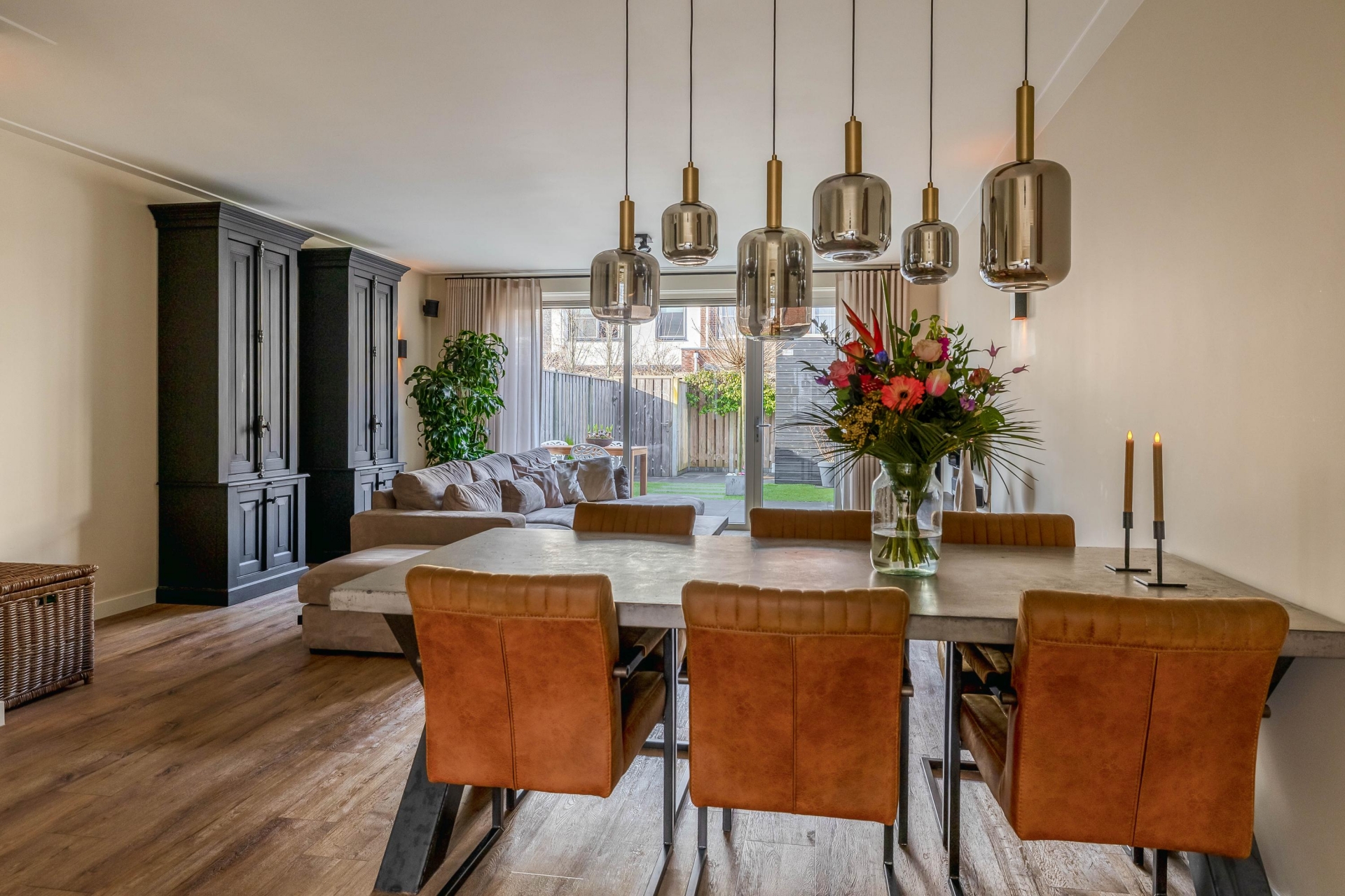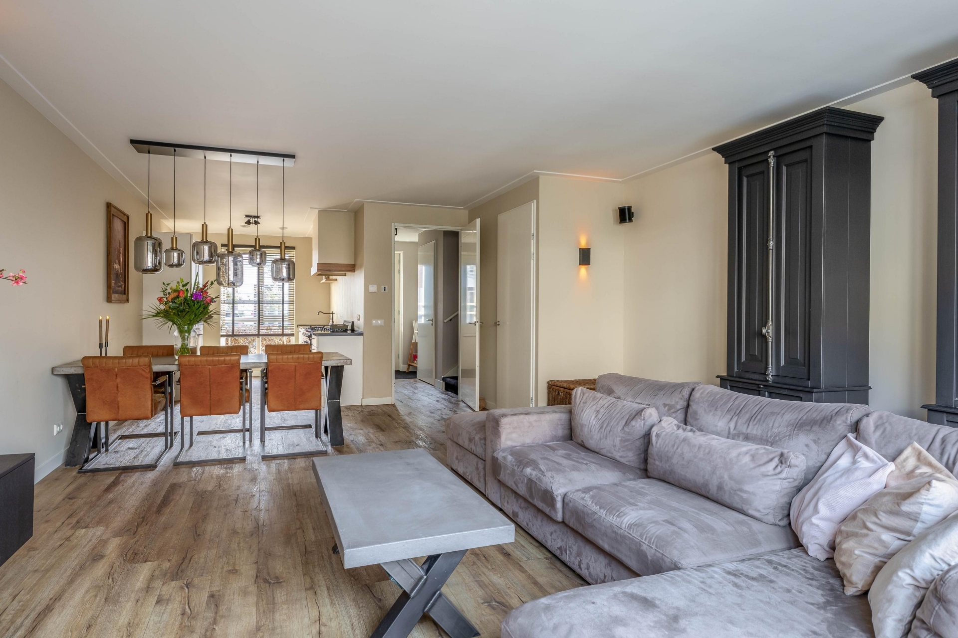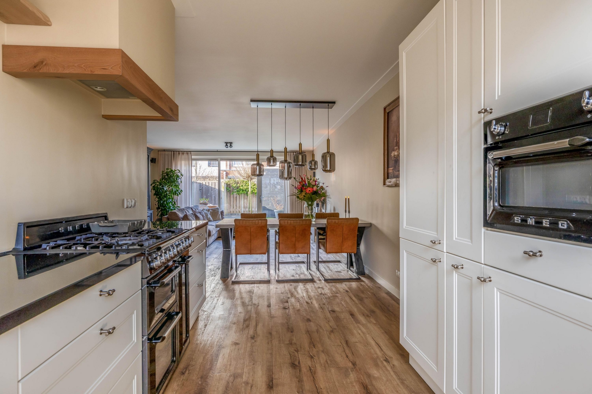 Stap binnen in de verrassend ruime woonkamer met uitbouw. Dankzij de grote raampartijen geniet je hier van veel natuurlijk licht en een prettige verbinding tussen binnen en buiten. De royale indeling biedt veel ruimte voor een comfortabele zithoek en een grote eettafel. De stijlvolle open keuken is volledig voorzien van luxe inbouwapparatuur. Dankzij de vloerverwarming geniet je van een aangename warmte en een strak afgewerkt interieur zonder radiatoren in het zicht. Kortom; deze mooie woning biedt alles wat je zoekt. Instapklaar, een zonnige achtertuin, veel ruimte én een rustige ligging.