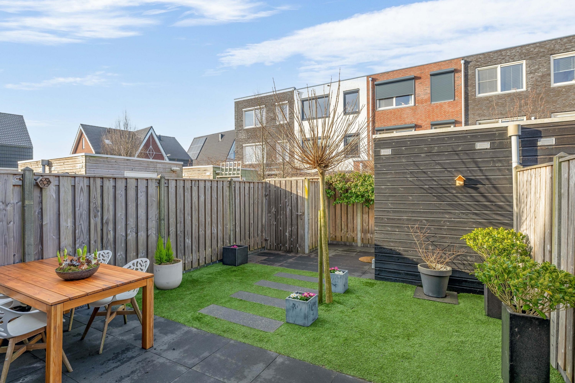 De tuin is een echt pluspunt: praktisch, onderhoudsarm en gelegen op het Noordwesten. Hier kun je tot de late middag heerlijk van de zon genieten. Er is voldoende ruimte voor een loungeset, speeltoestel of een grote eettafel voor gezellige zomerse avonden. Er is een berging en achterom.