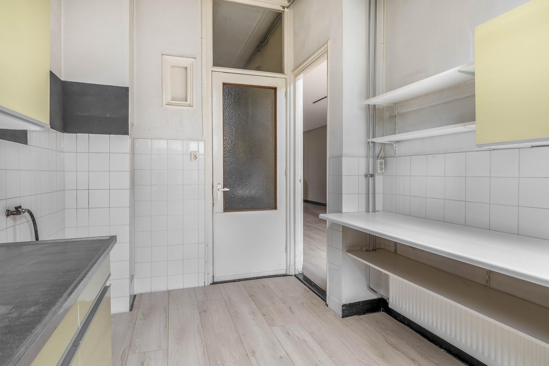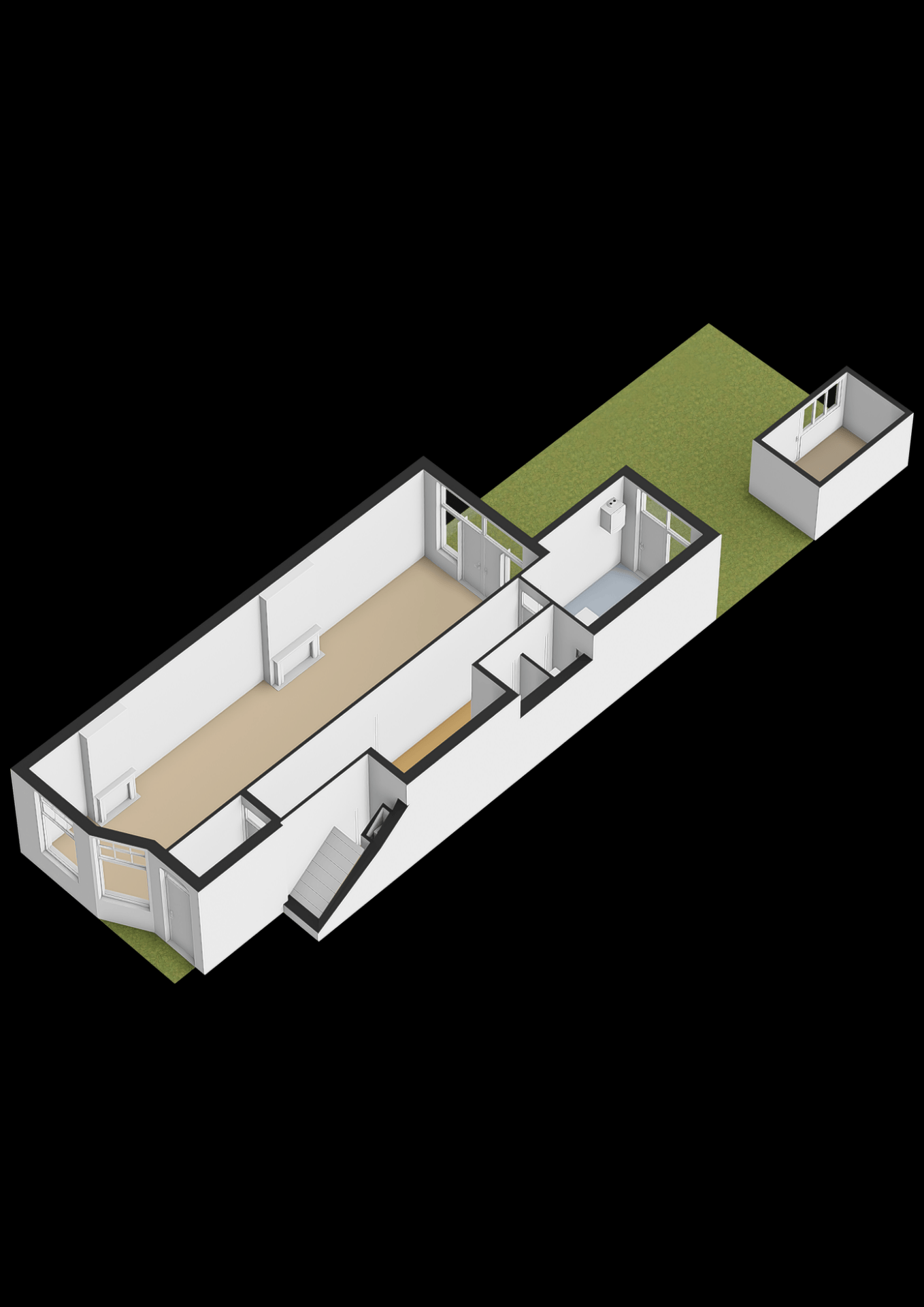 Entree via vestibule; gang met meterkast en bergkast; toilet met fontein; zeer riante woon-/eetkamer (voormalig en suite); keuken, voorzien van eenvoudig blok en opstelplaats c.v.-ketel; achtertuin met stenen berging; binnentrap naar 1e etage.