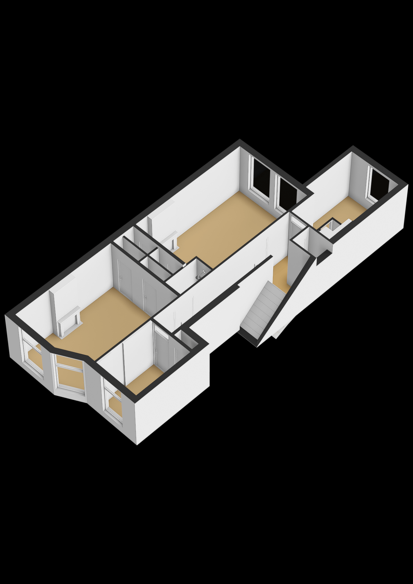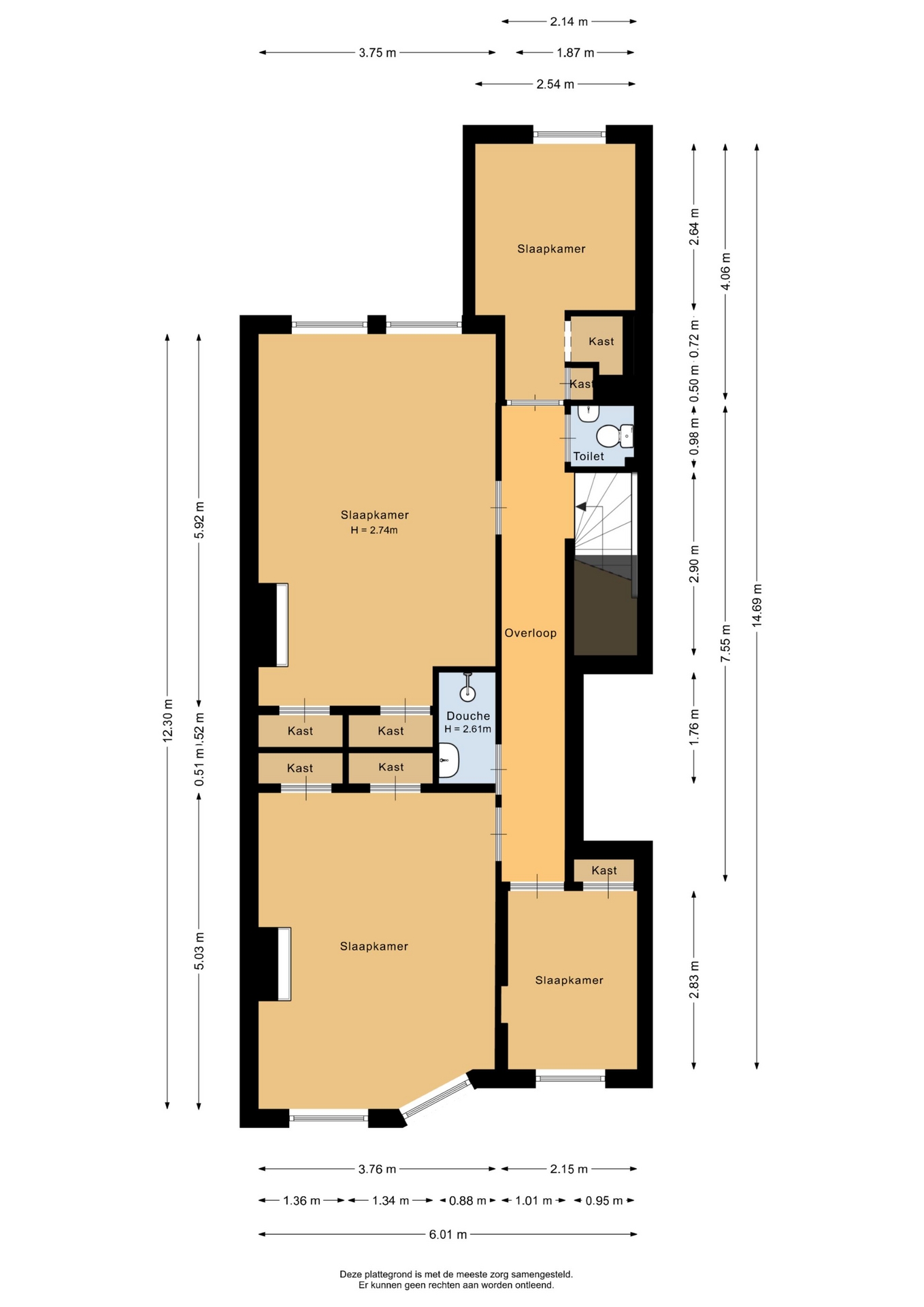 Overloop; doucheruimte; voorzijkamer; voorkamer, voorzien van 2 vaste kasten; achterkamer, voorzien van 2 vaste kasten.