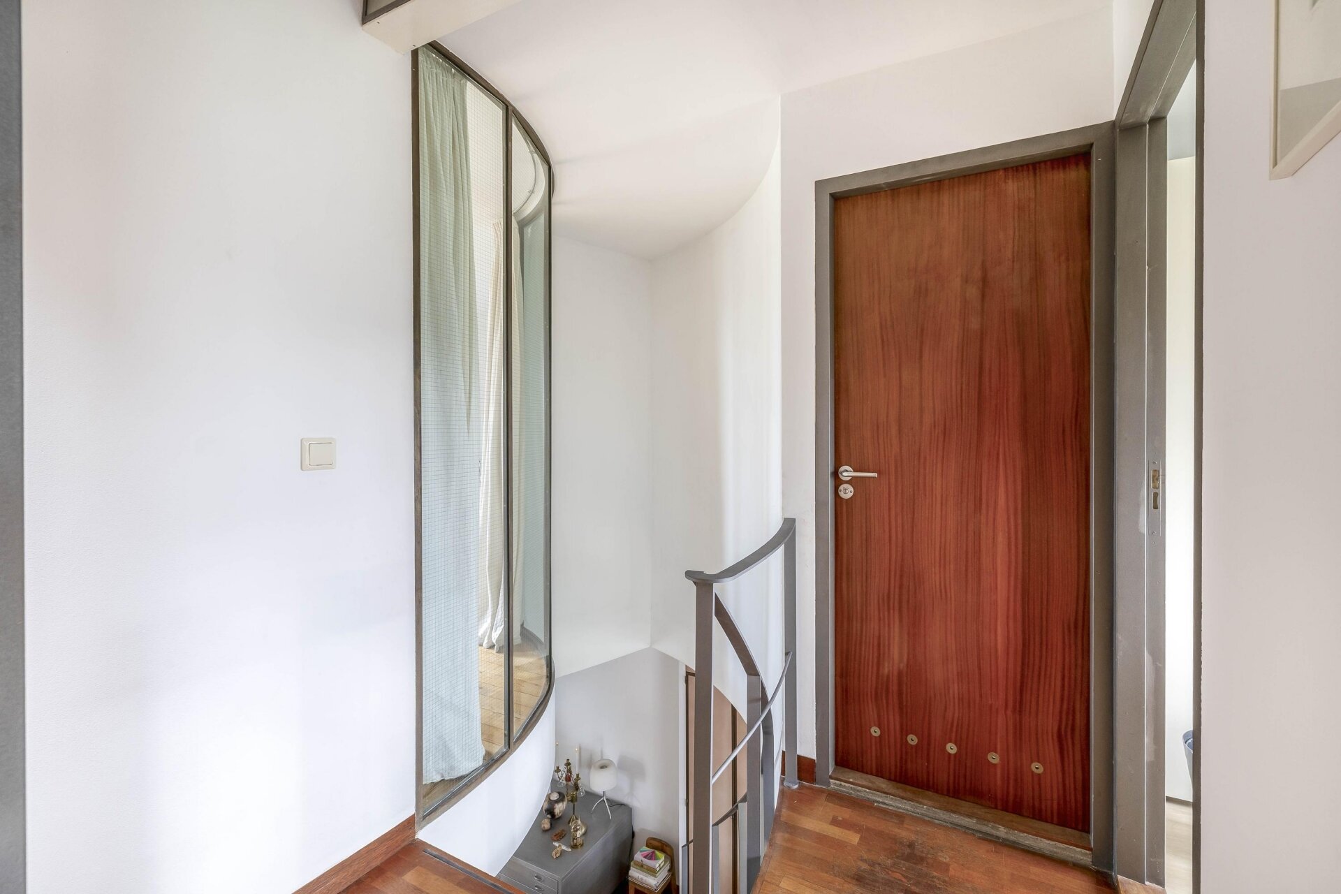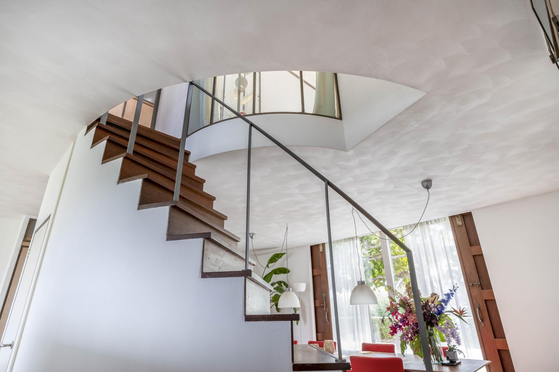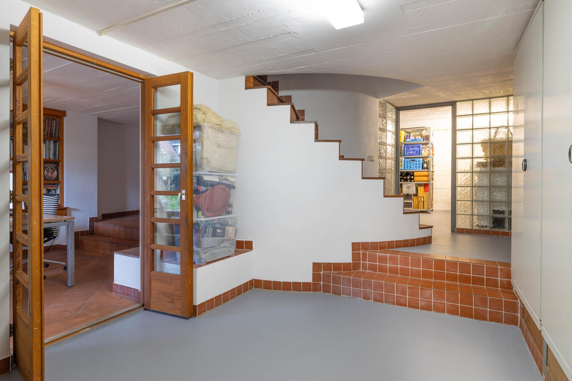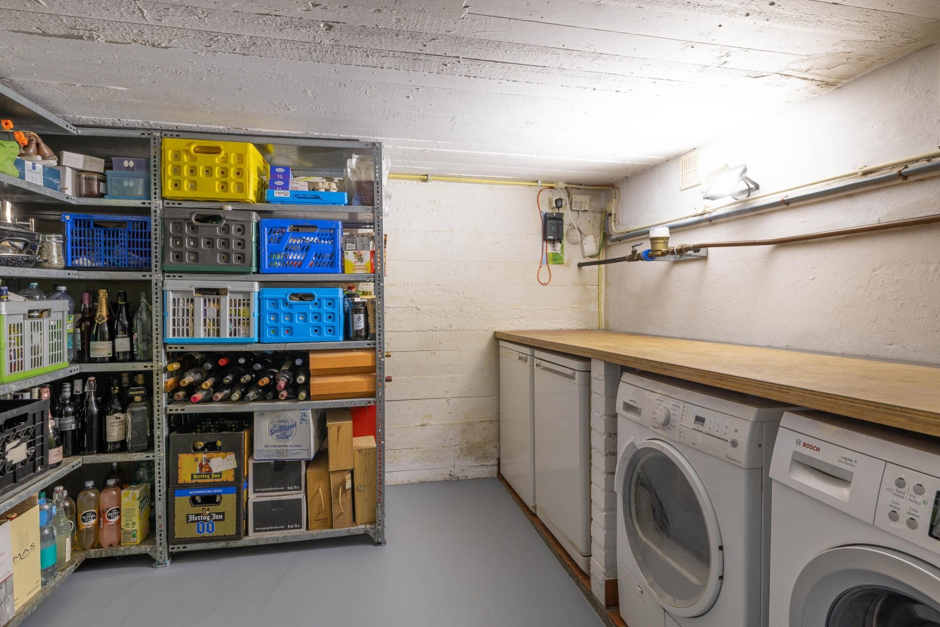 Daarnaast zijn er twee ruime bergingen, ideaal voor opslag, fietsen of gereedschap. In één van de bergingen bevinden zich tevens de aansluitingen voor wasmachine en droger. De hoogteverschillen in het souterrain (tot circa 2,30 m) geven de ruimte een speels karakter en benadrukken het unieke ontwerp van het huis.