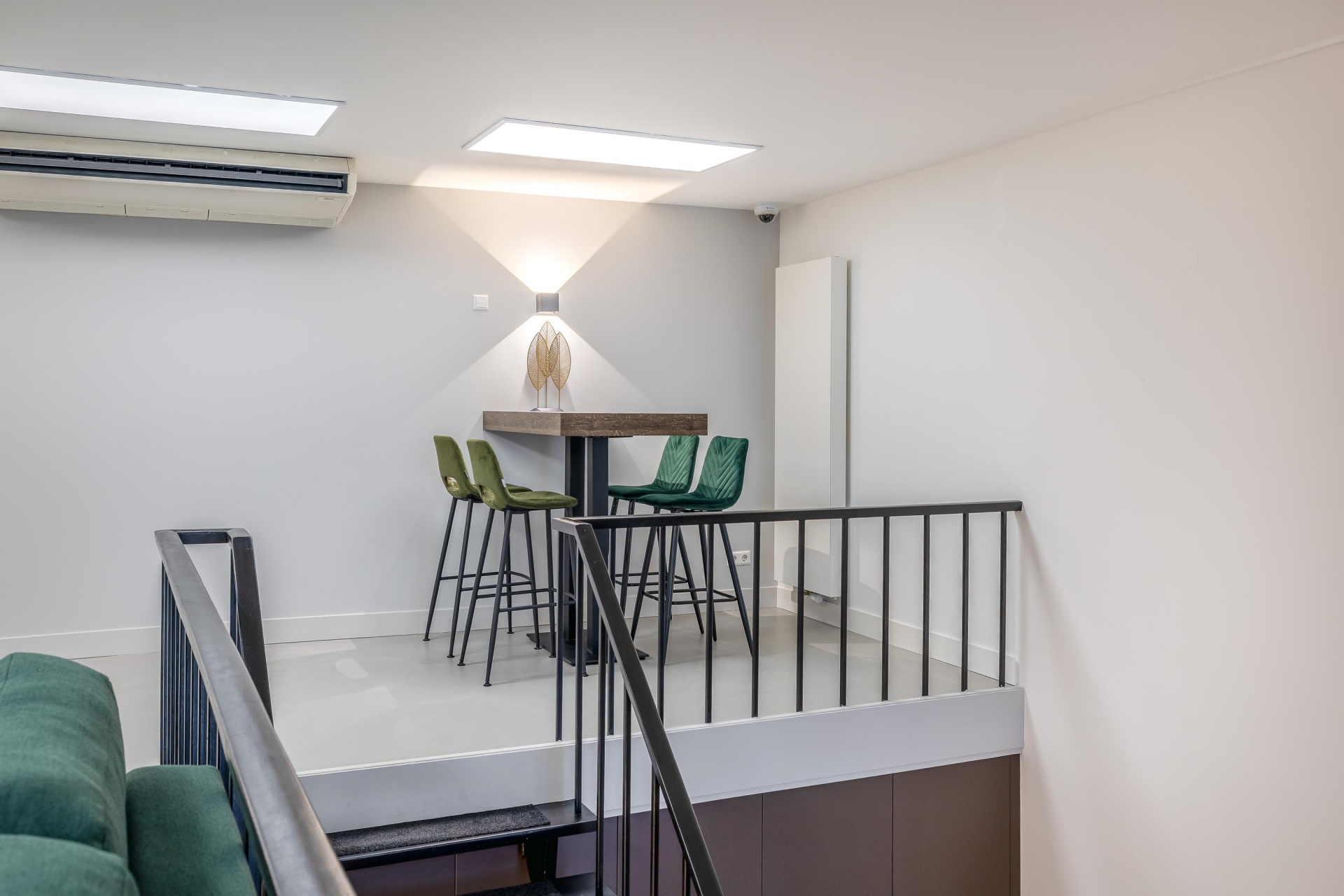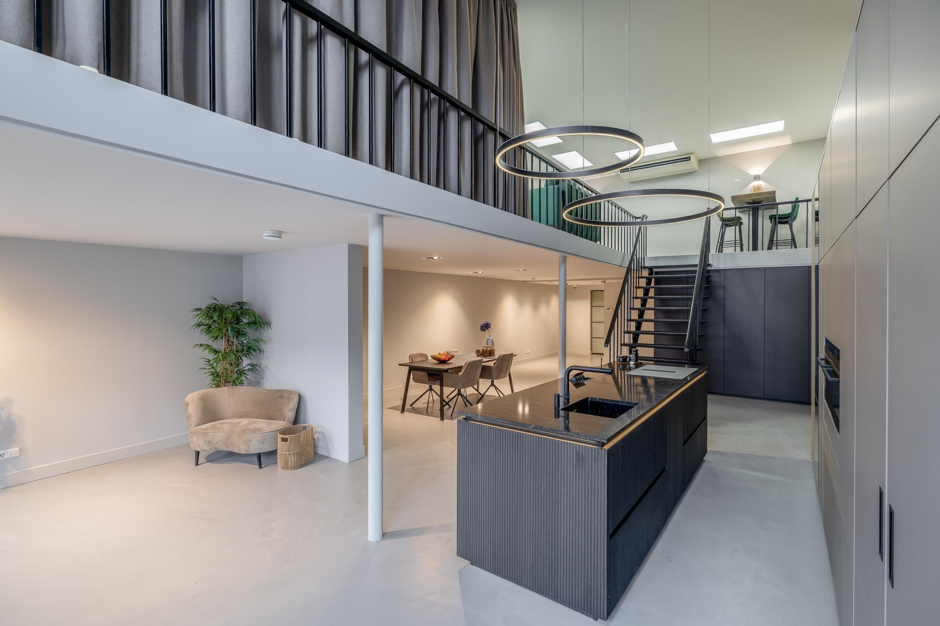De 1e verdieping is een fraaie open vide en kan gebruikt worden als slaapkamer maar kan ook nog gesplitst worden.