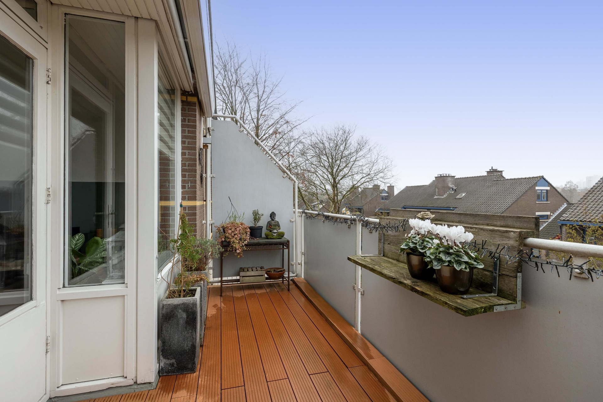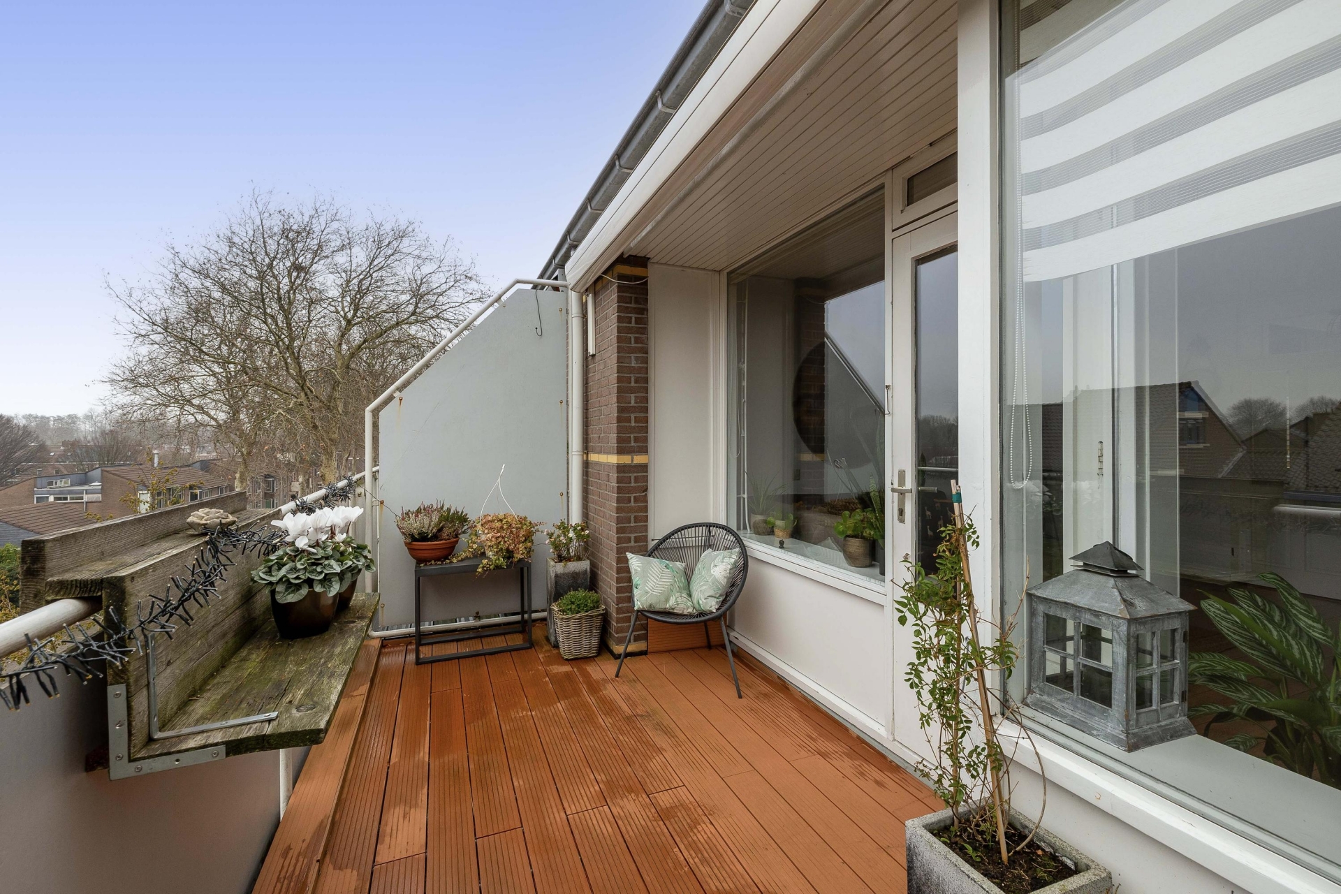Vanuit de woonkamer stap je zo het ruime balkon op, een heerlijke plek om in de middag en avond van de zon te genieten. De houtlook vlonderdelen en de aankleding zorgen voor een knusse sfeer: perfect voor een kop koffie in de ochtend of een borrelmoment aan het einde van de dag.