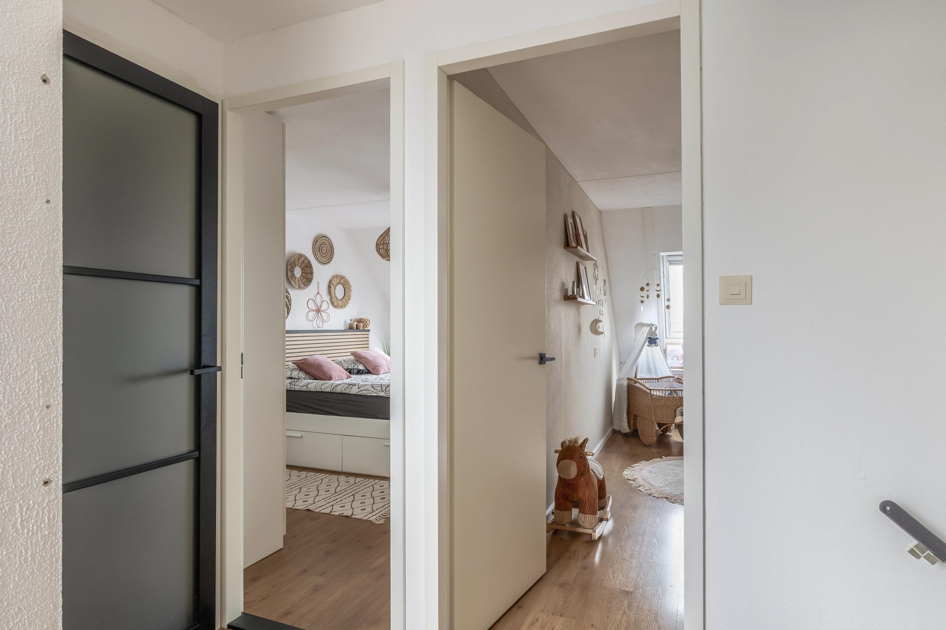 De woning telt in totaal twee ruime slaapkamers, beide gelegen op de bovenverdieping. De grootste slaapkamer is ideaal als master bedroom, terwijl de tweede kamer ook goed dienst kan doen als kinderkamer of logeerkamer, werkkamer of hobbyruimte. Ook hier vind je dezelfde nette afwerking en prettige lichtinval.