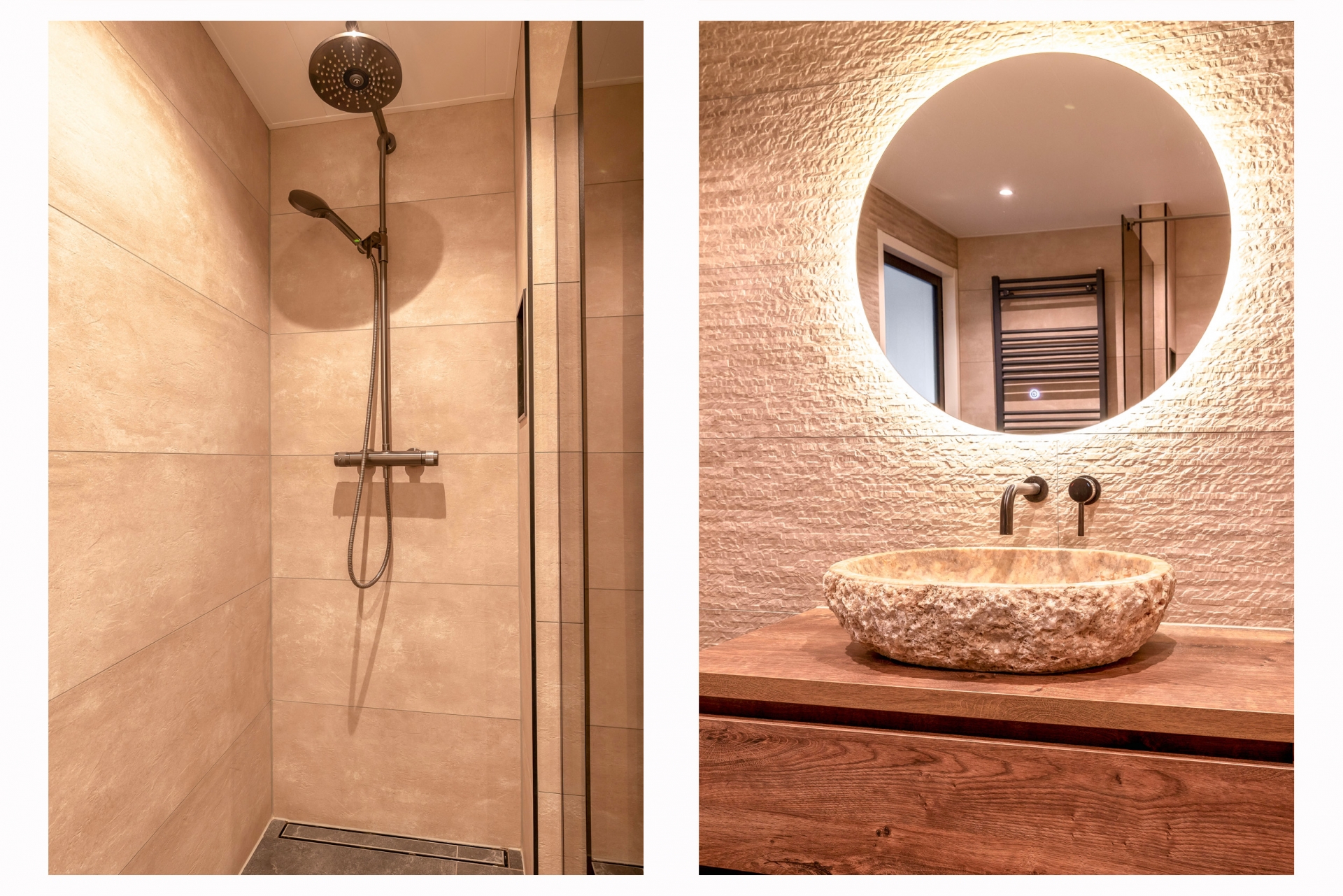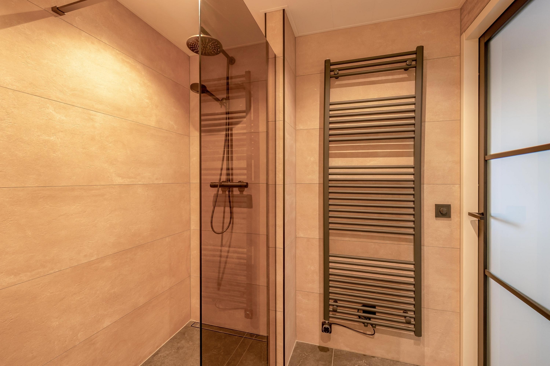 De badkamer is stijlvol en recent vernieuwd, voorzien van inloopdouche, wastafelmeubel en toilet.
