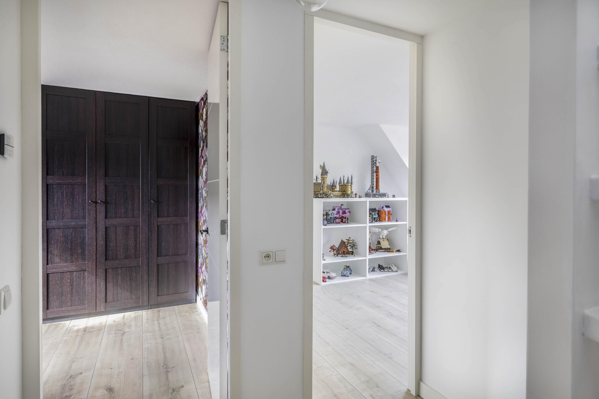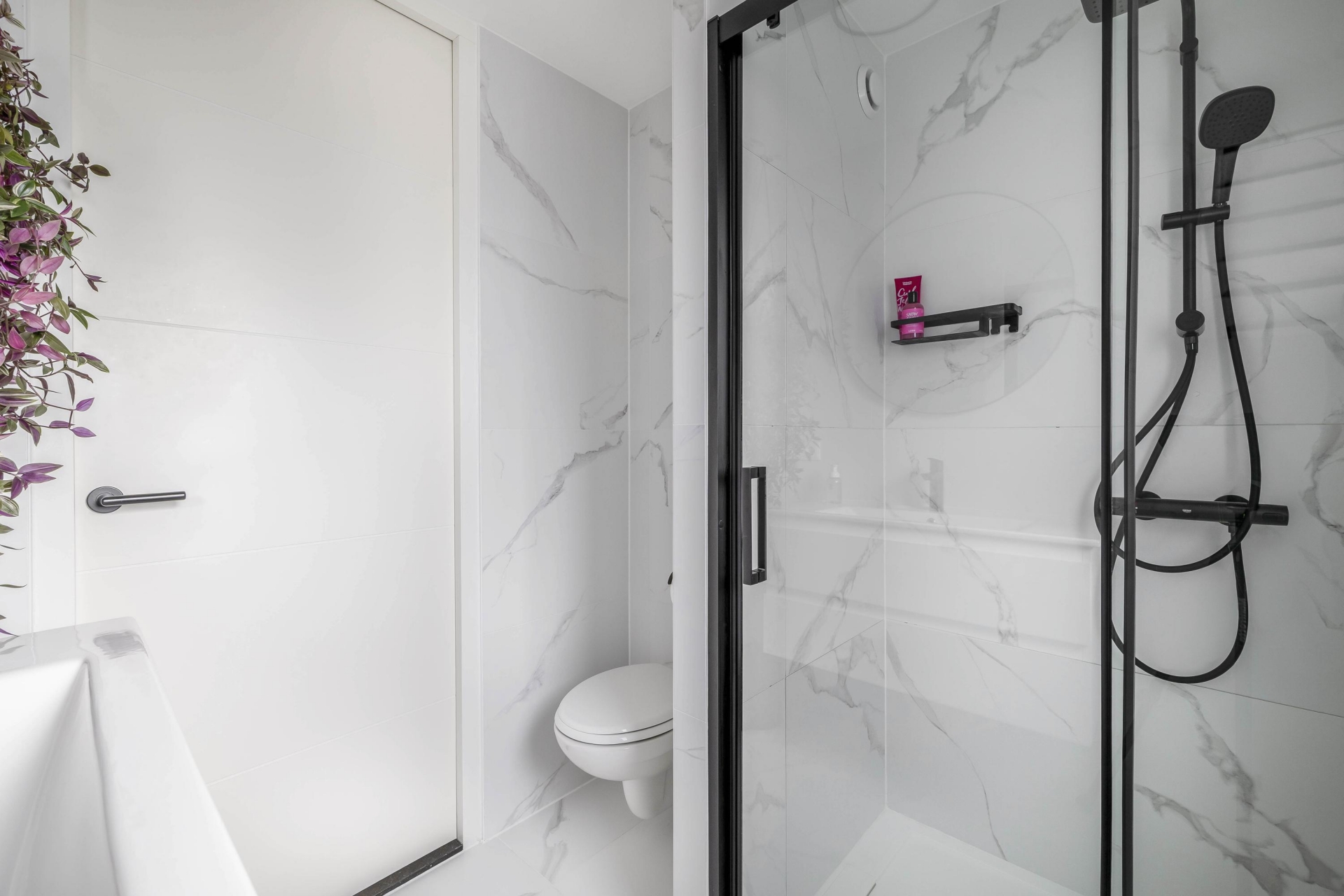 Ook de bovenverdiepingen zijn volledig aangepakt. De badkamer is in 2021 vernieuwd en uitgevoerd in een stijlvolle marmerlook met zwart sanitair. Hier vind je een ruime inloopdouche, wastafelmeubel met spiegel en een tweede toilet. Er zijn drie slaapkamers, waarvan twee zeer ruim. Oorspronkelijk waren dit er vier, maar de huidige eigenaren hebben gekozen voor meer ruimte en comfort. Een kunststof dakkapel aan de achterzijde vergroot de bovenverdieping en zorgt voor extra licht.
