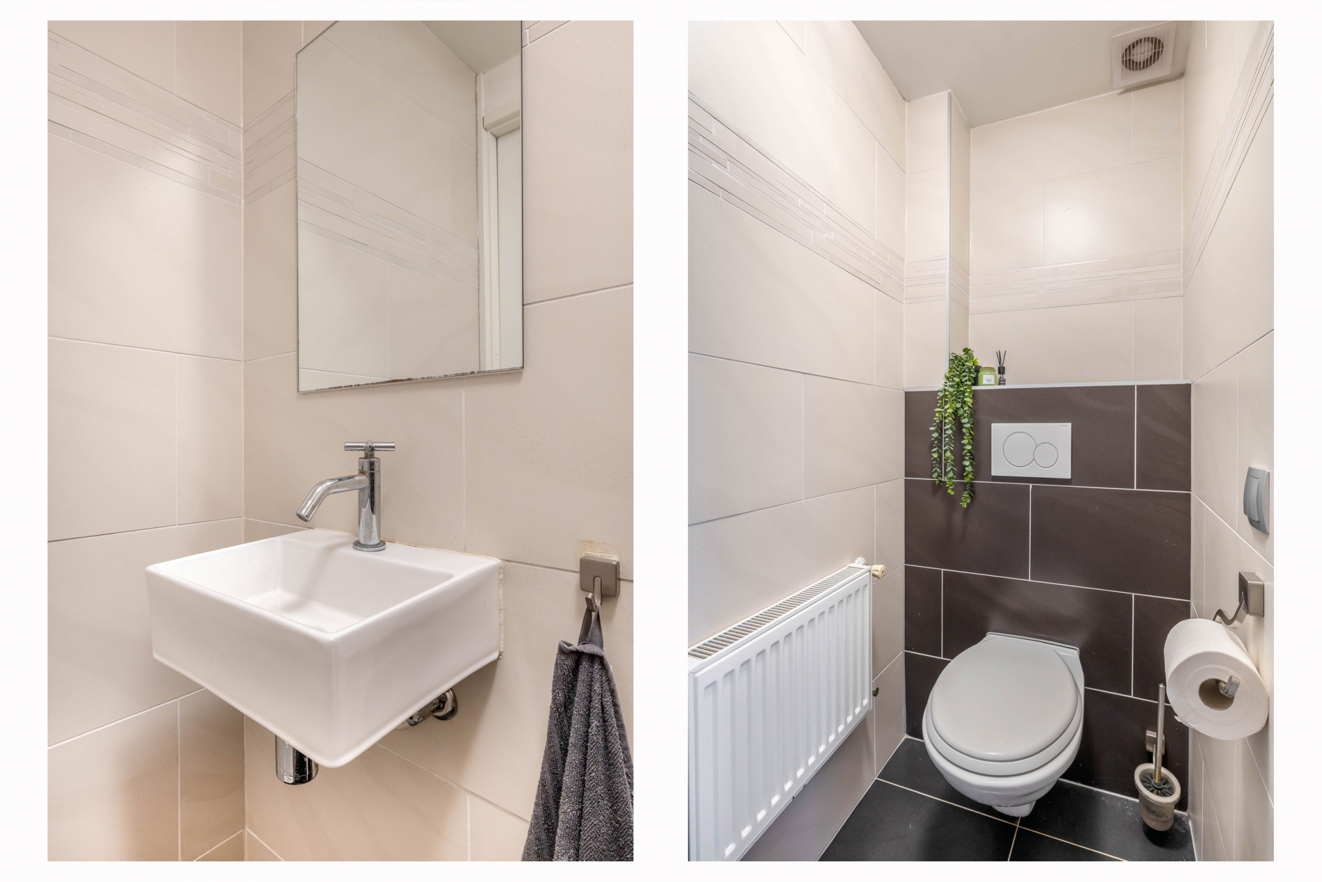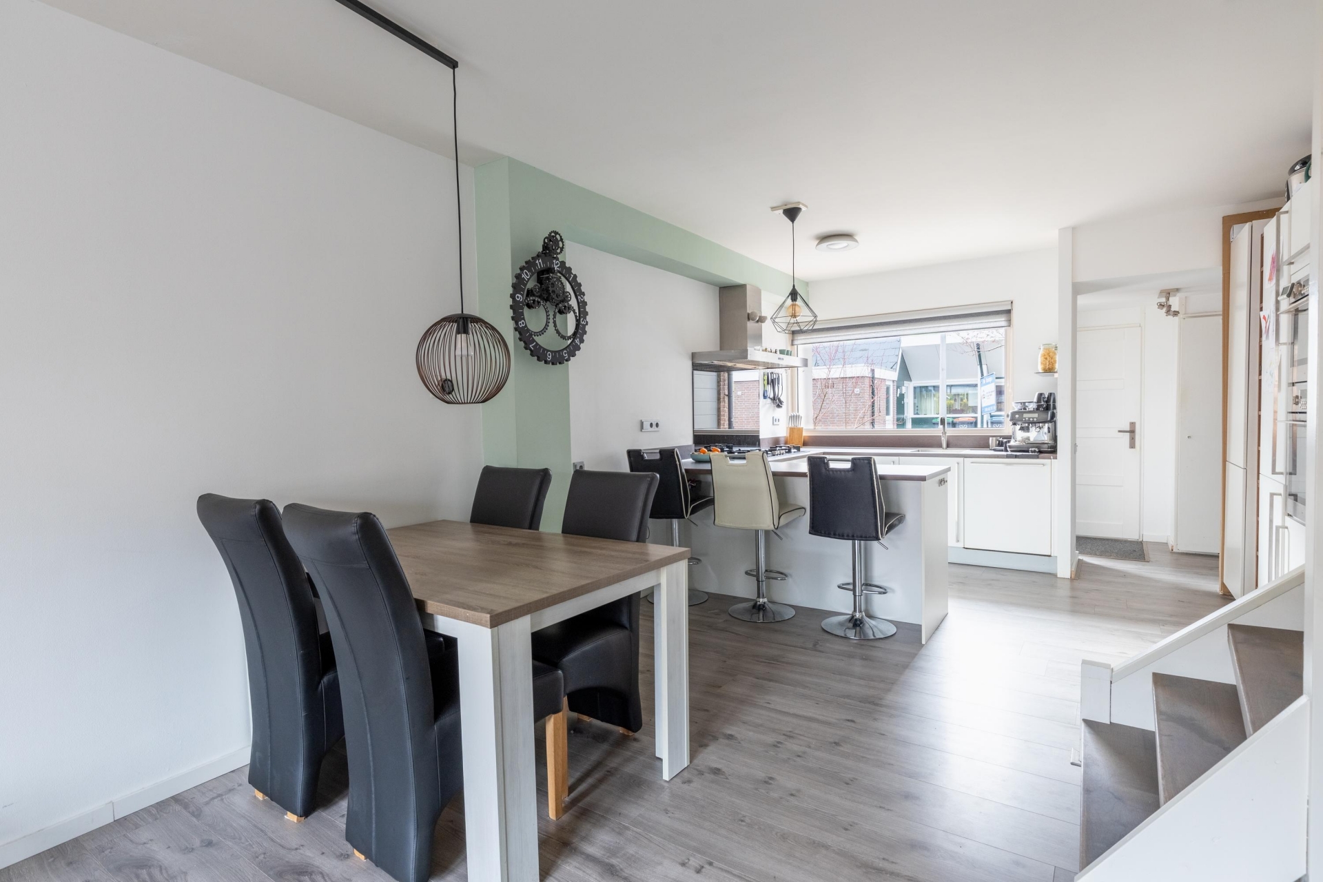 Entree, hal met vernieuwde meterkast en een modern betegeld toilet met hangcloset en fonteintje. Aan de voorzijde van de woning bevindt zich de gezellige en moderne keuken, uitgevoerd in een U-opstelling met kastenwand. De keuken is afgewerkt met witte kasten en een kunststof werkblad en voorzien van diverse inbouwapparatuur: een 4-pits gas-op-glas kookplaat, afzuigkap, vaatwasser, oven, magnetron en een koel-/vriescombinatie. Aan de keuken is een gezellig barretje gerealiseerd.