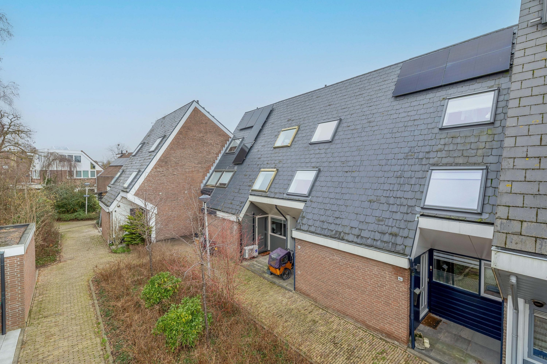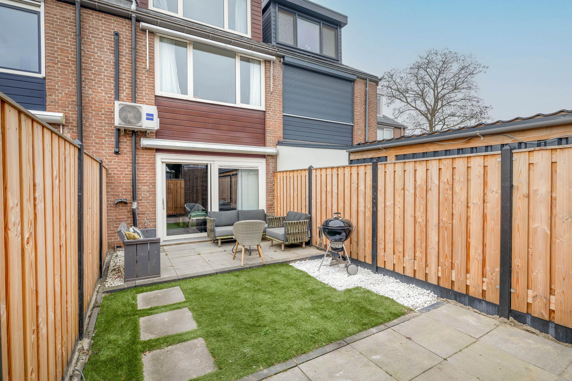 Aan de voorzijde ligt de woning aan een rustig, hofje uitzonderlijk voor bestemmingsverkeer, wat het bijzonder geschikt maakt voor gezinnen met kinderen. De achtertuin op het zuidoosten biedt de hele dag door volop zon en is onderhoudsarm aangelegd met recent vernieuwde houten schuttingen. Zowel op de begane grond als op de eerste verdieping zijn elektrische zonneschermen aanwezig.