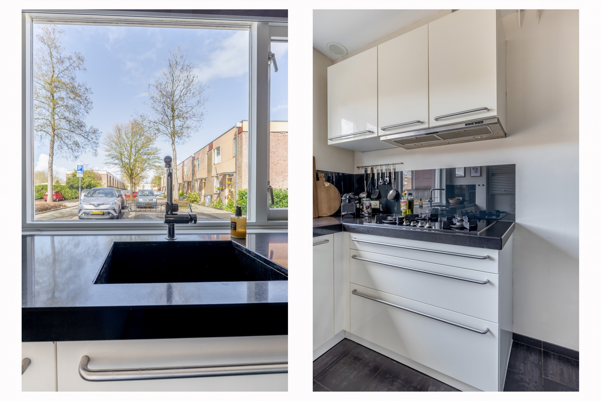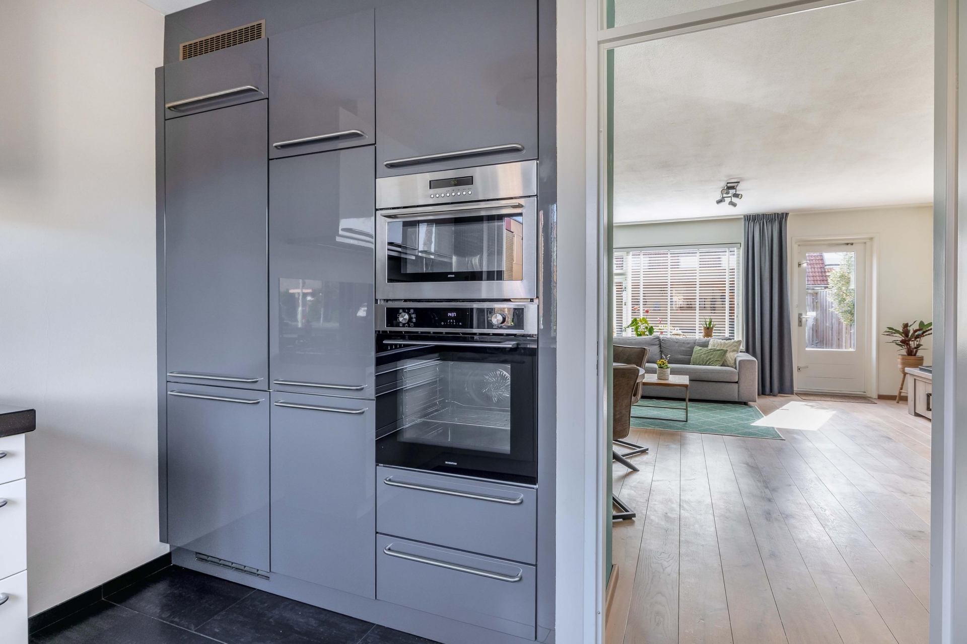 Aan de voorzijde van het huis ligt de dichte keuken. Deze is praktisch ingericht en voorzien van diverse inbouwapparatuur, waardoor je hier alles bij de hand hebt om lekker te koken. Het grote raam zorgt voor prettig lichtinval en een vrij uitzicht op de straat.