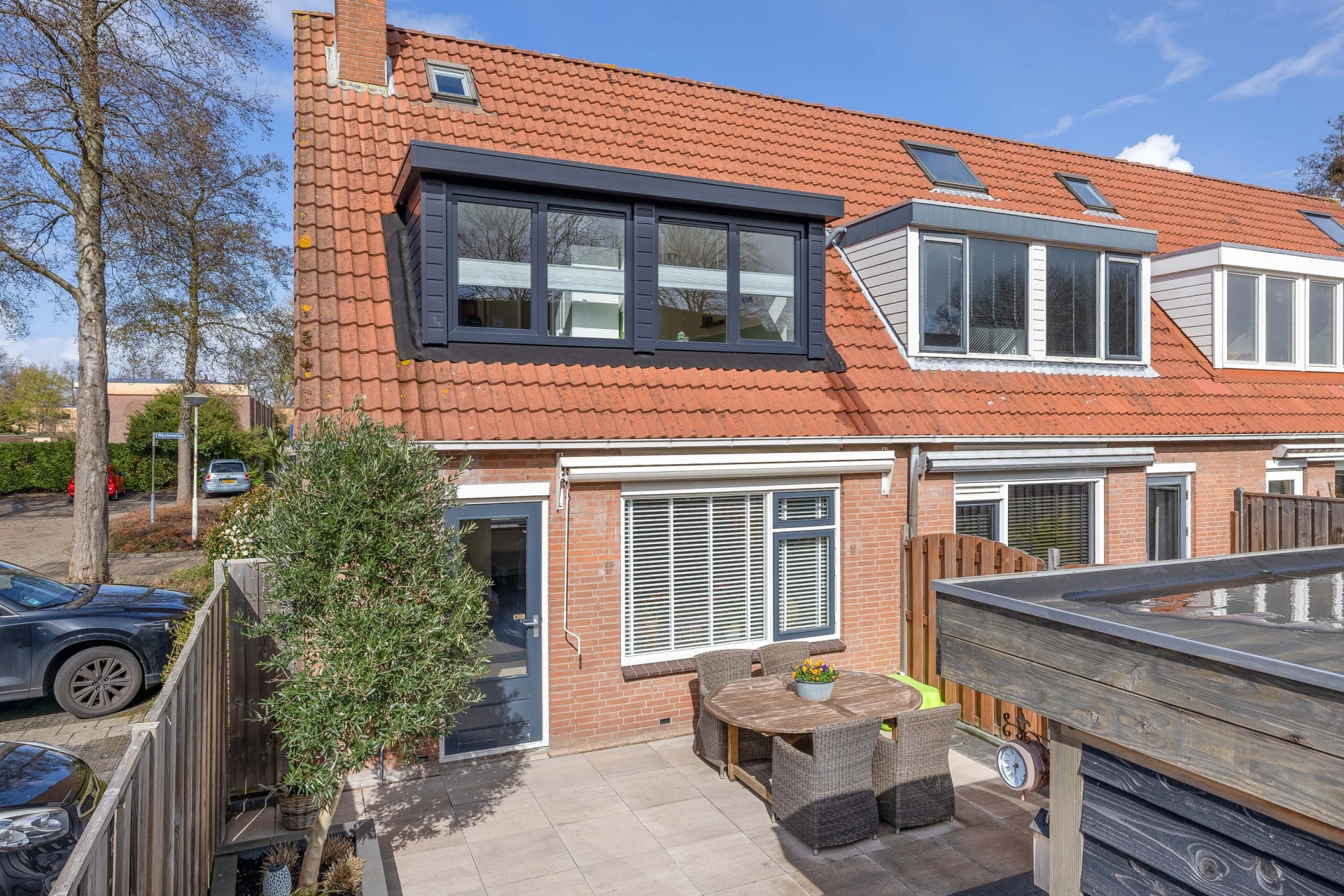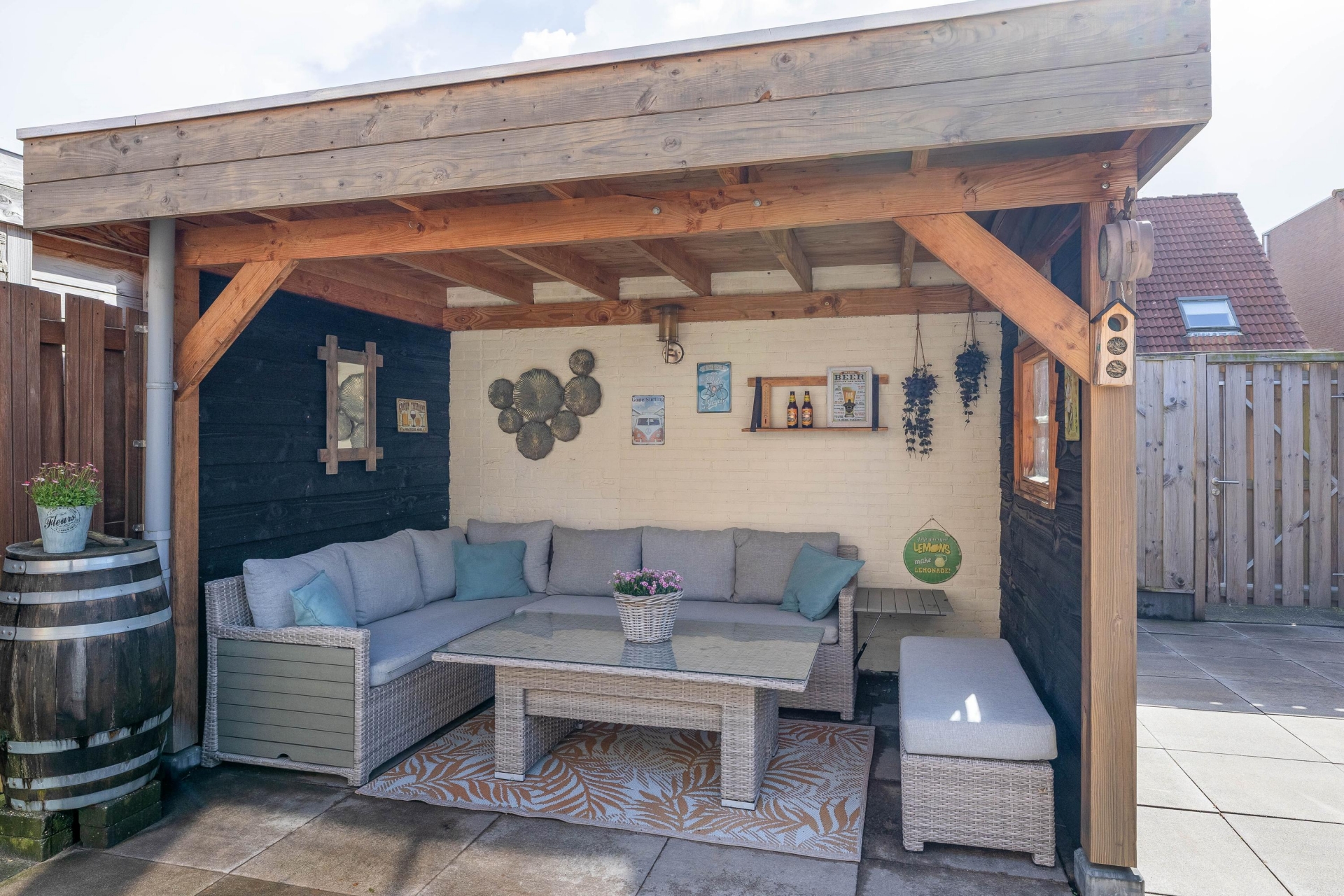 De sfeervolle terrasoverkapping springt direct in het oog. Dit is zo’n plek waar je al vroeg in het voorjaar en tot laat in het najaar comfortabel buiten zit. Of je nu met vrienden borrelt, een boek leest of gewoon even tot rust komt: hier wil je zijn. De combinatie van zon, beschutting en sfeer maakt dit een verlengstuk van je woonkamer.