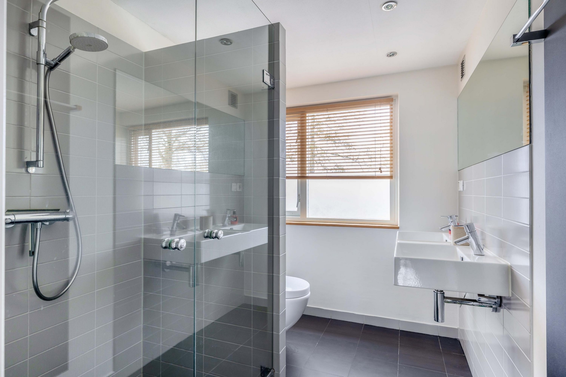 Op de eerste verdieping vind je drie slaapkamers, waarvan twee aan de achterzijde. Dankzij de dakkapel zijn juist deze kamers extra ruim en goed bruikbaar als volwaardige slaapkamers. De badkamer is netjes uitgevoerd en compleet ingericht met een inloopdouche, dubbele wastafel en een toilet. Alles wat je nodig hebt, overzichtelijk en comfortabel bij elkaar.