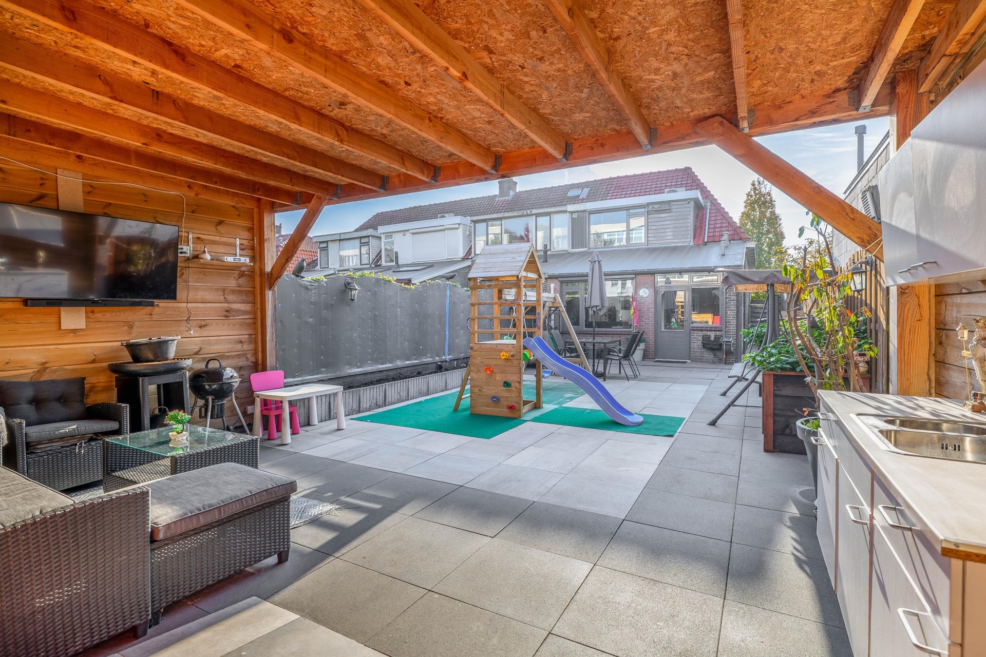 • Onderhoudsarme tuin met overkapping en riante berging