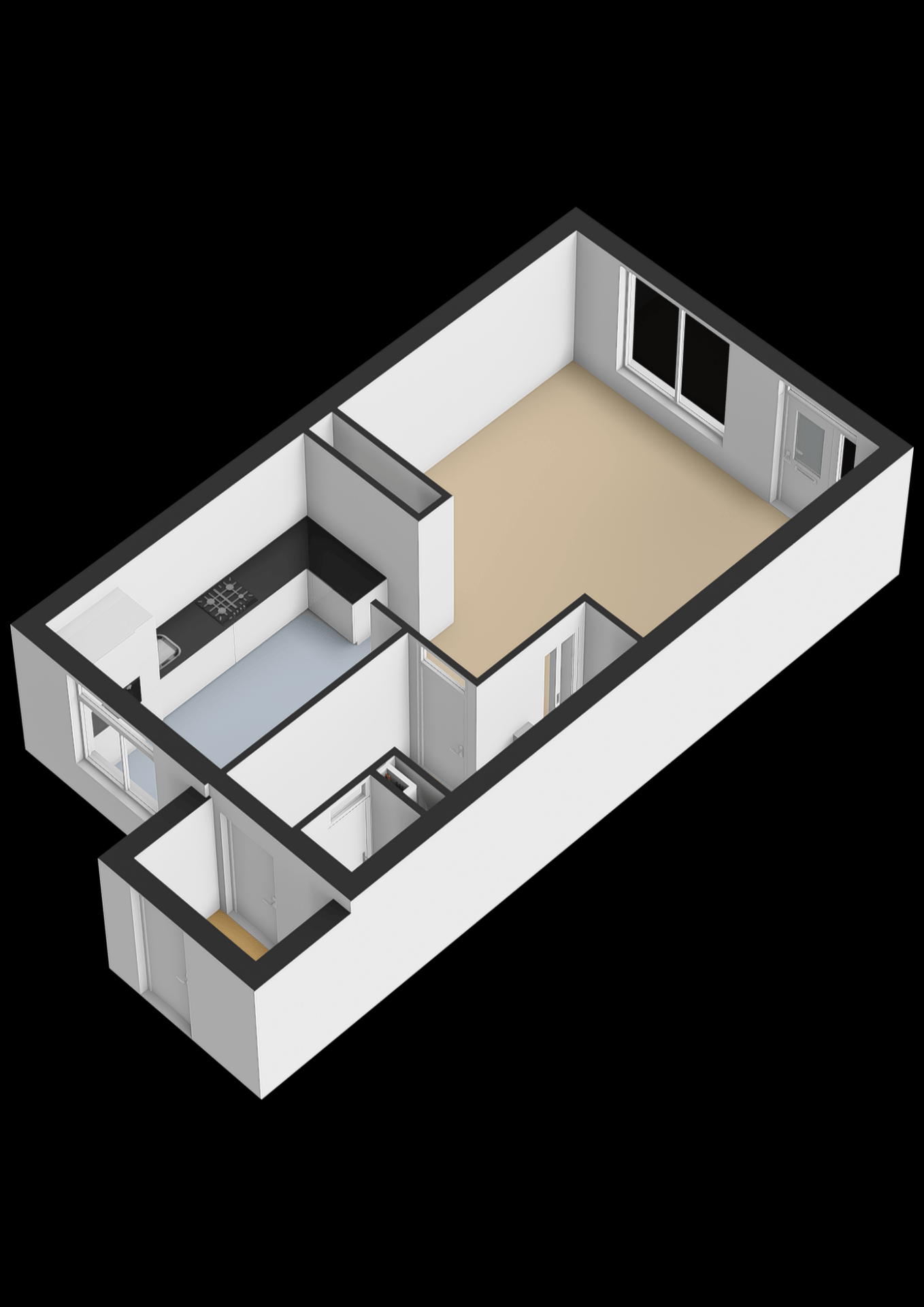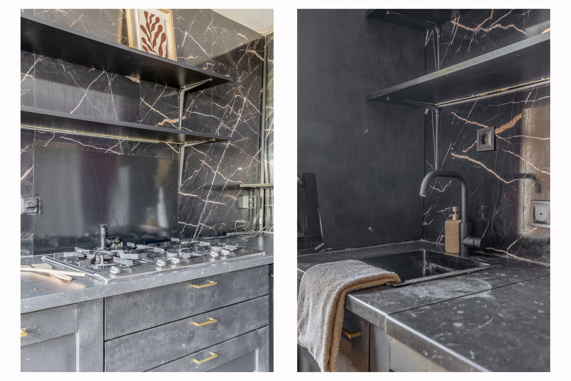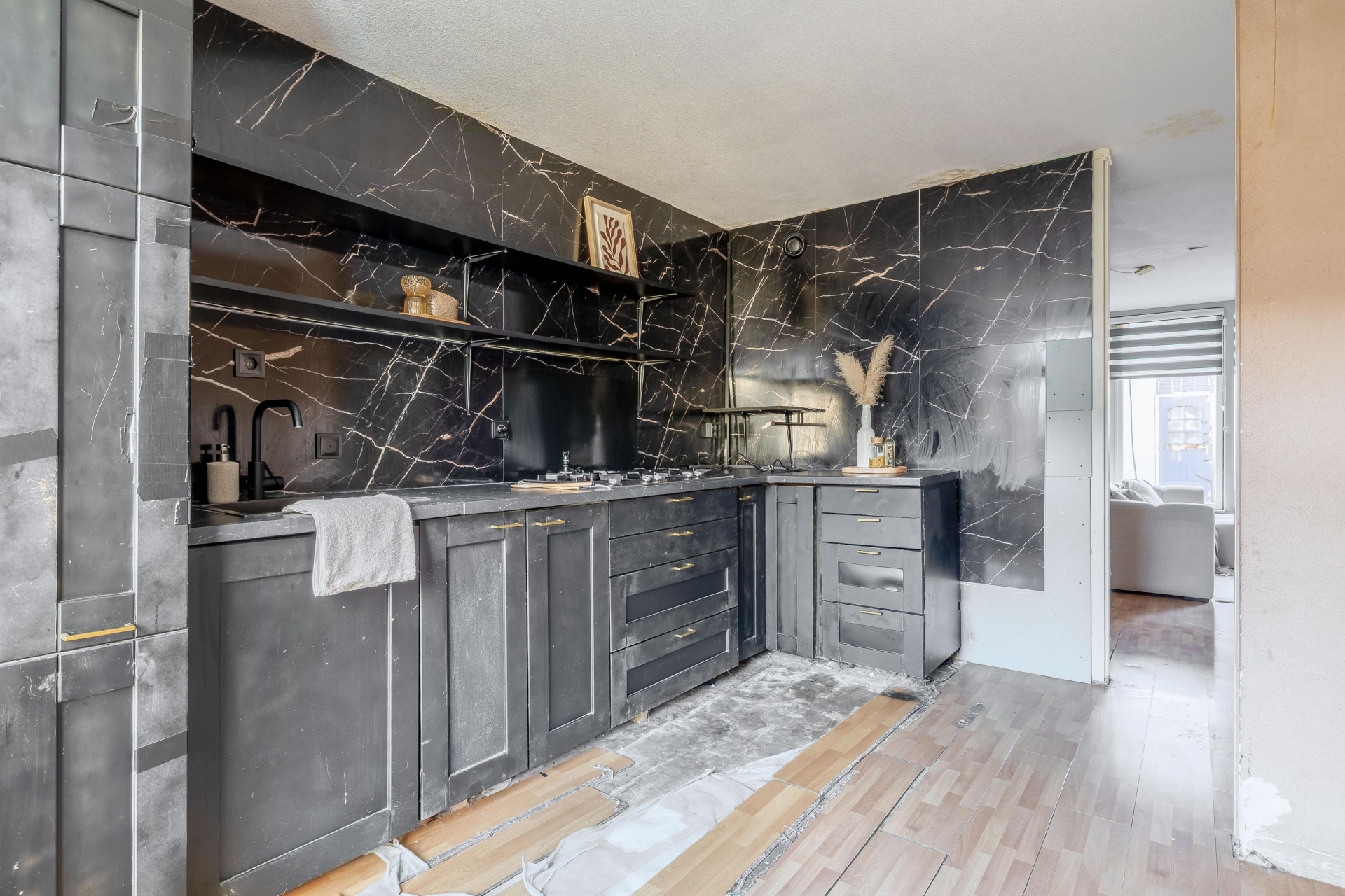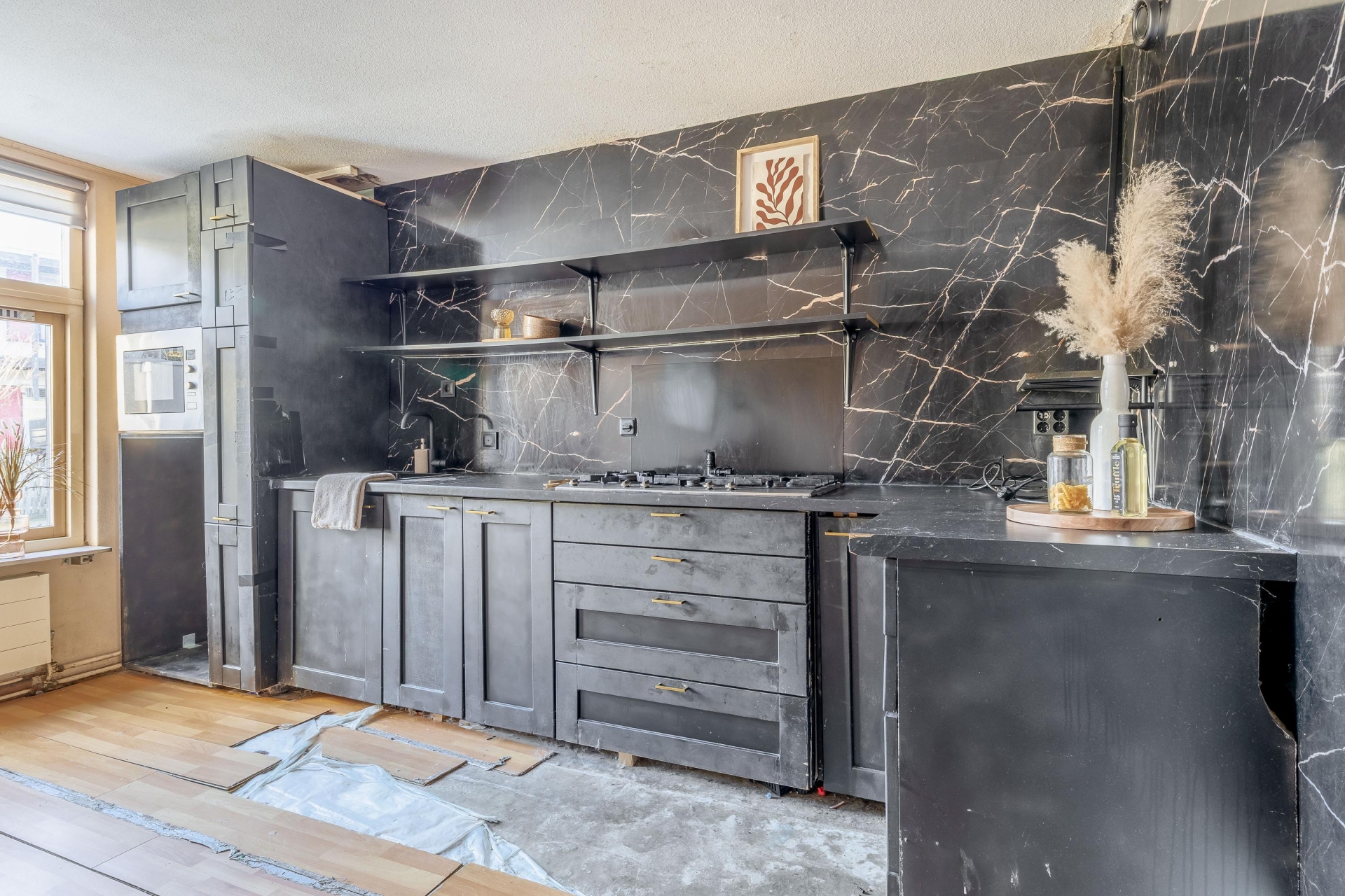 Aan de voorzijde van het huis bevindt zich de keuken, die meteen opvalt door de donkere kleurstelling en marmerlook achterwand. Deze combinatie geeft de ruimte een stoer en karaktervol uiterlijk. De open schappen bieden ruimte voor servies, kruiden of decoratie, en zorgen tegelijk voor een luchtige uitstraling. Er is al diverse inbouwapparatuur aanwezig, waaronder een gaskookplaat, oven en magnetron. Ook is er voldoende plek om extra apparatuur of opbergruimte toe te voegen. Hoewel de keuken qua afwerking nog wat aandacht kan gebruiken, vormt dit juist een mooie kans om de ruimte volledig naar eigen inzicht te moderniseren.