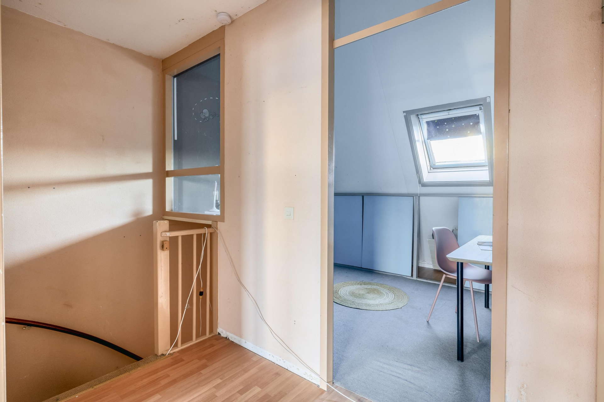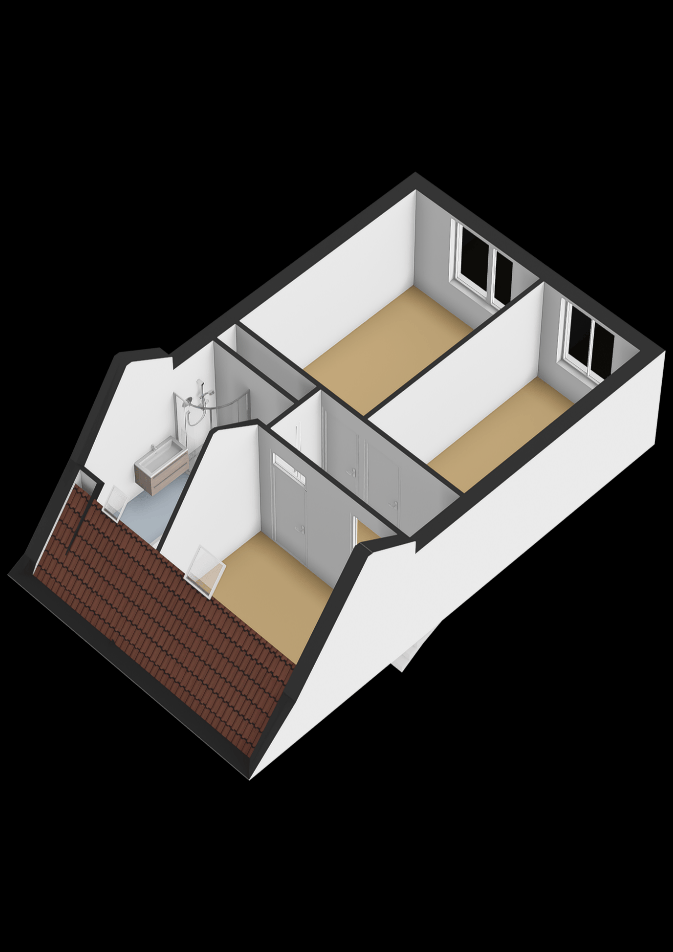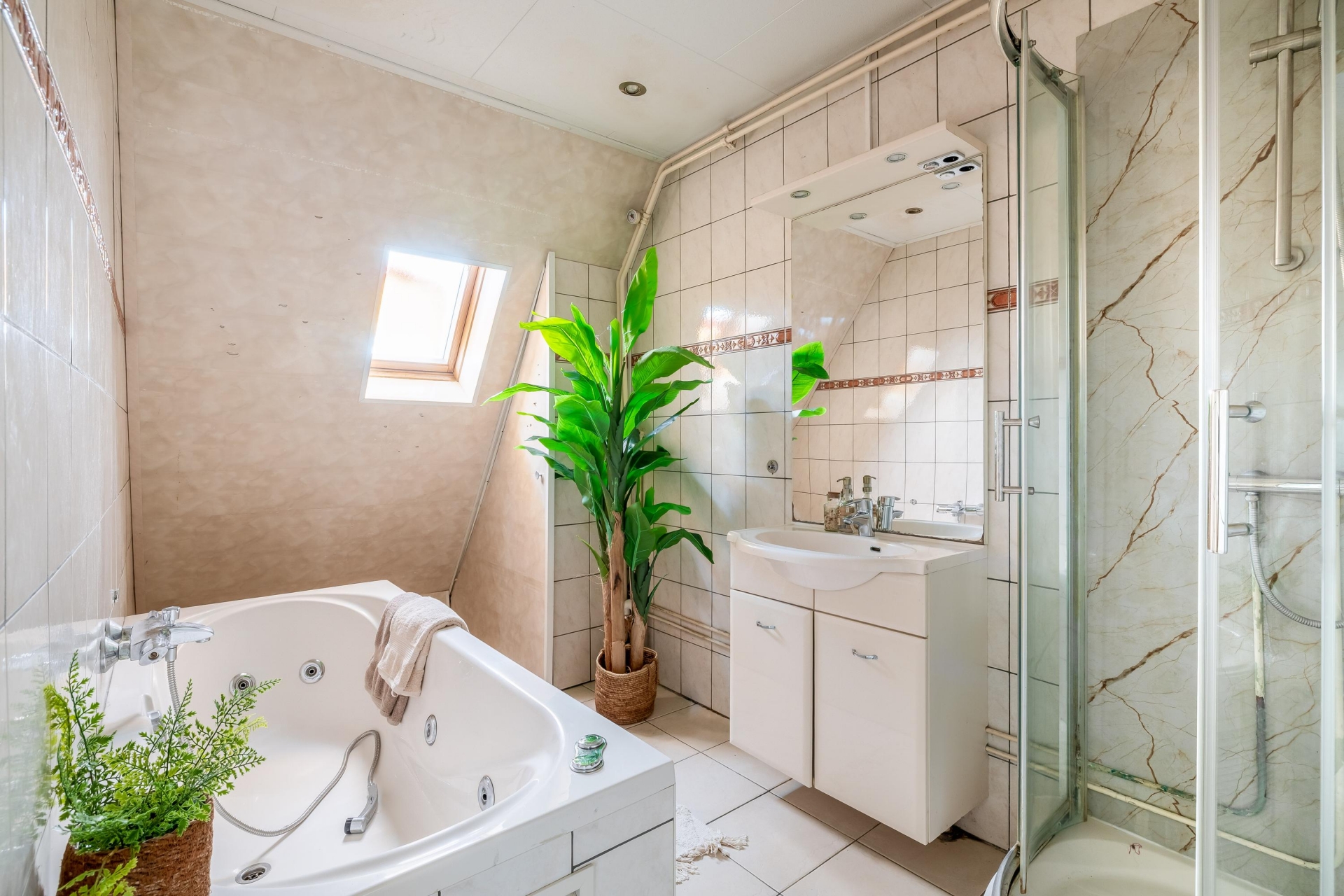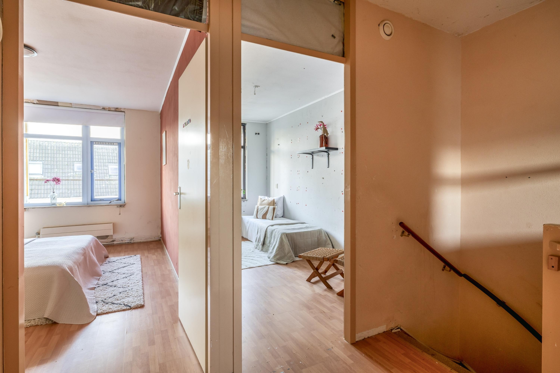 De eerste verdieping is overzichtelijk ingedeeld en telt drie slaapkamers, allemaal voorzien van rechte wanden waardoor de ruimte optimaal benut kan worden. De grootste slaapkamer ligt aan de achterzijde van de woning en biedt voldoende ruimte voor een tweepersoonsbed en een grote kledingkast. De twee andere slaapkamers zijn net zo functioneel in te delen: perfect als kinderkamer, logeerkamer of rustige werkplek. De badkamer is verrassend ruim en praktisch ingedeeld. Hier vind je zowel een douchecabine als een comfortabel ligbad met jets – ideaal voor wie na een lange dag even wil ontspannen. Het wastafelmeubel biedt opbergruimte voor toiletartikelen, en dankzij het dakraam valt er natuurlijk licht naar binnen en is goede ventilatie gegarandeerd.