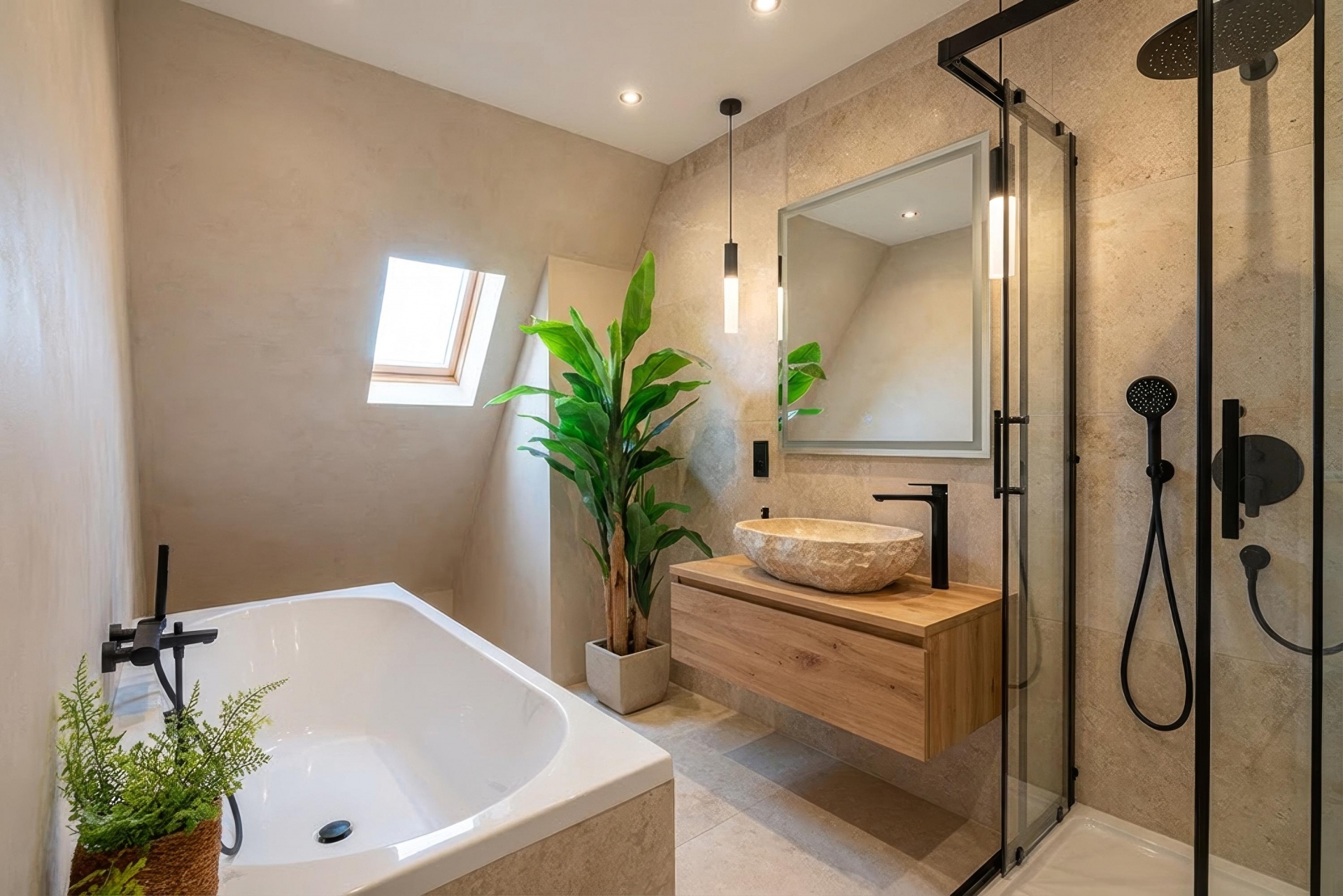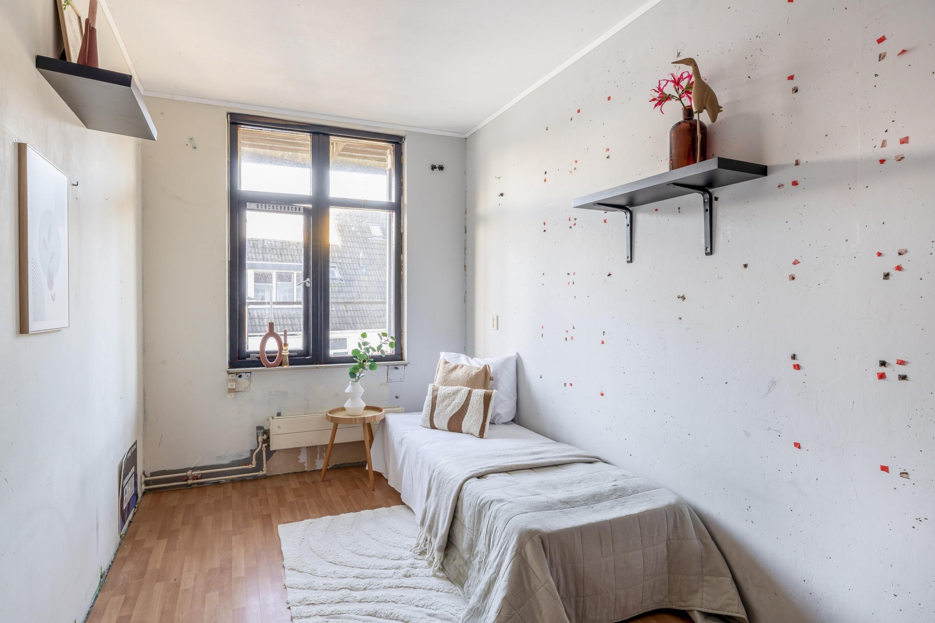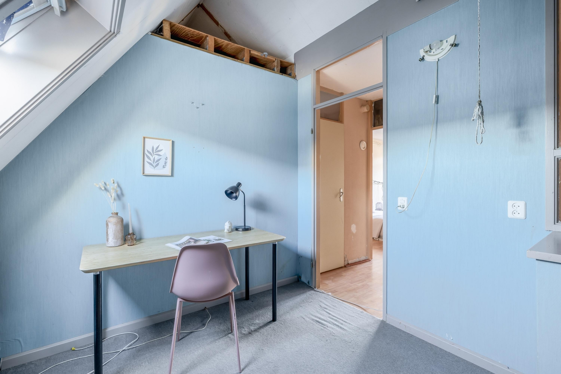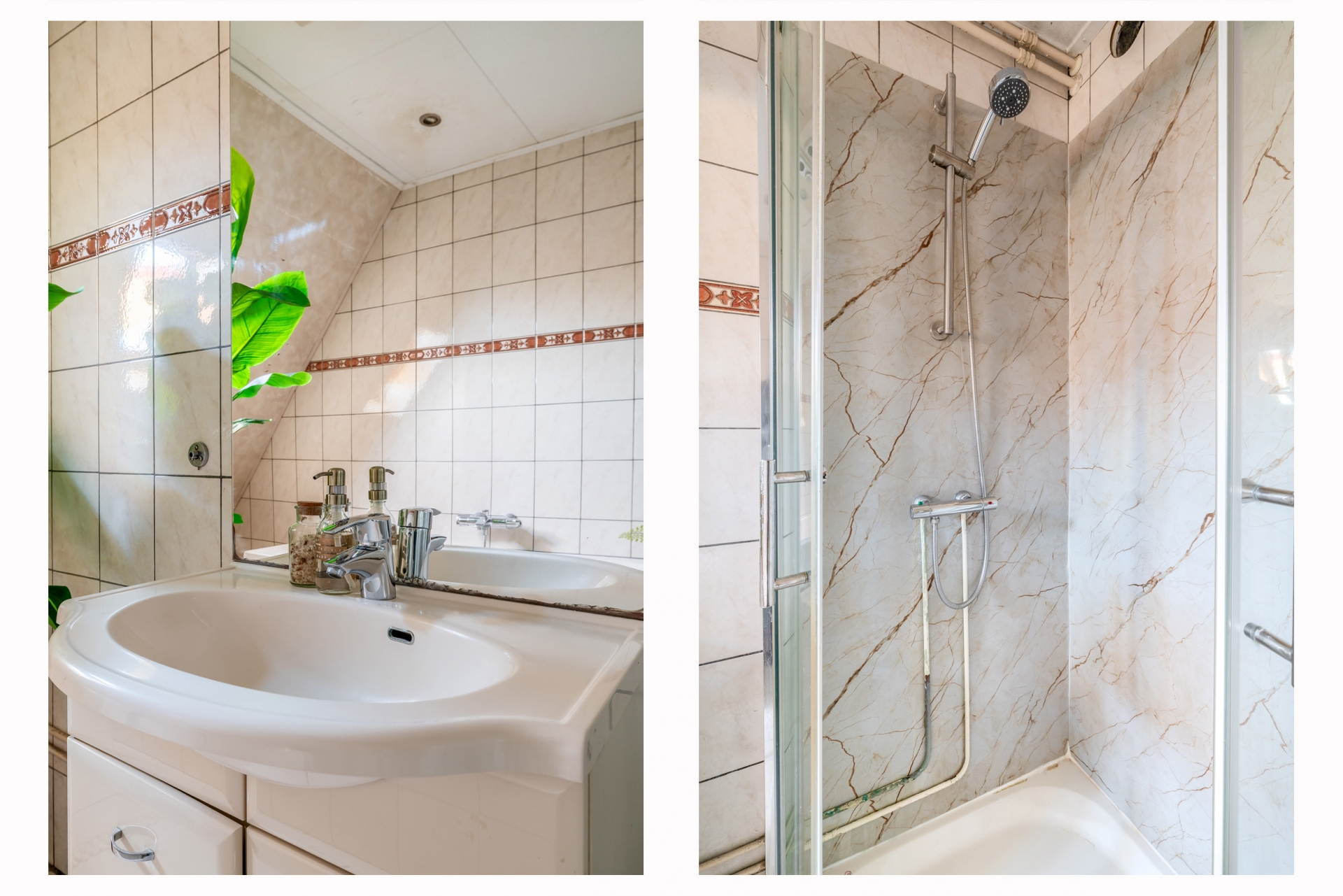 De eerste verdieping is overzichtelijk ingedeeld en telt drie slaapkamers, allemaal voorzien van rechte wanden waardoor de ruimte optimaal benut kan worden. De grootste slaapkamer ligt aan de achterzijde van de woning en biedt voldoende ruimte voor een tweepersoonsbed en een grote kledingkast. De twee andere slaapkamers zijn net zo functioneel in te delen: perfect als kinderkamer, logeerkamer of rustige werkplek. De badkamer is verrassend ruim en praktisch ingedeeld. Hier vind je zowel een douchecabine als een comfortabel ligbad met jets – ideaal voor wie na een lange dag even wil ontspannen. Het wastafelmeubel biedt opbergruimte voor toiletartikelen, en dankzij het dakraam valt er natuurlijk licht naar binnen en is goede ventilatie gegarandeerd.