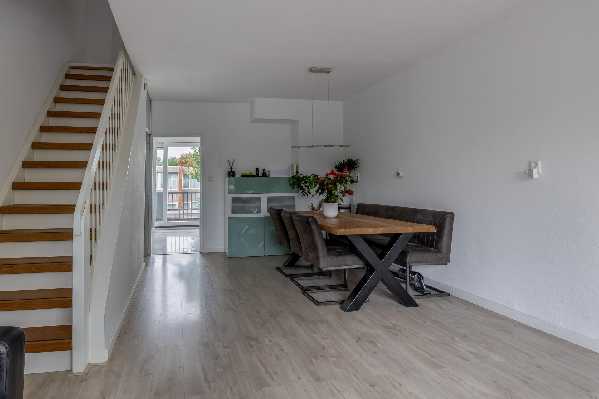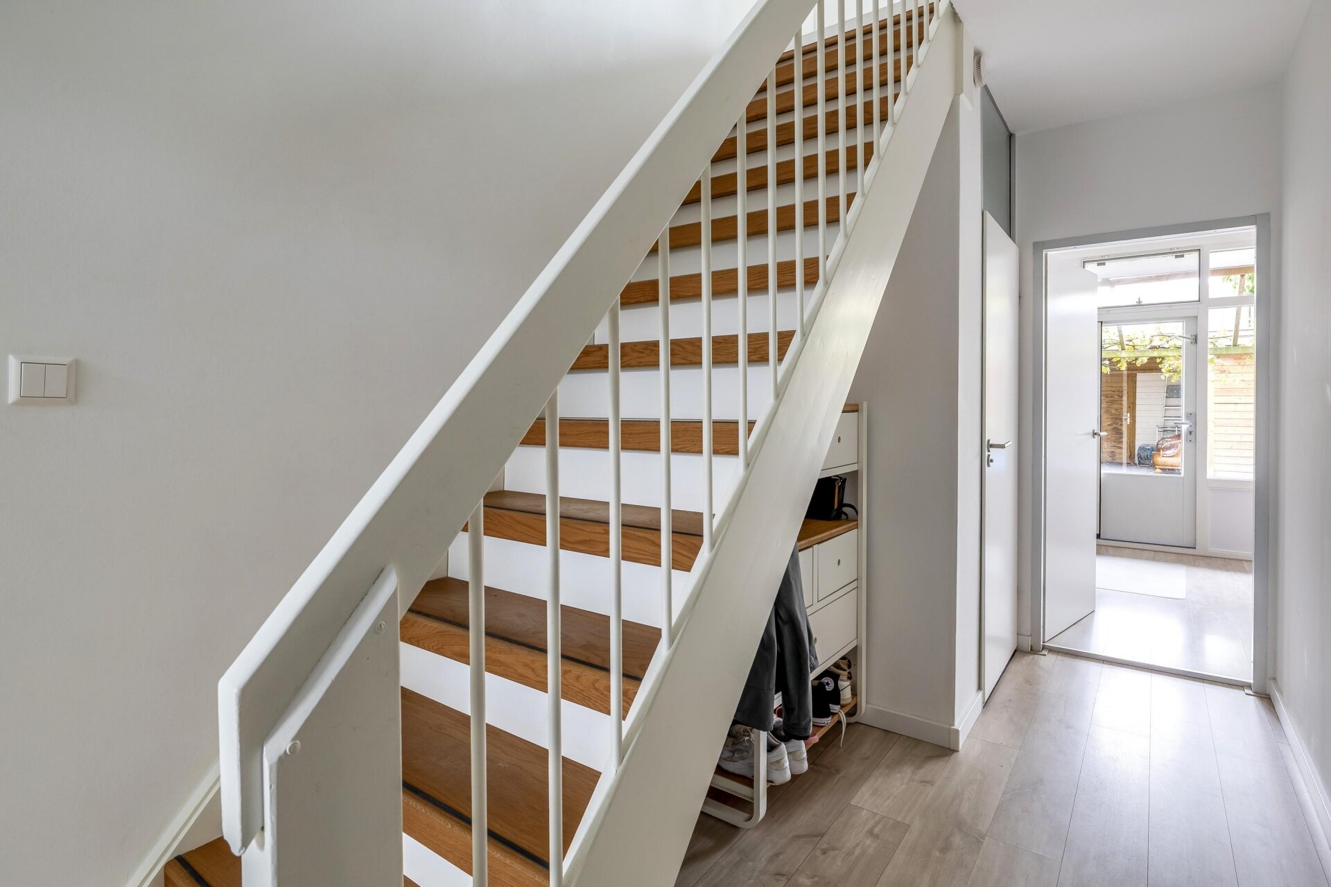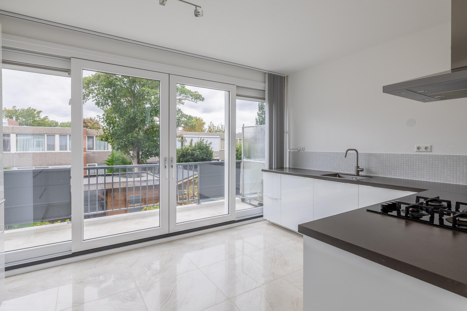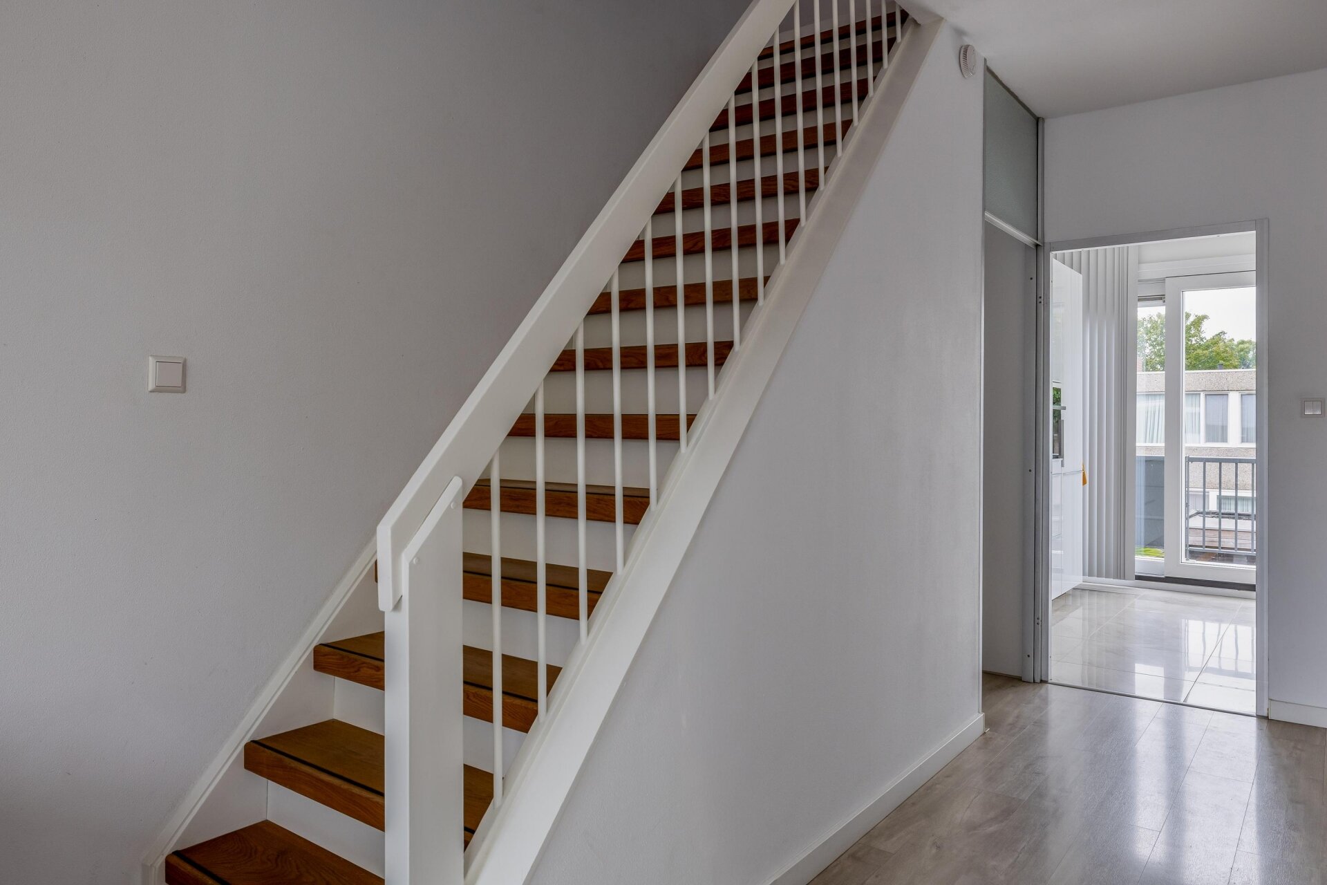 Op de eerste verdieping valt meteen de hoeveelheid licht op. Aan de voorzijde bevindt zich de royale woonkamer met groot raam en prettig uitzicht over de rustige straat. De strakke afwerking, lichte wanden en moderne vloer zorgen voor een rustige basis waarin je alle kanten op kunt met je eigen stijl. Aan de achterzijde ligt de keuken, voorzien van modern wit keukenblok met donker werkblad, een gaskookplaat en veel werkruimte. Via de schuifpui stap je zo het balkon op: een heerlijke plek om met een kop koffie of een goed glas wijn van de buitenlucht te genieten.