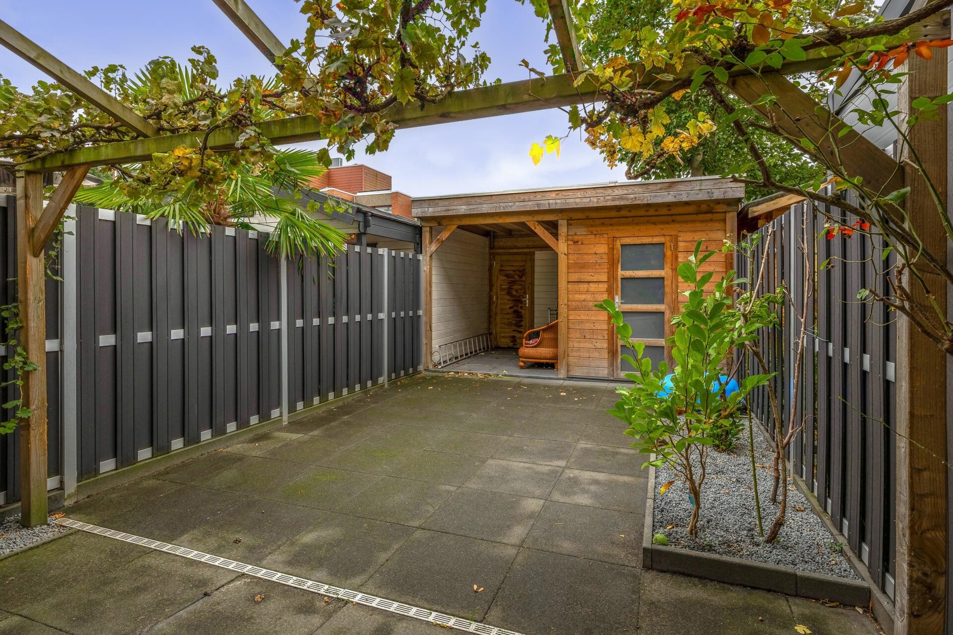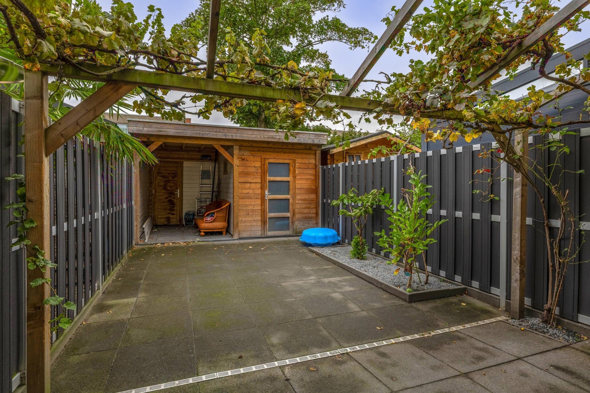 - Ruime achtertuin met houtenoverkapping en bergruimte;
